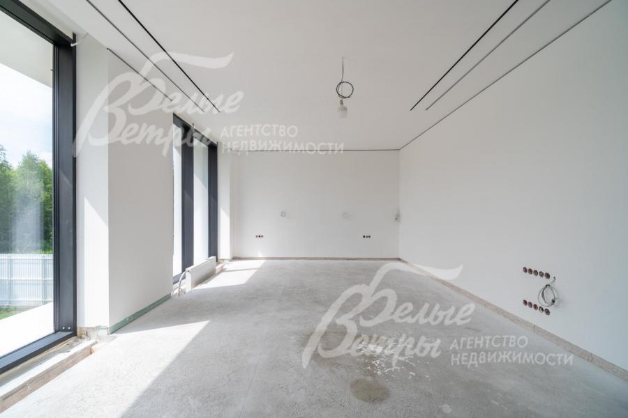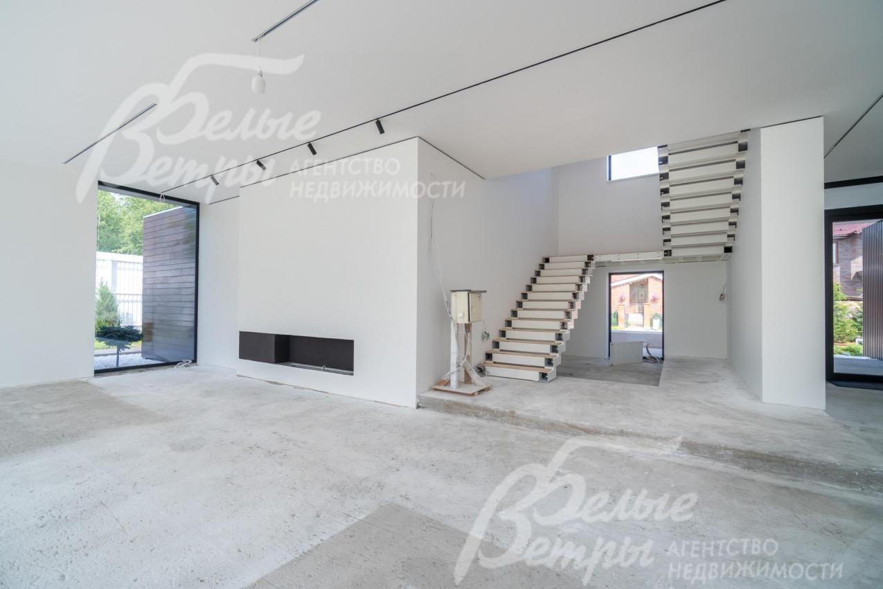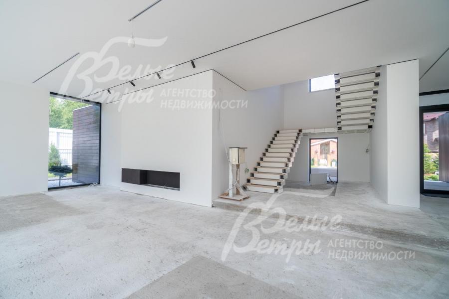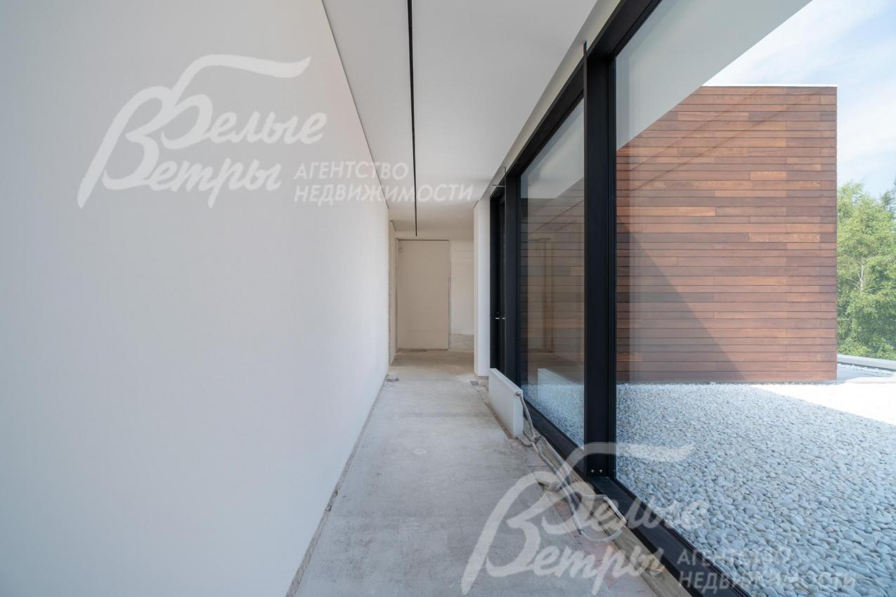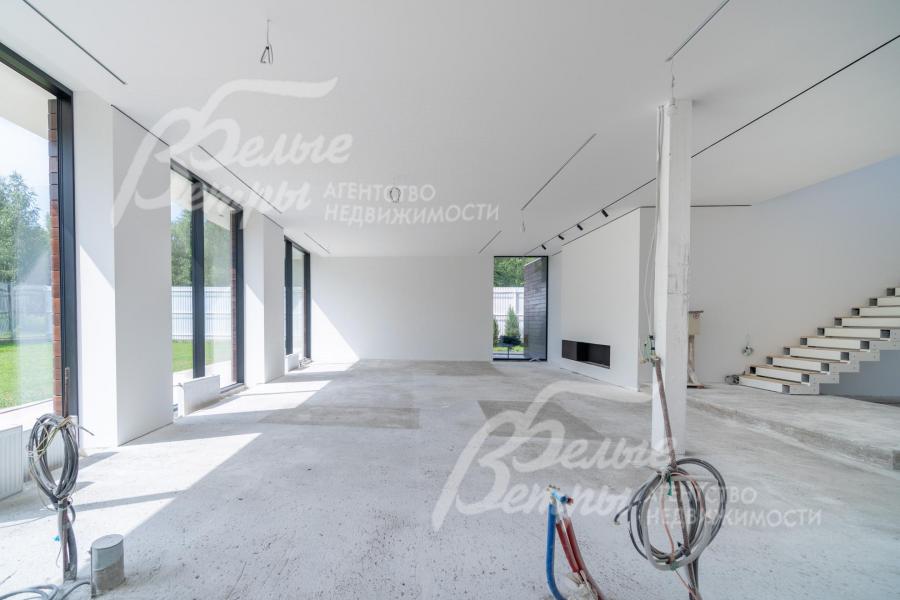 Описание внутренней отделки: дом готов к финишной отделке (White Box): стены возведены, оштукатурены и прошпаклеваны, установлена система централизованной вентиляции с кондиционированием. Есть биокамин. На второй этаж ведёт лестница из стали, запланировано стеклянное ограждение (сделаны закладные). Санузлы оснащены инсталляционными системами и смесителями, в том числе скрытыми душевыми системами. Предусмотрены двери до потолка