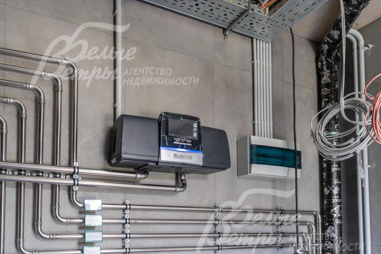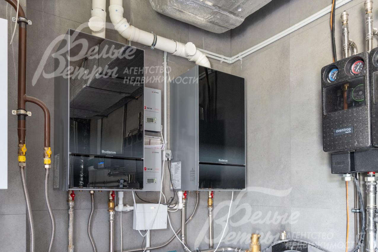 Инженерное обеспечение: все коммуникации разведены до точек (электричество, отопление, тёплые полы, «Умный дом»). Отопление - через 2 котла Buderus на 63 кВт, также есть резервный электрический котёл Baxi. Горячее водоснабжение – через накопительный бойлер на 500 литров. Установлена грубая и тонкая система очистки воды. В доме – принудительная центральная приточно-вытяжная вентиляция Toshiba с рекуперацией, преднагревом (от газового котла) и кондиционированием, приточно-вытяжные установки с системой зимнего подогрева и управлением по Wi-Fi. Системы полностью смонтированы, готовы к запуску (на гарантии). Выполнены закладные под все охранные системы, есть система видеонаблюдения с датчиками движения и тепла. Интегрирована система «Умный дом» на базе одного из ведущих международных стандартов KNX