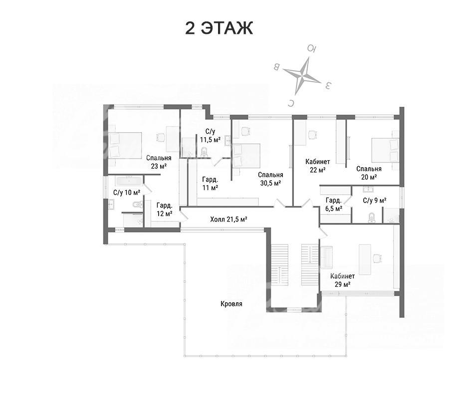 2-ой этаж: холл 21,5 кв.м, спальня 23 кв.м с гардеробной 12 кв.м и санузлом 10,5 кв.м, спальня 30,5 кв.м с гардеробной 11 кв.м и санузлом 11,5 кв.м, спальня 20 кв.м с кабинетом 22 кв.м, гардеробной 6,5 кв.м и санузлом 9 кв.м, кабинет 29 кв.м