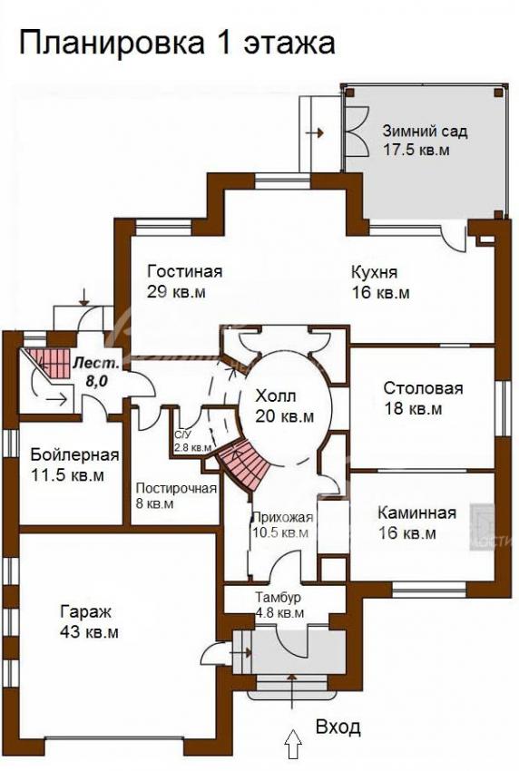 1-ый этаж: свободная планировка, высота потолков 3.78. Предлагается вариант планировки: тамбур 5 кв.м, прихожая 11 кв.м, холл 20 кв.м с с/у 3 кв.м, столовая 18 кв.м, гостиная 29 кв.м, кухня с выходом на террасу/зимний сад 18 кв.м, каминная 16 кв.м, постирочная 8 кв.м, бойлерная 12 кв.м, гараж 43 кв.м