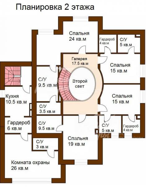 2-ой этаж: свободная планировка, высота потолков от 3.2 м до 5.4 м в коньке и до 4.36 м в жилых помещениях. Предлагается вариант планировки: галерея 18 кв.м со вторым светом, спальня 24 кв.м с с/у 10 кв.м и с гардеробной 4 кв.м, спальня 15 кв.м с с/у 5 кв.м и с гардеробной 5 кв.м, спальня 15 кв.м с с/у 5 кв.м и с гардеробной 4 кв.м, спальня 19 кв.м с с/у 10 кв.м. Блок для персонала с отдельным входом над гаражом: комната охраны 26 кв.м с с/у 3 кв.м, кухня 11 кв.м, гардеробная 6 кв.м