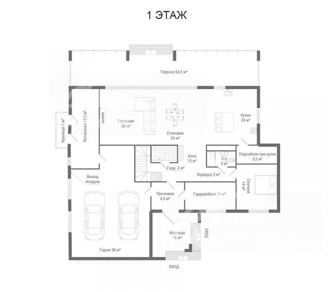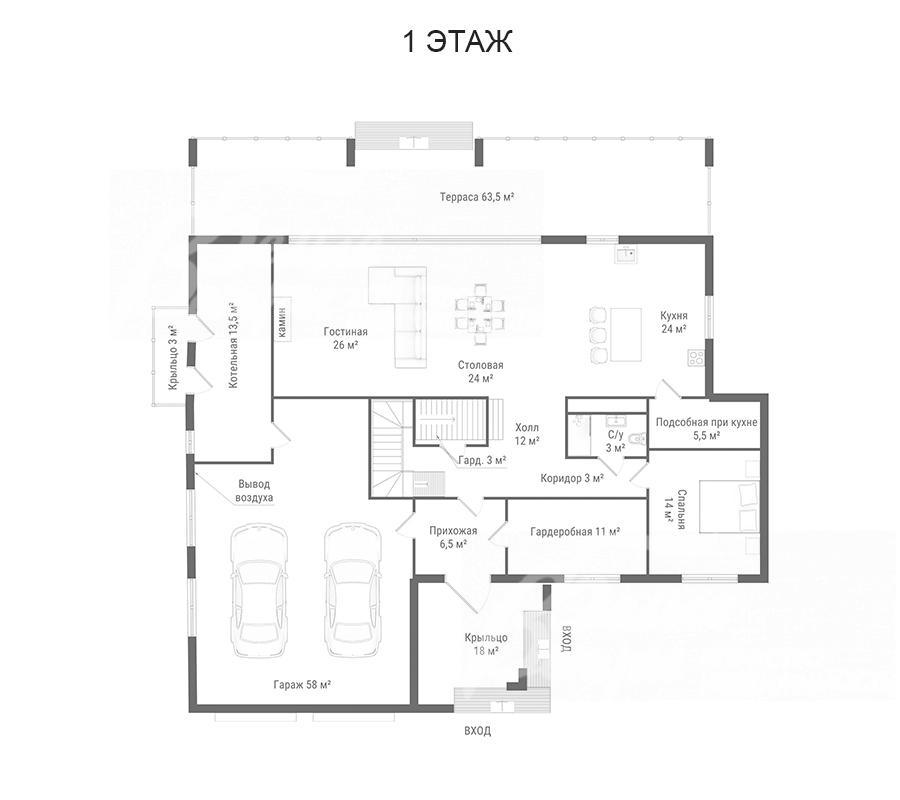 1-ый этаж: крыльцо 18, кв.м, прихожая 6,5 кв.м, холл 20 кв.м, кухня 24 кв.м, столовая 24 кв.м, гостиная 26 кв.м с выходом на крытую террасу 63,5 кв.м, спальня 14 кв.м, коридор 3 кв.м, санузел 3 кв.м, гардеробная 11 кв.м, гардеробная 3 кв.м, подсобная при кухне 6,5 кв.м, котельная 13,5 кв.м, крыльцо 3 кв.м, гараж 58 кв.м