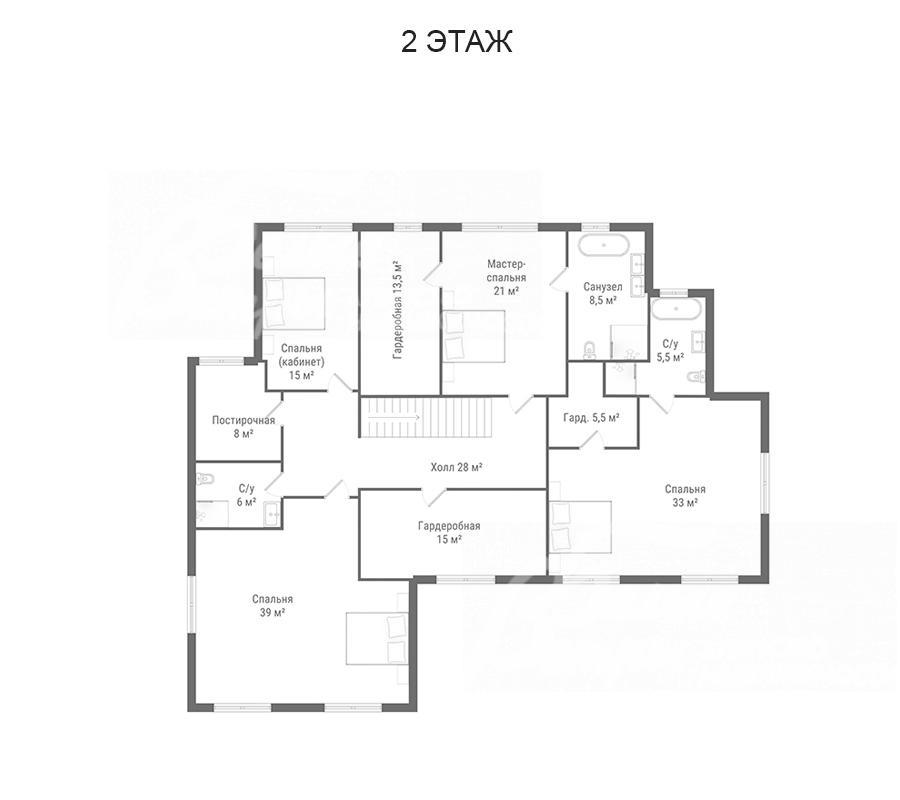 2-ой этаж: холл 28 кв.м, мастер-спальня 21 кв.м с гардеробной 13,5 кв.м и санузлом 8,5 кв.м, спальня 33 кв.м с гардеробной 5,5 кв.м и санузлом 5,5 кв.м, спальня 39 кв.м, спальня (кабинет) 15 кв.м, гардеробная 15 кв.м, постирочная 8 кв.м, санузел 6 кв.м