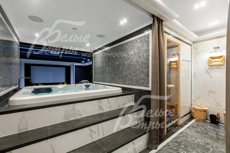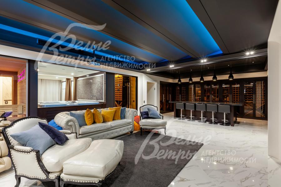 Опции: бассейн (уличный открытый с подогревом, размерами 11х3.6 м); сауна (СПА-зона с джакузи и бочкой); квартира для персонала (2 спальни); терраса (+ 2 балкона); камин; машиномест крытых: 4, в т.ч. в теплом гараже: 2; винотека, бар, кинотеатр, второй свет, панорамные окна, парковка на 5-6 авто.
