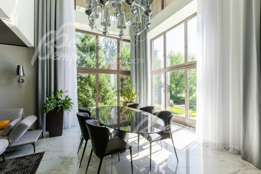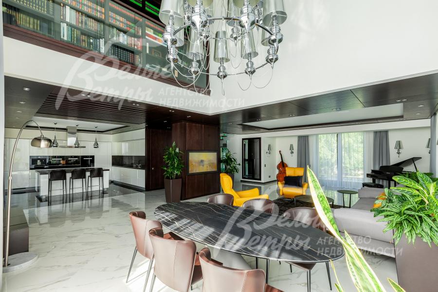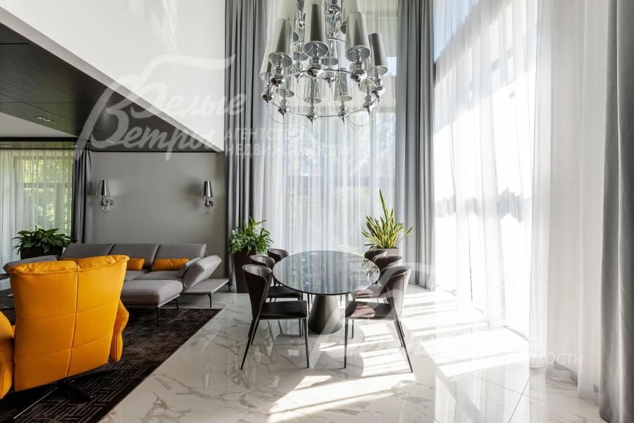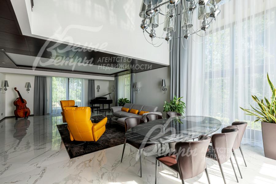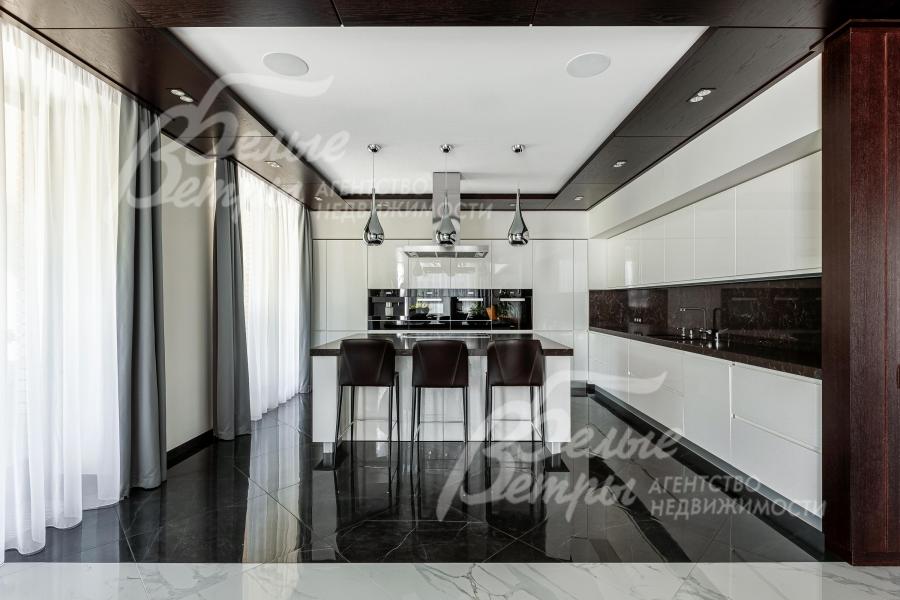 Мебель, оборудование: дом полностью укомплектован стильной дизайнерской мебелью. Современный кухонный гарнитур белого цвета с глянцевыми фасадами со встроенной техникой Miele - духовой шкаф, варочная поверхность, посудомоечная машина, вытяжка, холодильник. Акустическая система Bowers&Wilkins. Везде дизайнерские люстры, светильники, шторы.