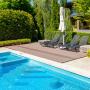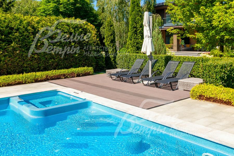 Благоустройство участка: на участке выполнен первоклассный ландшафтный дизайн: высажены молодые березы, ели, различные декоративные кустарники, организовано освещение, газон, дорожки, дренаж. Зона отдыха у бассейна выложена плиткой.