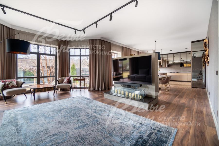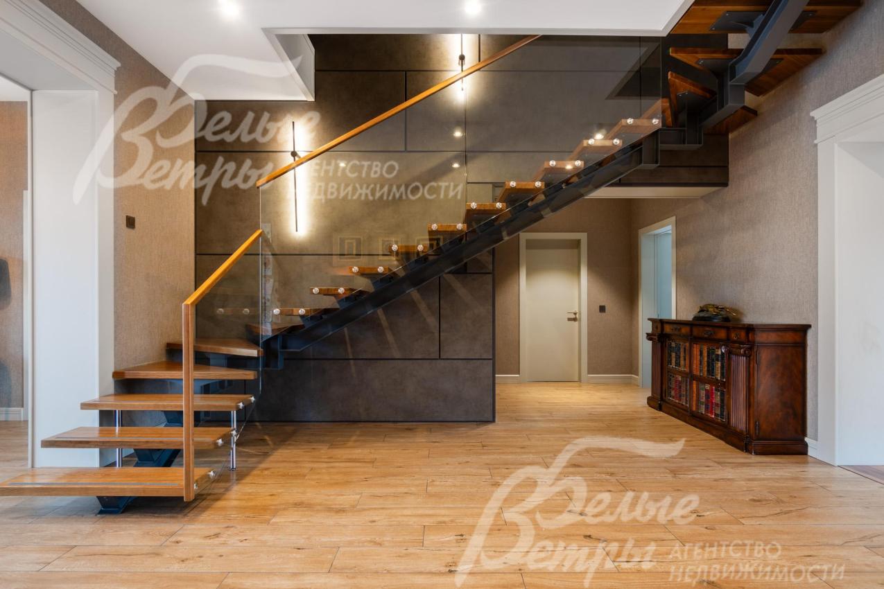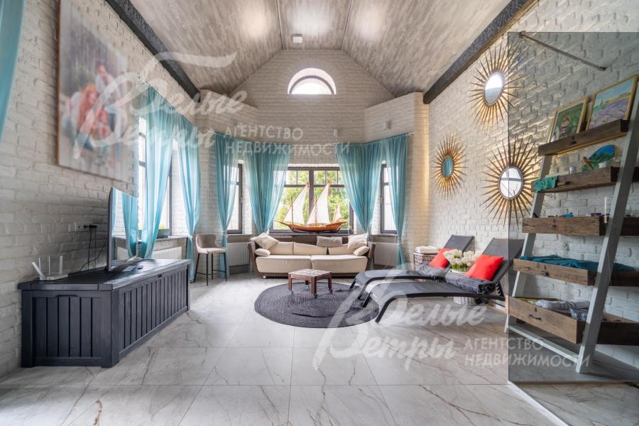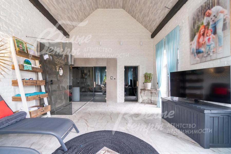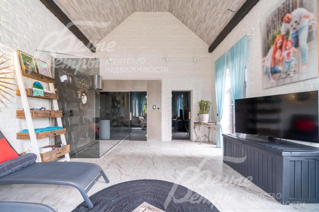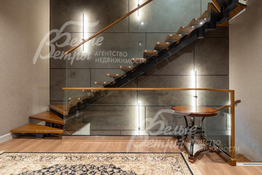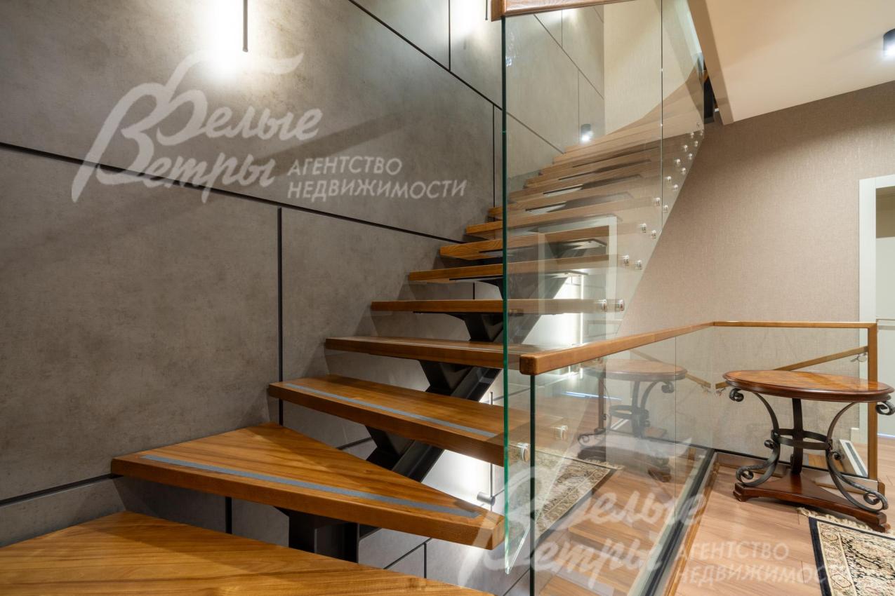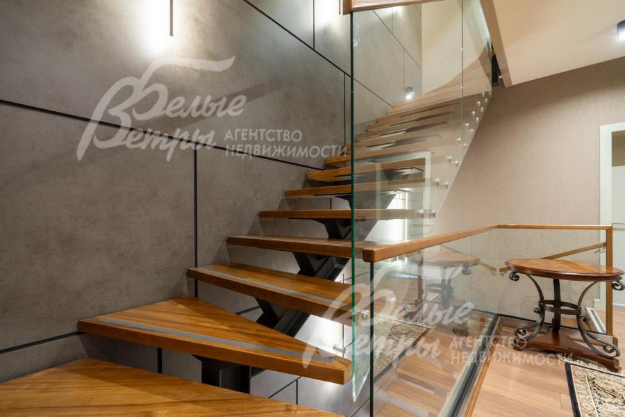 Описание внутренней отделки: в доме выполнена дорогостоящая отделка: на стенах — обои из рулонного флизелина и дизайнерские ламинированные панели Egger; полы оформлены испанским керамогранитом с водяным подогревом и французской инженерной доской. Установлены два биокамина. В спа‑зоне находится хамам (Tylo) в стиле лофт, отделанный мозаикой, керамогранитом и стеклом. Межкомнатные двери – премиум‑класса производителя «Волховец» из древесины дуба и МДФ с немецкой фурнитурой. Входная дверь выполнена из лиственницы, ступени — из керамогранита Villeroy & Boch. Установлены немецкие радиаторы Zender, подоконники из литого мрамора. На второй этаж ведёт лестница с элементами из металла, стекла и дуба. На террасе уложено покрытие из массива лиственницы