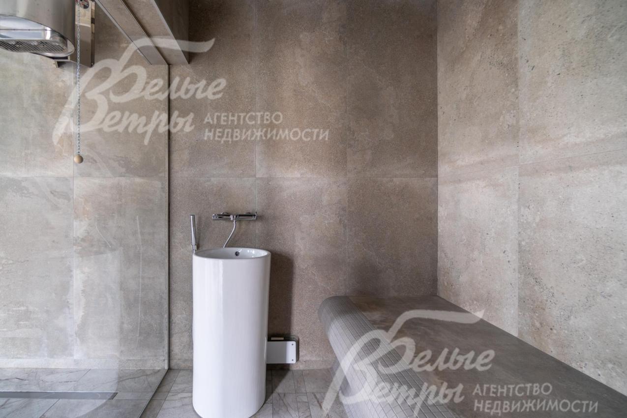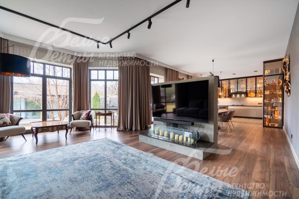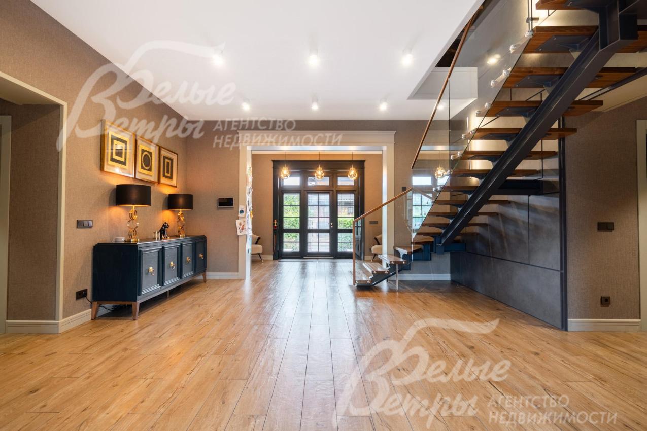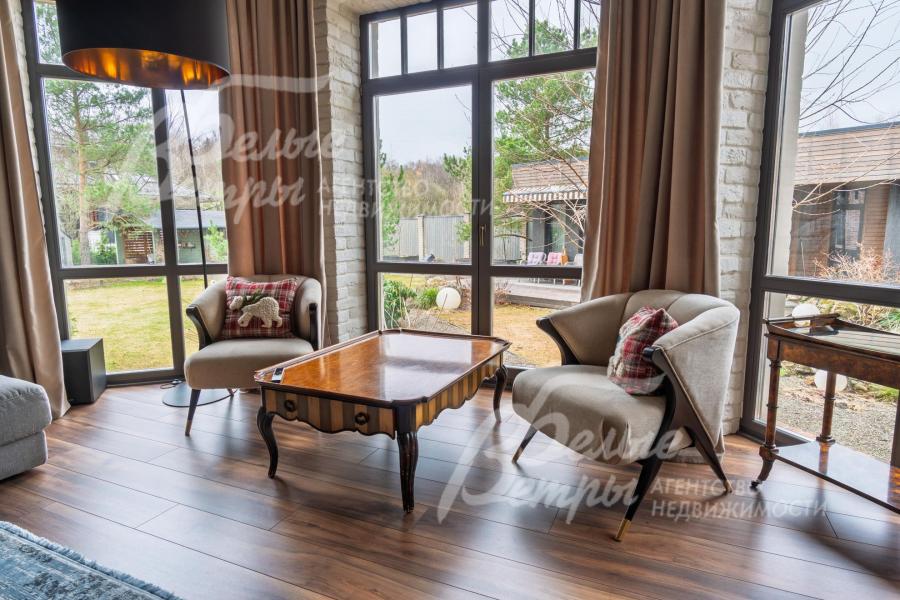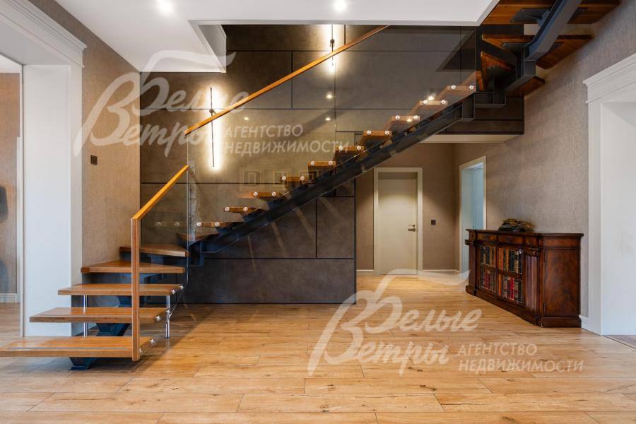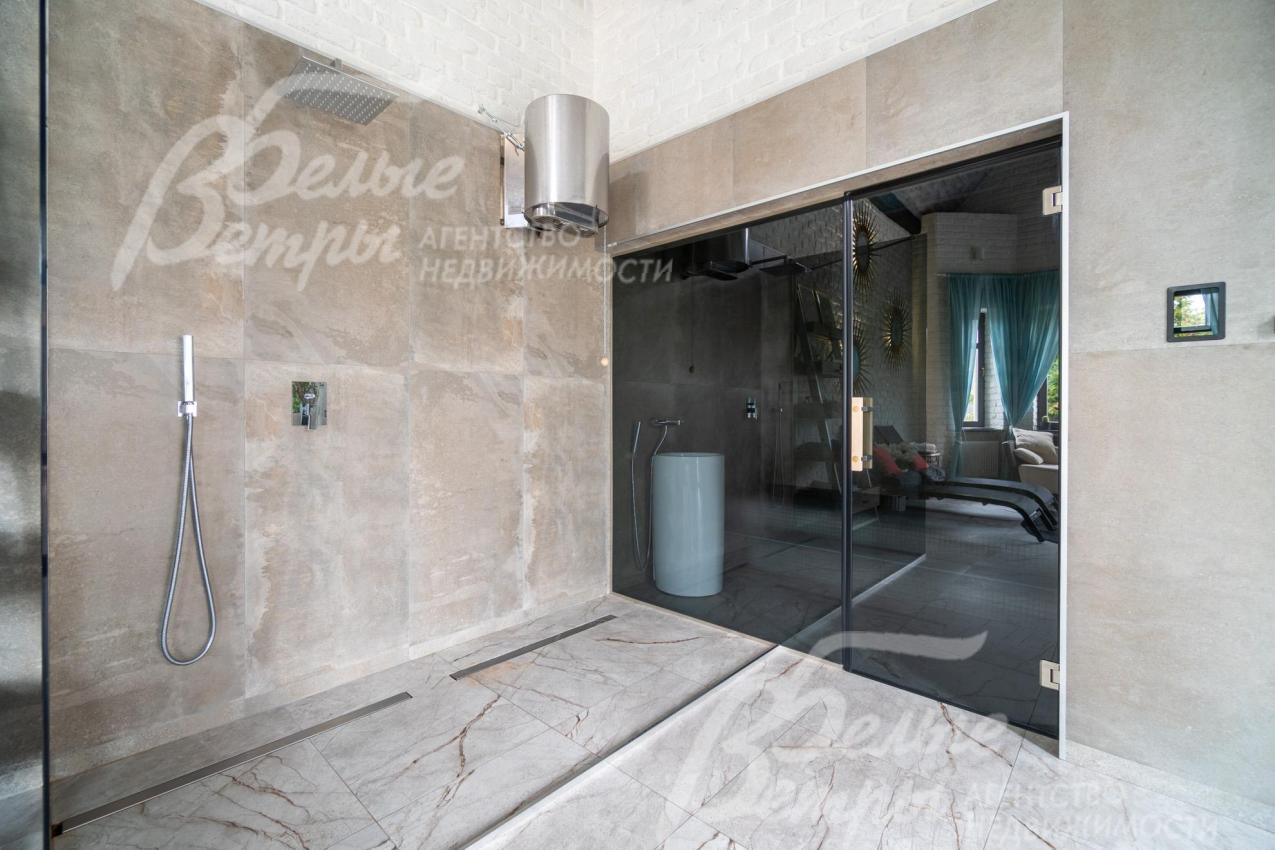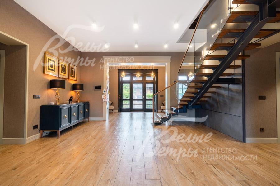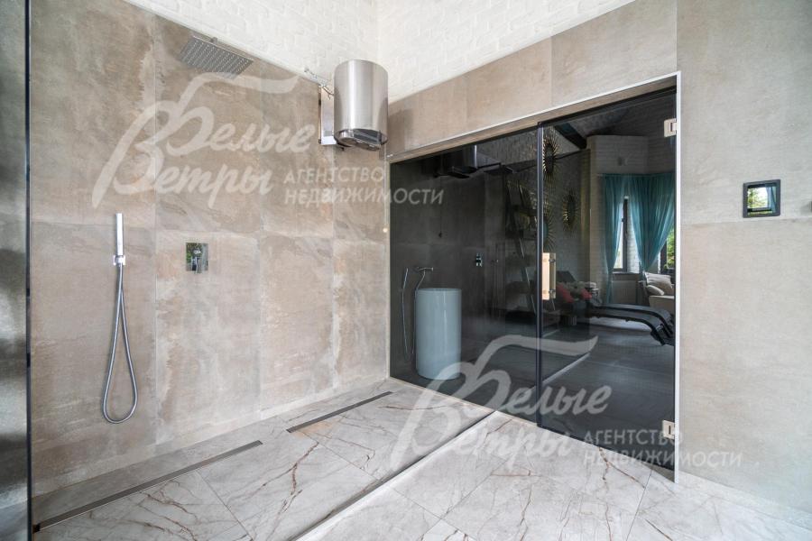 Описание внутренней отделки: в доме выполнена дорогостоящая отделка: на стенах — обои из рулонного флизелина и дизайнерские ламинированные панели Egger; полы оформлены испанским керамогранитом с водяным подогревом и французской инженерной доской. Установлены два биокамина. В спа‑зоне находится хамам (Tylo) в стиле лофт, отделанный мозаикой, керамогранитом и стеклом. Межкомнатные двери – премиум‑класса производителя «Волховец» из древесины дуба и МДФ с немецкой фурнитурой. Входная дверь выполнена из лиственницы, ступени — из керамогранита Villeroy & Boch. Установлены немецкие радиаторы Zender, подоконники из литого мрамора. На второй этаж ведёт лестница с элементами из металла, стекла и дуба. На террасе уложено покрытие из массива лиственницы