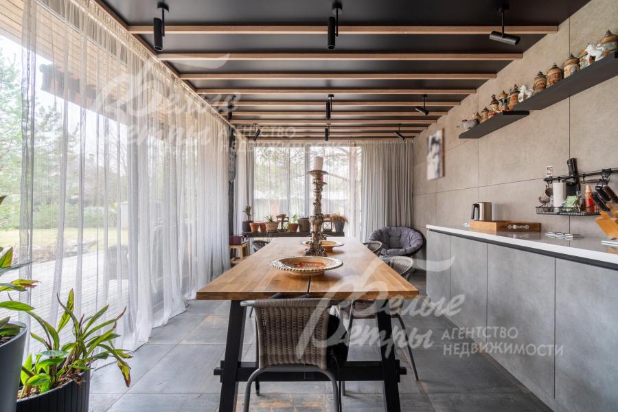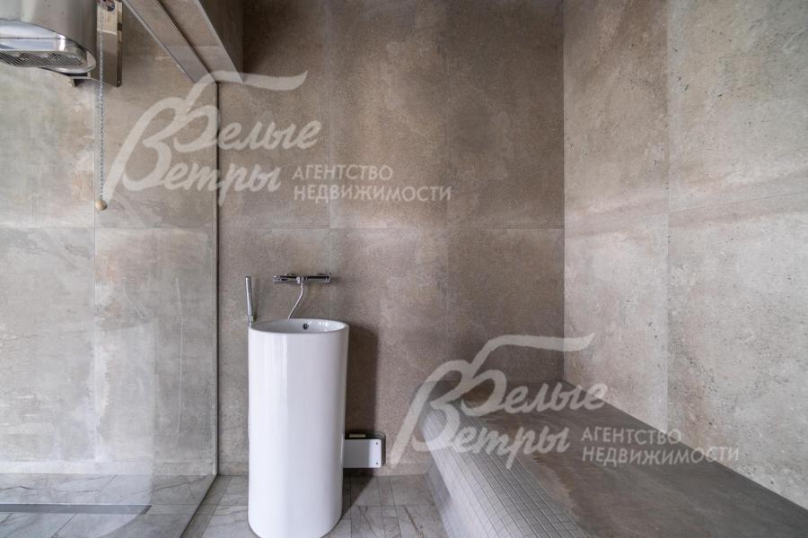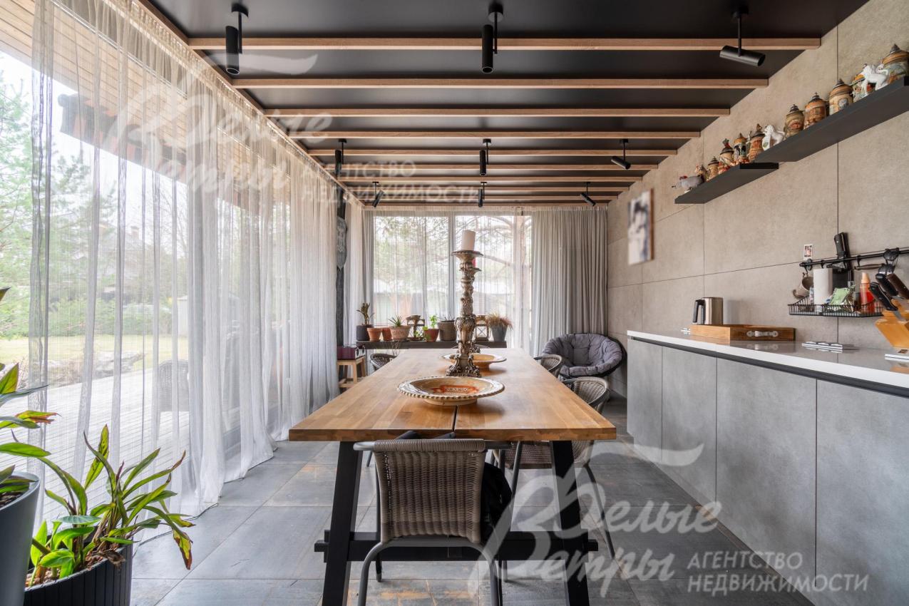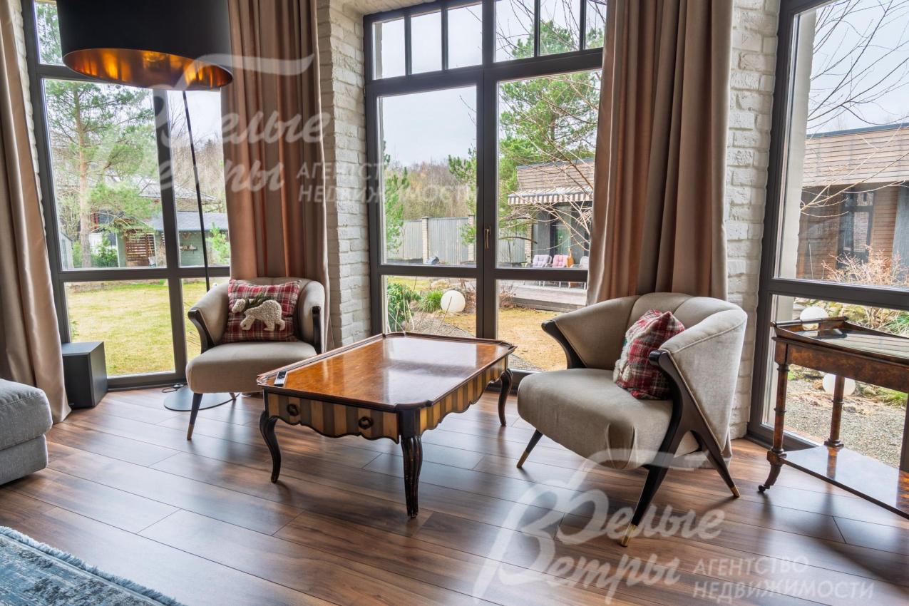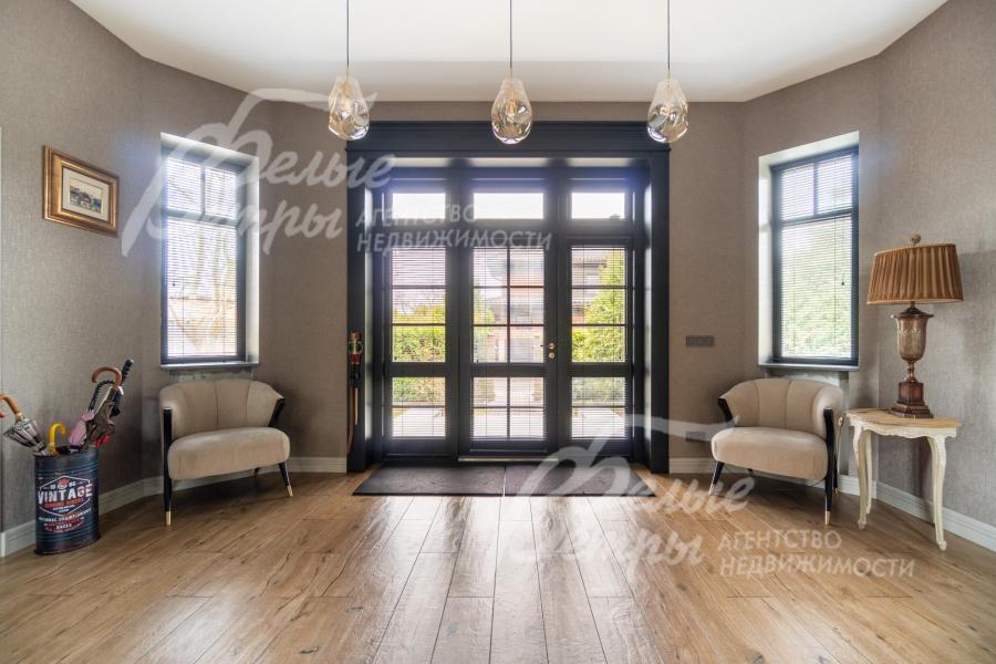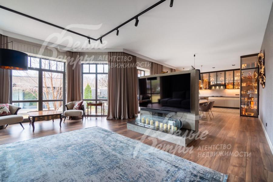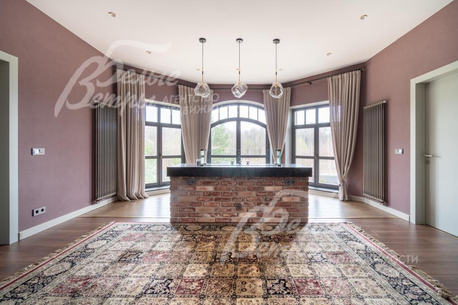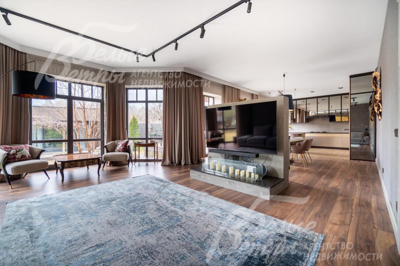 Описание внутренней отделки: в доме выполнена дорогостоящая отделка: на стенах — обои из рулонного флизелина и дизайнерские ламинированные панели Egger; полы оформлены испанским керамогранитом с водяным подогревом и французской инженерной доской. Установлены два биокамина. В спа‑зоне находится хамам (Tylo) в стиле лофт, отделанный мозаикой, керамогранитом и стеклом. Межкомнатные двери – премиум‑класса производителя «Волховец» из древесины дуба и МДФ с немецкой фурнитурой. Входная дверь выполнена из лиственницы, ступени — из керамогранита Villeroy & Boch. Установлены немецкие радиаторы Zender, подоконники из литого мрамора. На второй этаж ведёт лестница с элементами из металла, стекла и дуба. На террасе уложено покрытие из массива лиственницы
