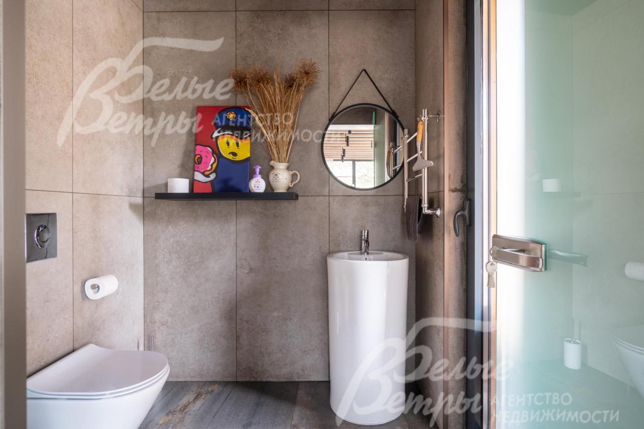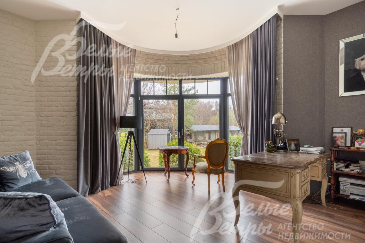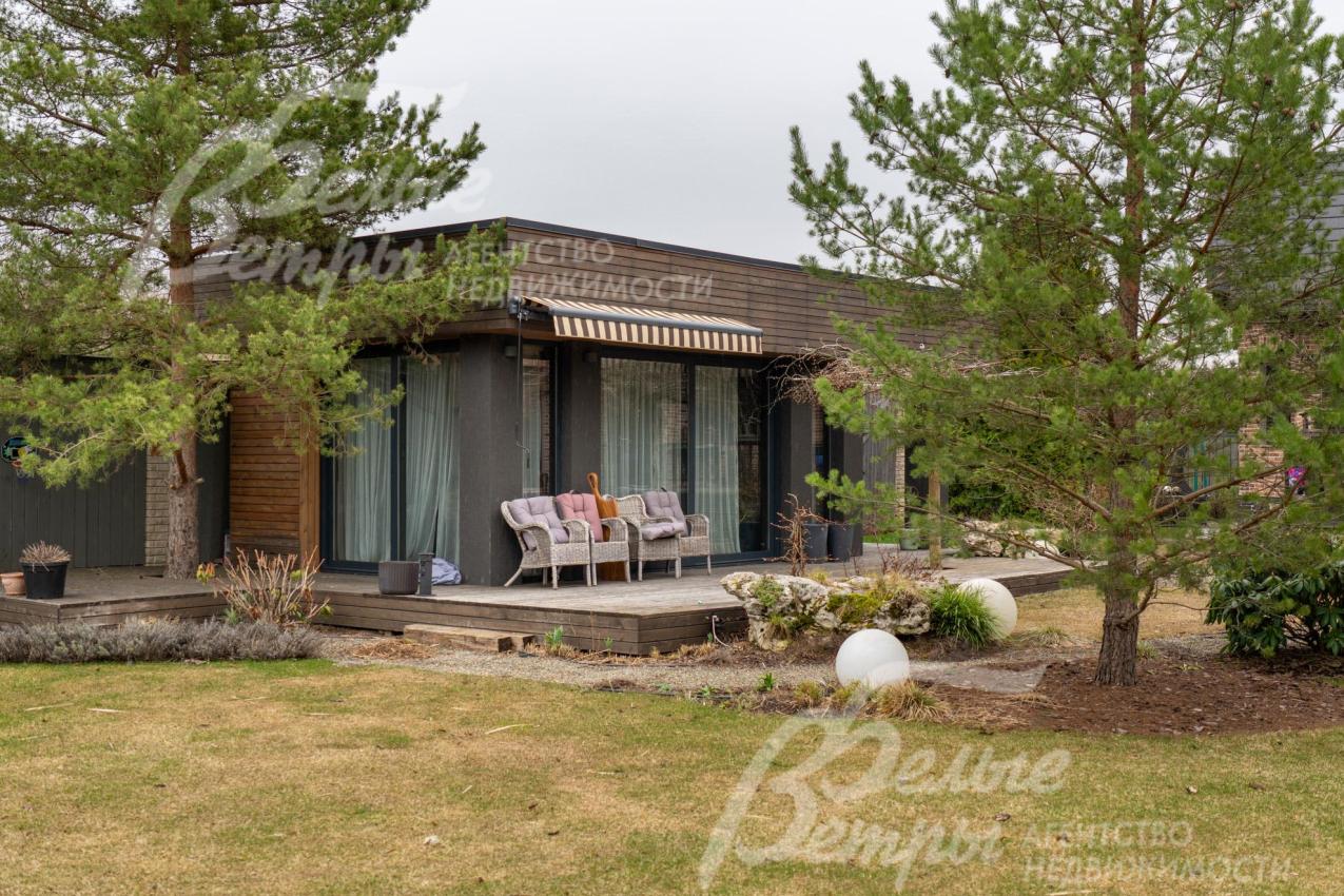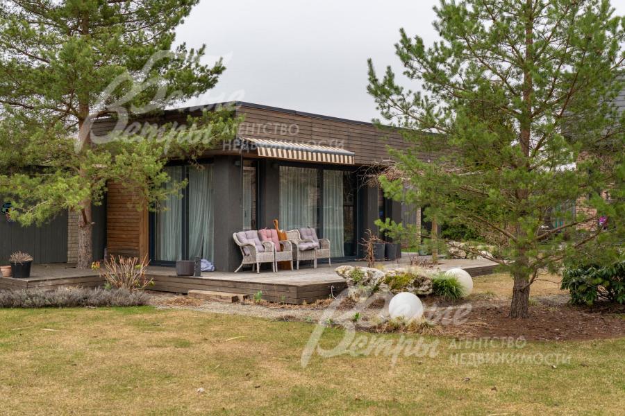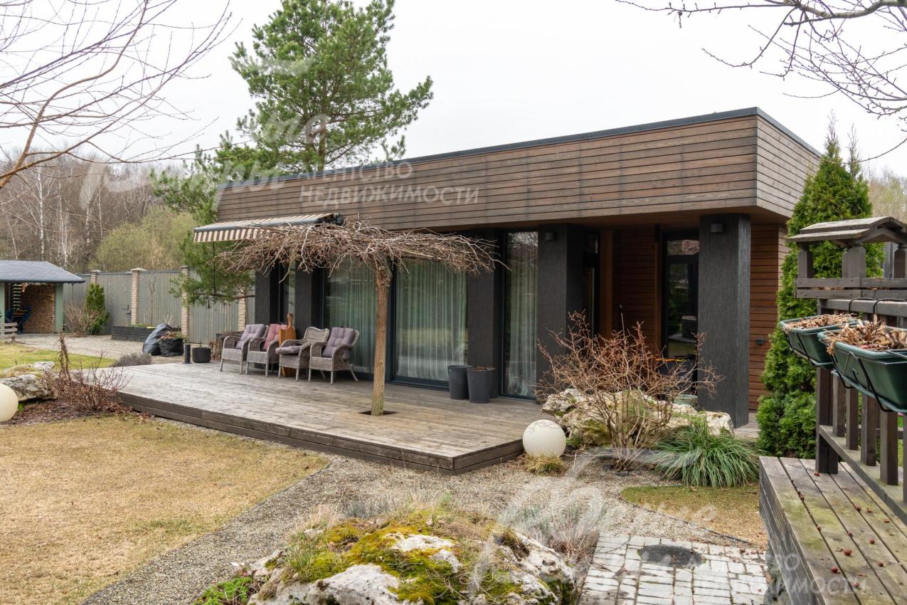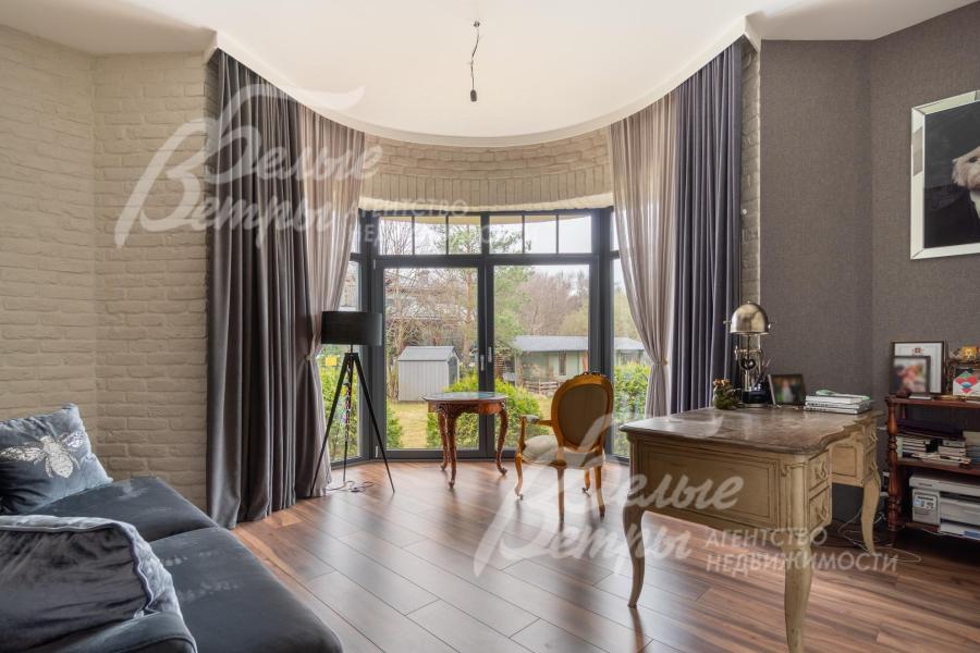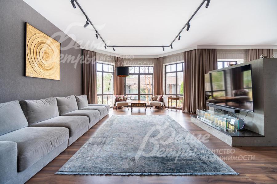 Описание внутренней отделки: в доме выполнена дорогостоящая отделка: на стенах — обои из рулонного флизелина и дизайнерские ламинированные панели Egger; полы оформлены испанским керамогранитом с водяным подогревом и французской инженерной доской. Установлены два биокамина. В спа‑зоне находится хамам (Tylo) в стиле лофт, отделанный мозаикой, керамогранитом и стеклом. Межкомнатные двери – премиум‑класса производителя «Волховец» из древесины дуба и МДФ с немецкой фурнитурой. Входная дверь выполнена из лиственницы, ступени — из керамогранита Villeroy & Boch. Установлены немецкие радиаторы Zender, подоконники из литого мрамора. На второй этаж ведёт лестница с элементами из металла, стекла и дуба. На террасе уложено покрытие из массива лиственницы