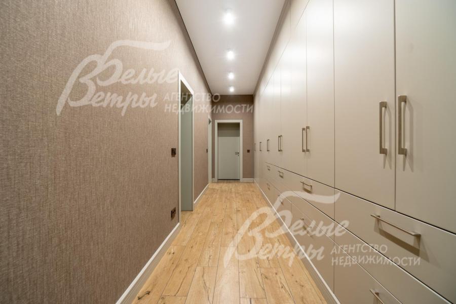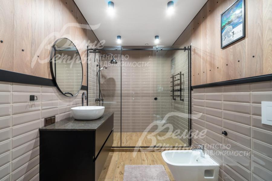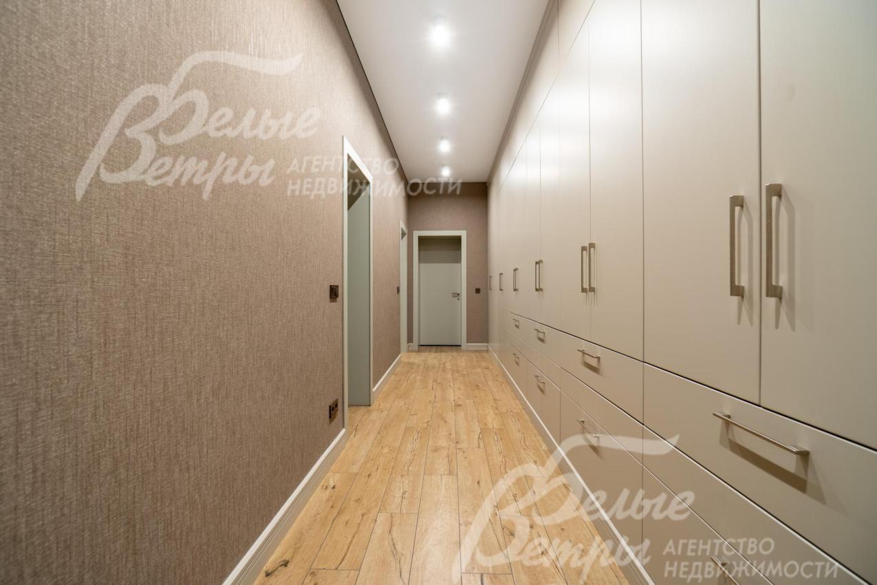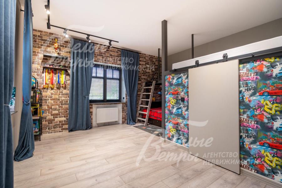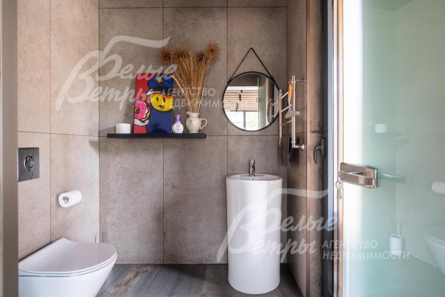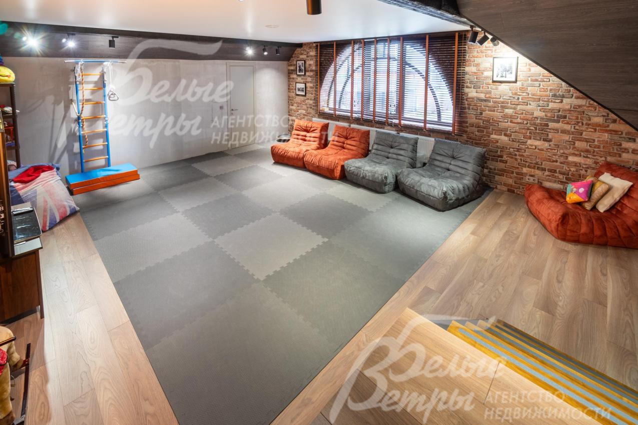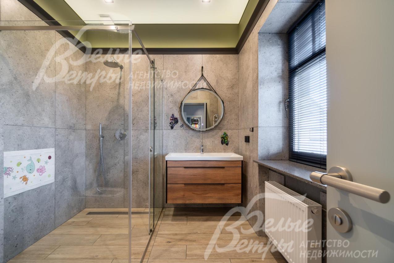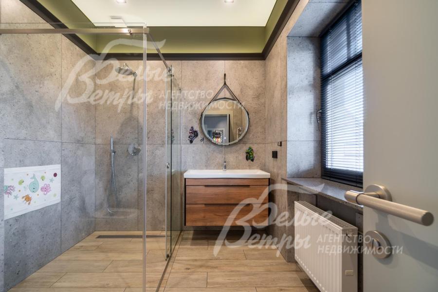 Описание внутренней отделки: в доме выполнена дорогостоящая отделка: на стенах — обои из рулонного флизелина и дизайнерские ламинированные панели Egger; полы оформлены испанским керамогранитом с водяным подогревом и французской инженерной доской. Установлены два биокамина. В спа‑зоне находится хамам (Tylo) в стиле лофт, отделанный мозаикой, керамогранитом и стеклом. Межкомнатные двери – премиум‑класса производителя «Волховец» из древесины дуба и МДФ с немецкой фурнитурой. Входная дверь выполнена из лиственницы, ступени — из керамогранита Villeroy & Boch. Установлены немецкие радиаторы Zender, подоконники из литого мрамора. На второй этаж ведёт лестница с элементами из металла, стекла и дуба. На террасе уложено покрытие из массива лиственницы