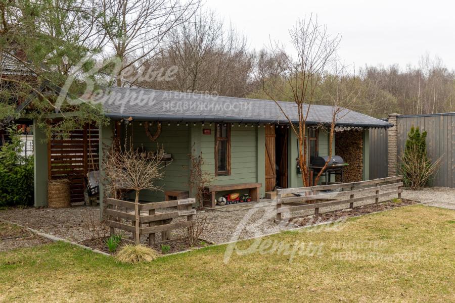 Дополнительные строения: 1. Отдельно стоящая отапливаемая беседка, включающая кухню и зону барбекю. Конструкция выполнена с использованием кирпича, стекла, керамогранита и дерева. В беседке - тёплые полы, обустроены кухня, санузел и терраса. Беседка оснащена сдвижным остеклением и солнцезащитной маркизой;