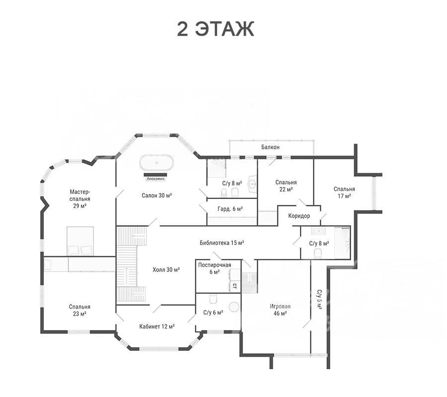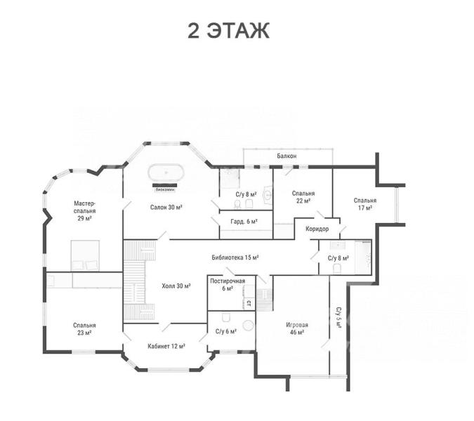 2-ой этаж: холл 30 кв.м, библиотека 15 кв.м, мастер-блок: салон 30 кв.м с ванной, мастер-спальня 29 кв.м, спальня 23 кв.м, коридор, спальня 22 кв.м, спальня 17 кв.м, кабинет 12 кв.м, игровая 46 кв.м, санузел 6 кв.м, санузел 8 кв.м, санузел при игровой 5 кв.м, постирочная 6 кв.м, балкон