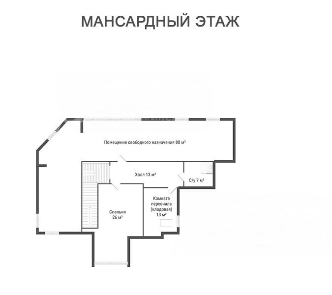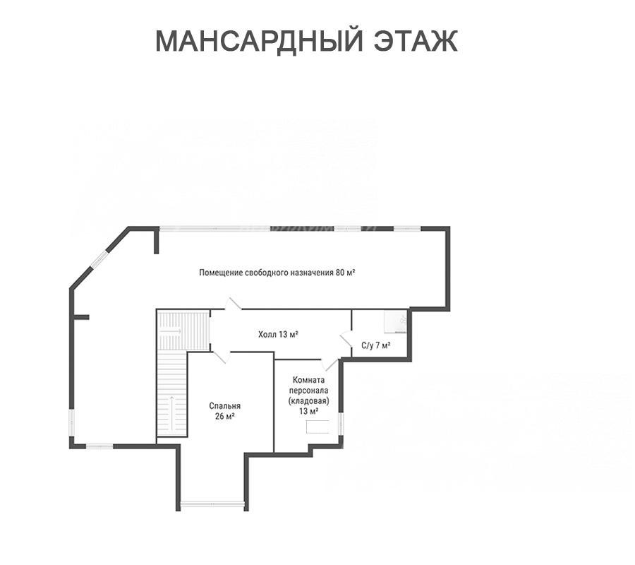 3-ий этаж: мансардный этаж: холл 13 кв.м, спальня 26 кв.м, помещение для персонала (кладовая) 13 кв.м, санузел 7 кв.м, помещение свободного назначения 80 кв.м