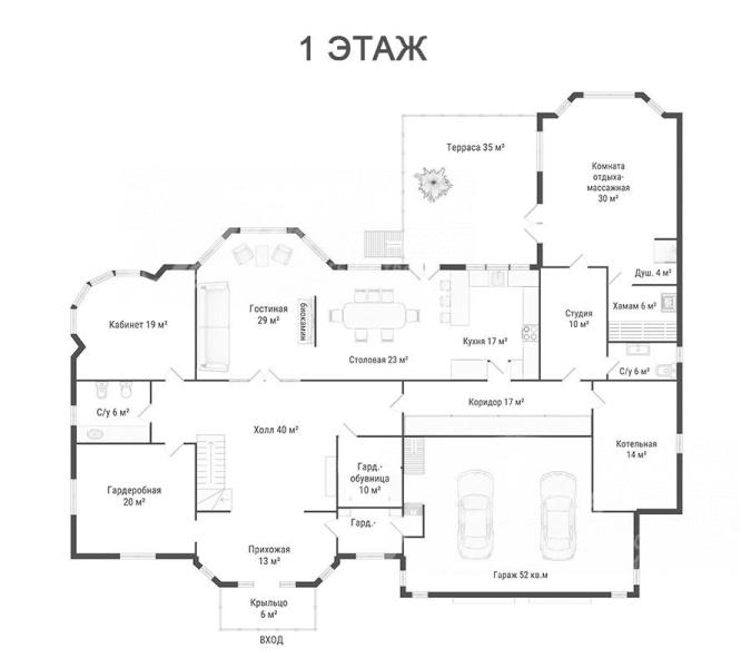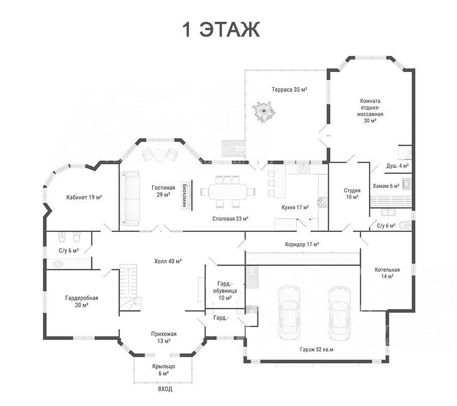 1-ый этаж: крыльцо 6 кв.м, прихожая 13 кв.м, холл 40 кв.м, гостиная 29 кв.м и выходом на террасу 35 кв.м, столовая 23 кв.м, кухня 17 кв.м, кабинет 19 кв.м, гардеробная-обувница 10 кв.м, гардеробная 20 кв.м, коридор-кладовая 17 кв.м, санузел 5 кв.м, санузел 6 кв.м, котельная 14 кв.м, гараж 52 кв.м;