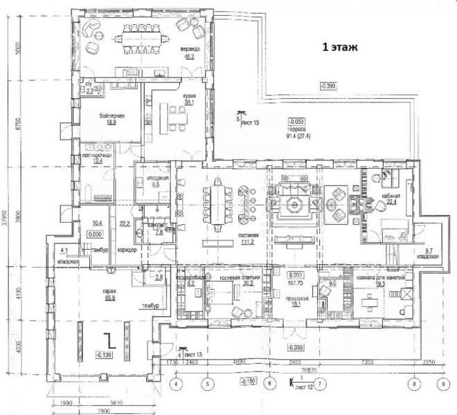 1-ый этаж: Прихожая 18 кв.м с гардеробной 9 кв.м, гостиная 111 кв.м с камином и выходом на террасу 91кв.м, кухня 30 кв.м с кладовой 8.5 кв.м и с выходом в зимнюю отапливаемую веранду 46 кв.м (с печью, мангалом, с/узлом), кабинет 22 кв.м с камином и кладовой 9 кв.м, спальня 20 кв.м с гардеробной, комната для занятий 19 кв.м, холл 22 кв.м, с/узел 8 кв.м, постирочная 12 кв.м, бойлерная 19 кв.м, гараж для 2 а/м и мото-техники 70 кв.м с кладовой 4 кв.м