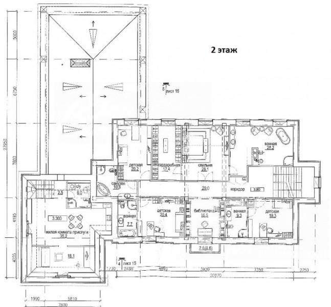 2-ой этаж: Главная спальня 28 кв.м с двумя гардеробными (мужская и женская) 7 и 9 кв.м и с ванной комнатой 26 кв.м; детская спальня 19.3 кв.м с с/узлом 9.3 кв.м, детская спальня 20.4 кв.м с с/узлом 7.7 кв.м, детская спальня 20.2 кв.м с с/узлом 10.8 кв.м, библиотека 16.5 кв.м с балконом. Также на 2-ом этаже квартира для персонала (с отдельным входом с улицы, без сообщения с другими помещениями этажа): коридор, с/узел 6 кв.м, кухня-гостиная 35 кв.м, спальня 18 кв.м.