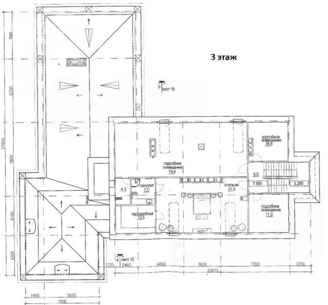 3-ий этаж: кинотеатр-бильярдная 80 кв.м с с/узлом 4.5 кв.м, спальня 57 кв.м с гардеробной 12.5 кв.м и с/узлом 7 кв.м, чемоданная 17 кв.м, кладовая 17 кв.м
