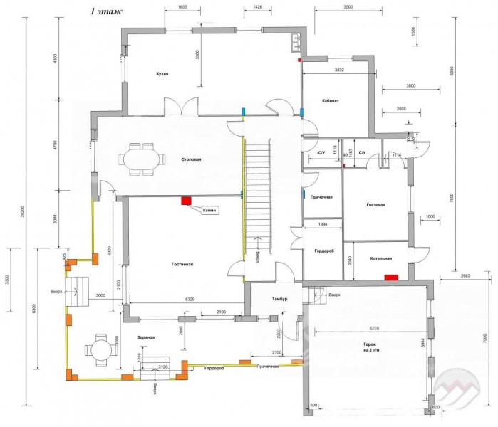1-ый этаж: гараж на 2 м/места 43.5 кв.м, просторное крыльцо, тамбур-прихожая, холл 25 кв.м, гостиная 36 кв.м с выходом на веранду 45 кв.м, столовая 28 кв.м, кухня 32 кв.м, кабинет 14 кв.м, с/узел 3 кв.м, гардеробная 6 кв.м, прачечная 6 кв.м; блок для персонала с отдельным входом и с/узлом, котельная 6 кв.м