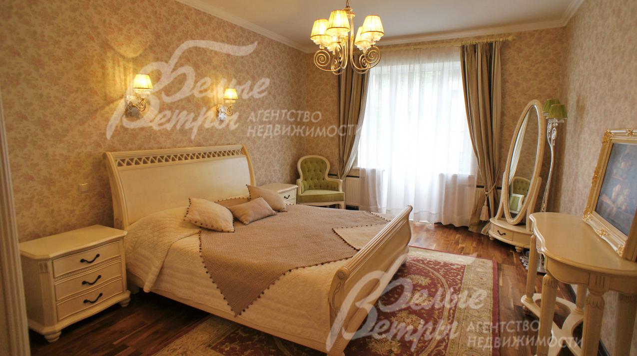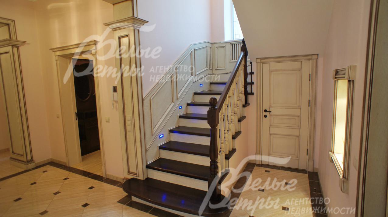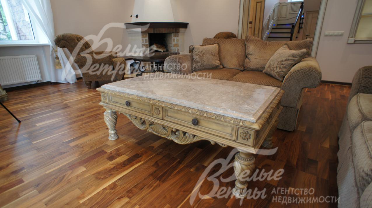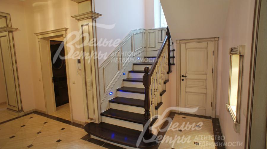 Описание внутренней отделки: Классический стиль с мотивами Прованса. Качественная отделка с использованием дорогостоящих материалов. Стены в нежилых помещениях окрашены, в спальнях английские бумажные обои. Полы- керамогранит с водяным подогревом, паркетная доска. Лестничный марш- металлический каркас, отделка из дуба, с подсветкой (ширина 100, ступени 33 *19 см). Потолки окрашены, в гостиной многоуровневый ГКЛ. Двери из массива лиственницы, с порталами, в классическом стиле.
