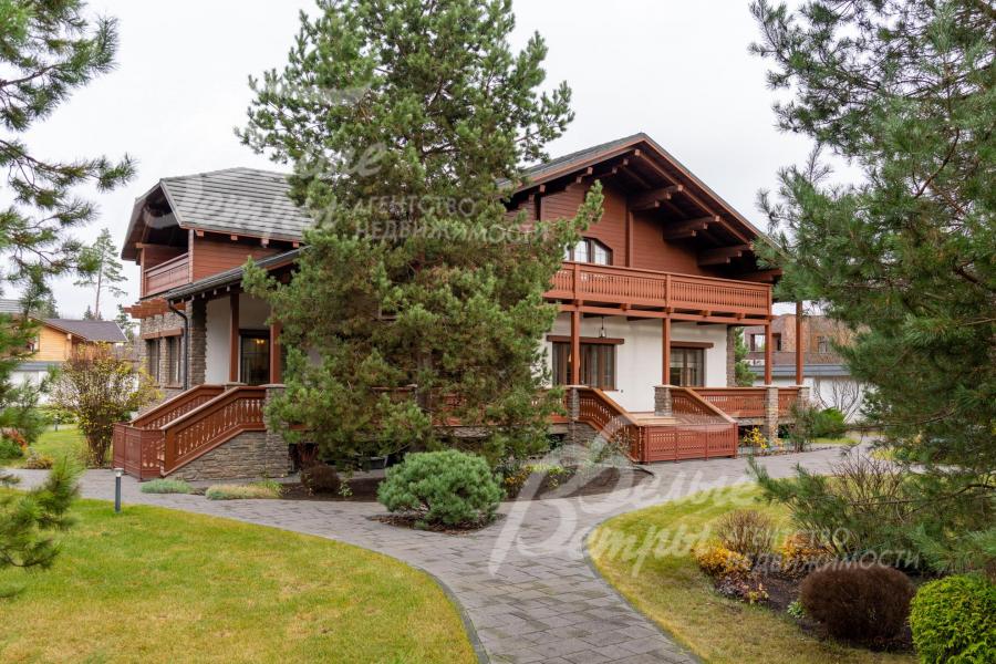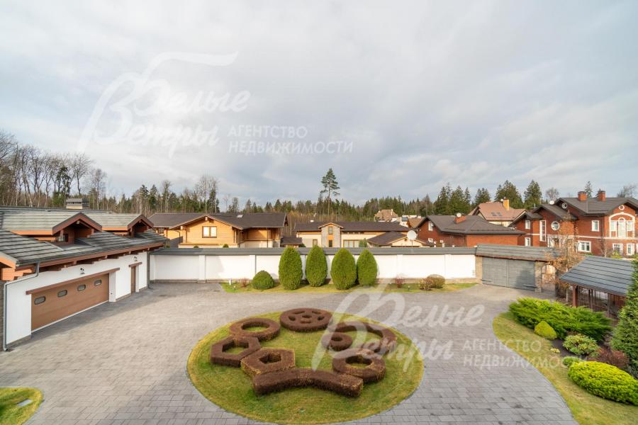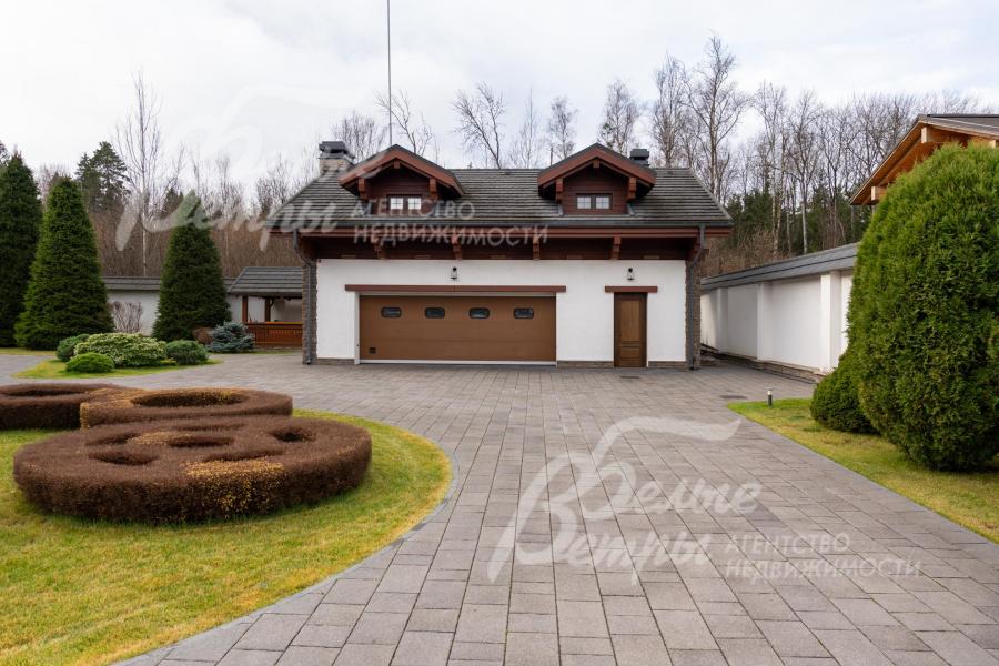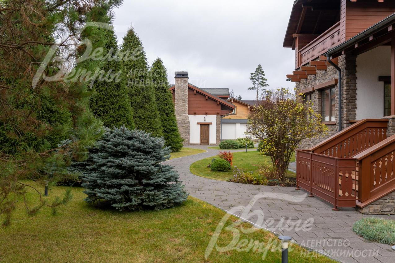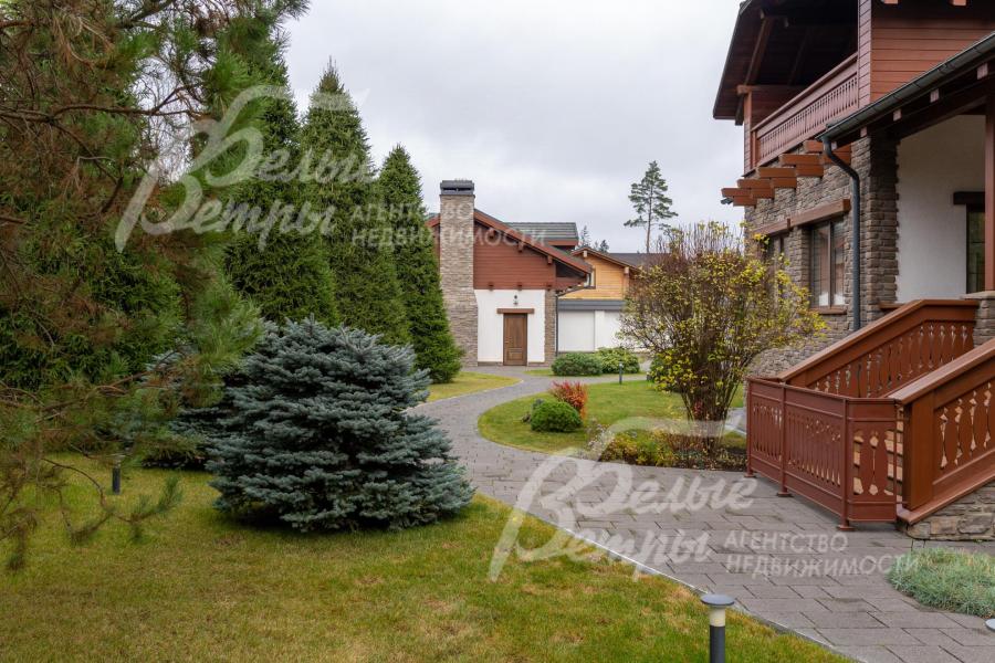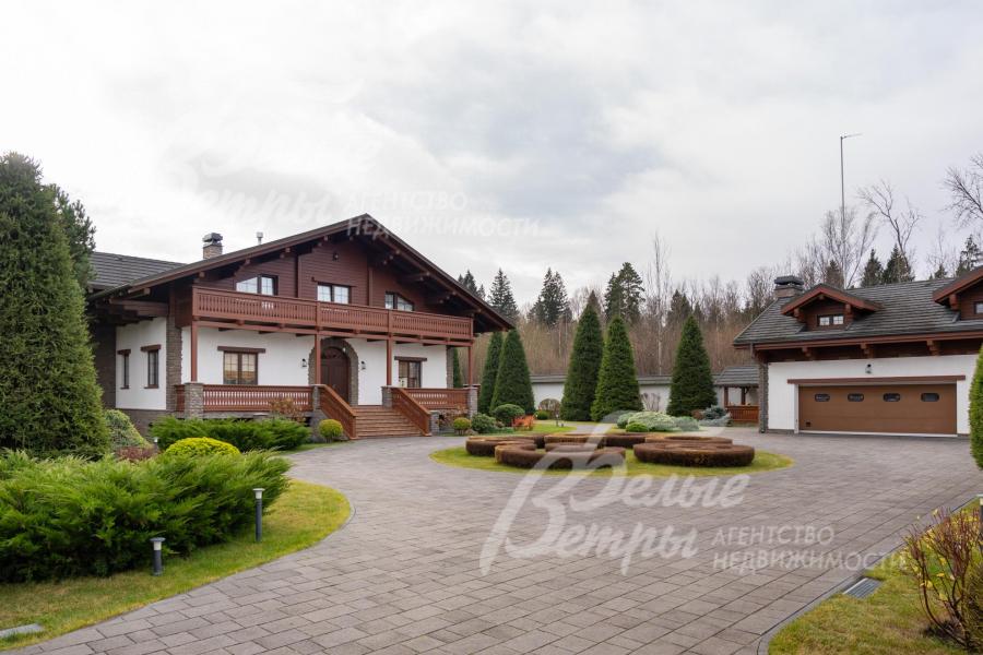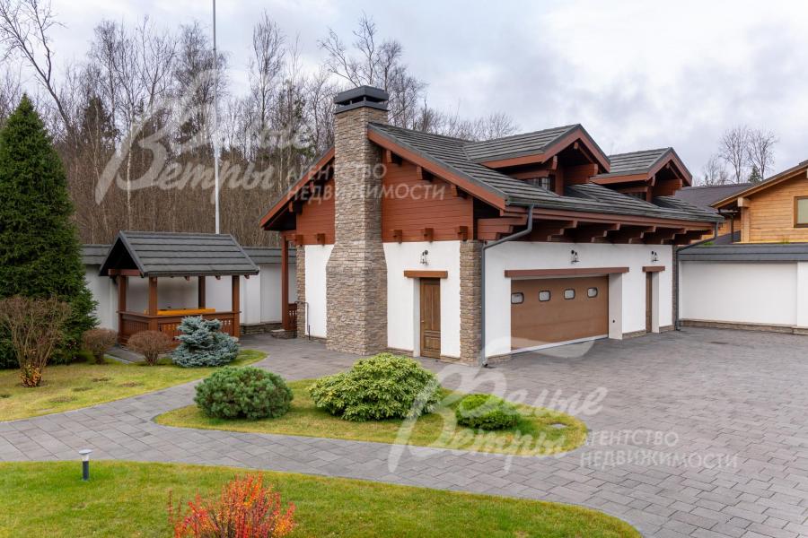 Премиальный меблированный дом в идеальном состоянии в престижном охраняемом коттеджном посёлке. Стены из кирпича, выразительная архитектура и отделка фасада в стиле шале: 1-ый этаж - камень, штукатурка, 2ой этаж - отделан лиственницей экстра-класса. Большие крытые террасы и лоджии. Дорогая композитная кровля с большими свесами, множество мощных деревянных балок и консолей. Деревянные стеклопакеты. В планировке - большие комнаты, есть SPA-зона, поражающий красотой камин. Внутренняя отделка "под тапочки", в современной стилистике, элитными материалами и с превосходным качеством. Мебель, сантехника, освещение от премиальных брендов. Мощная инженерия - немецкое котельное оборудование, системы бесперебойного энерго-обеспечения, видеонаблюдения, сигнализации, усиления сотовой связи и бесшовного интернета по всему участку. Роскошный и очень ухоженный участок, с парадной клумбой, вместительным паркингом, множеством взрослых деревьев, идеальным газоном; продуманный ландшафт оставляет простор и впечатляющие обзорные виды. Кроме основного есть также вспомогательный дом в стиле основного дома - с большим гаражом, гостевым блоком, и квартирой персонала.