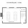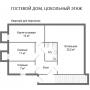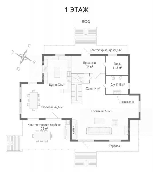 1-ый этаж: крытое крыльцо 27,5 кв.м, прихожая 14 кв.м, гардеробная 11,5 кв.м, гостевой санузел 11,5 кв.м, холл 14 кв.м, гостиная 78 кв.м с выходом на террасу, кухня 23 кв.м, столовая 47,5 кв.м с выходом на крытую террасу с зоной барбекю 79 кв.м