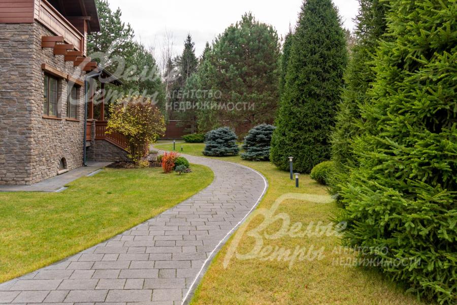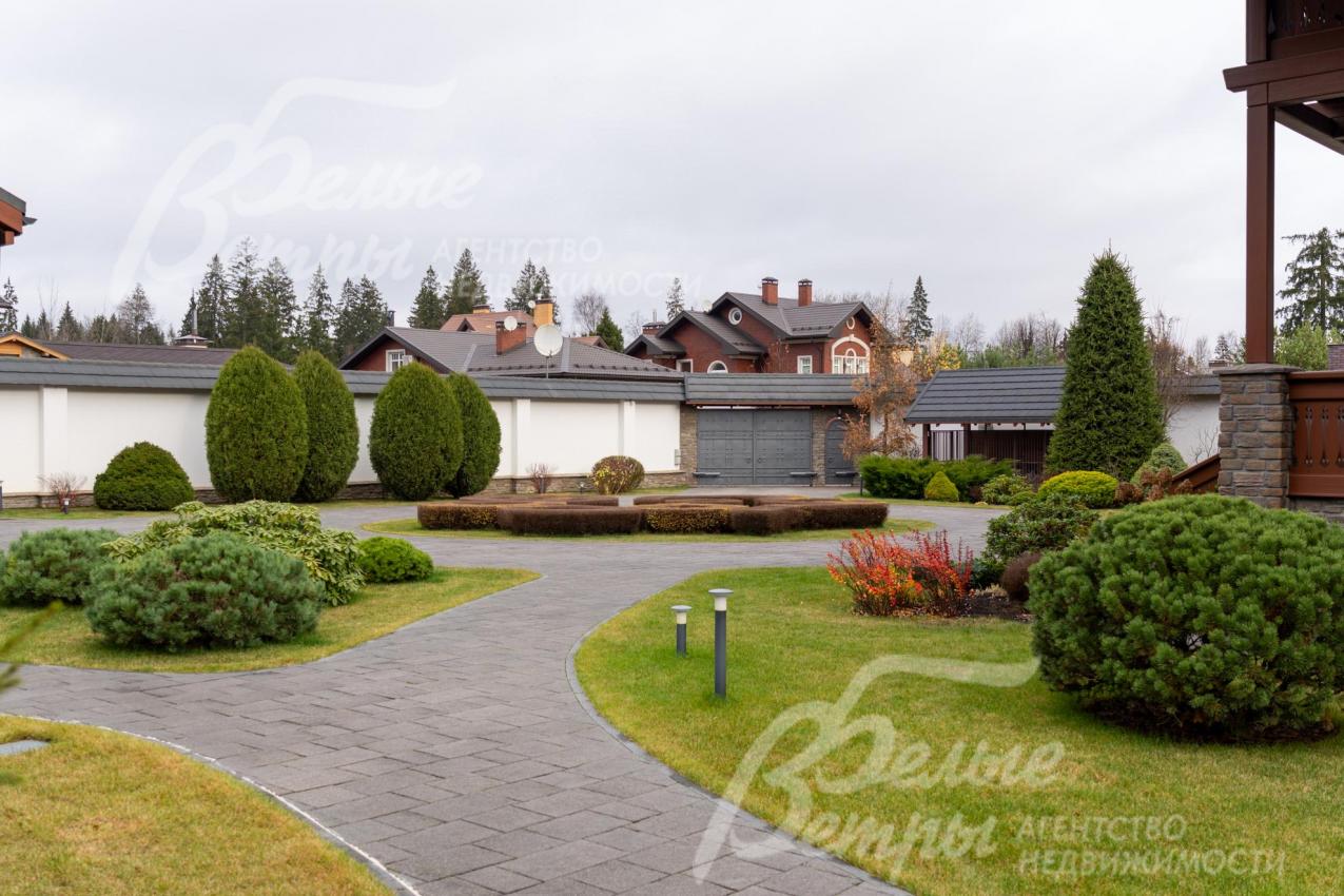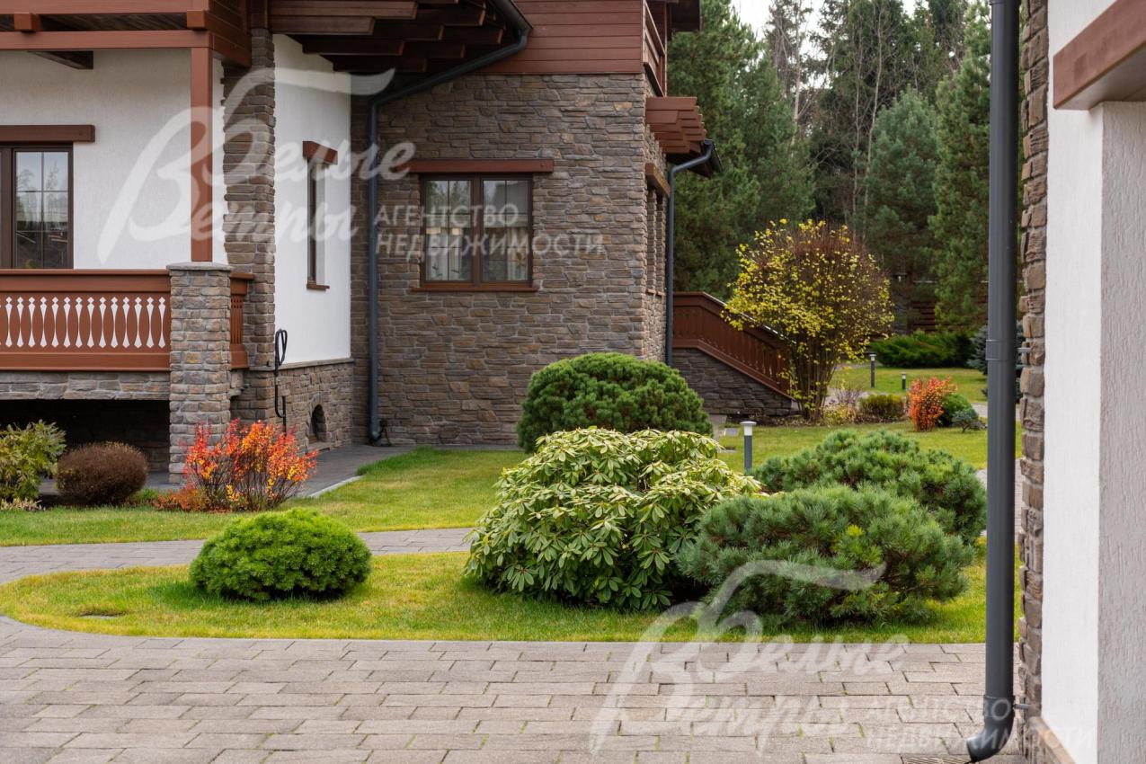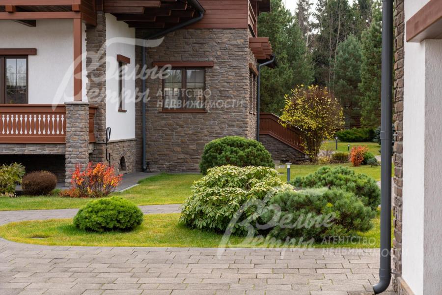 Благоустройство участка: роскошно оформленный и очень ухоженный участок: около 80 высаженных взрослых деревьев и кустарников, в том числе 15 сосен высотой по 8 м, 8 елей (сформированы кроны), 6 голубых елей, корейская кедровая сосна, орешник, можжевельники, декоративные хвойные и другие. Ландшафтный дизайн дополнен идеальным газоном «4 мятлика», цветниками и центральной круглой клумбой перед домом с кустами спиреи. Дорожки и площадка для парковки (на более, чем 10 автомобилей) выложены бетонной брусчаткой с гранитной крошкой, на мощном железобетонной основании (монолитная плита 25 см с двойным армированием), общая площадь мощения 1150 кв.м. Установлена система автополива Weathermatic (США), включающая 15 зон орошения: система оснащена двумя резервуарами по 1,5 тонны воды каждый, система оборудована дождевальными установками и баблерами для точечного полива крупных деревьев. Выполнено освещение, дренажная система по участку и вокруг дома.