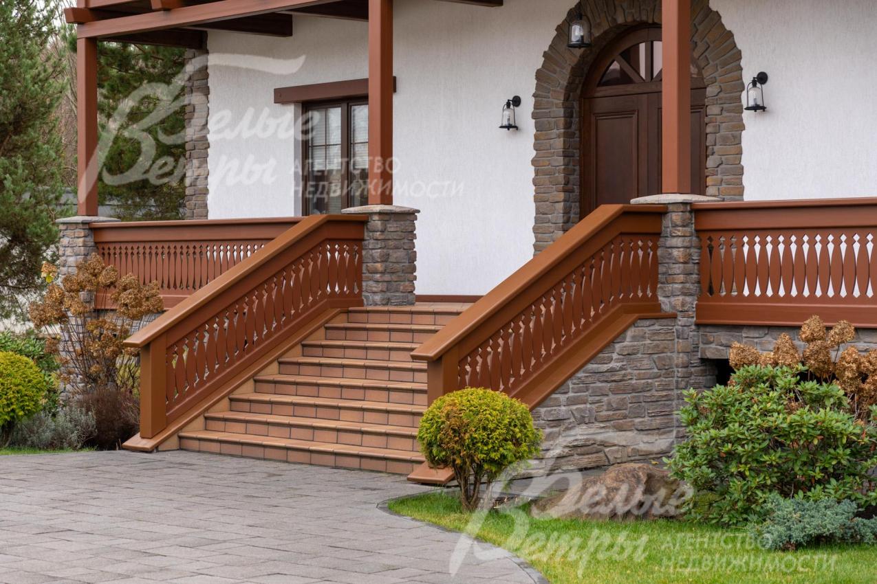 Облицовка стен: Фасад отделан в традиции стиля Шале: стены 1-го этажа - комбинация штукатурки с покраской качественной немецкой краской и камня; стены 2-го этажа - лиственница экстра-класса. Много декора - искусственный камень и деревянные балки. Цоколь отделан искусственным камнем. Главная лестница - входной марш, выполнена клинкерной плиткой с электрическим подогревом. Выполнена декоративная подсветка фасада.