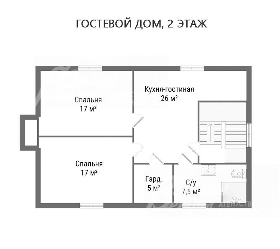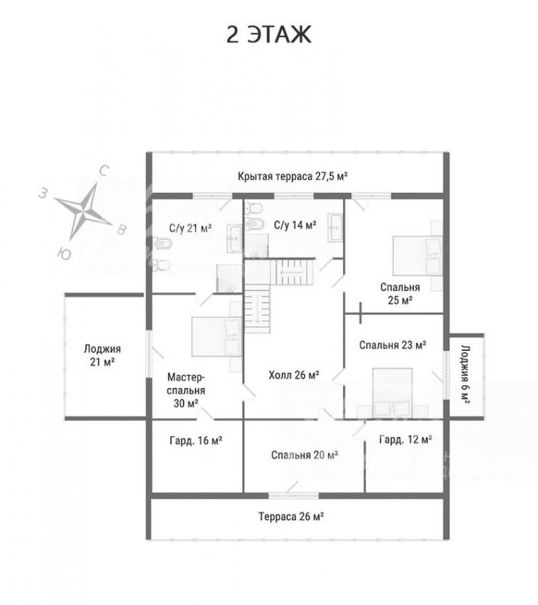 2-ой этаж: холл 26 кв.м, мастер-спальня 30 кв.м с выходом на видовую лоджию 21 кв.м, своими санузлом 21 кв.м (с выходом на другую крытую террасу) и гардеробной 16 кв.м, спальня 20 кв.м с гардеробной 12 кв.м и выходом на террасу 26 кв.м, спальня 23 кв.м с выходом на лоджию 6 кв.м, спальня 25 кв.м с выходом на крытую террасу 27,5 кв.м, общий санузел 14 кв.м