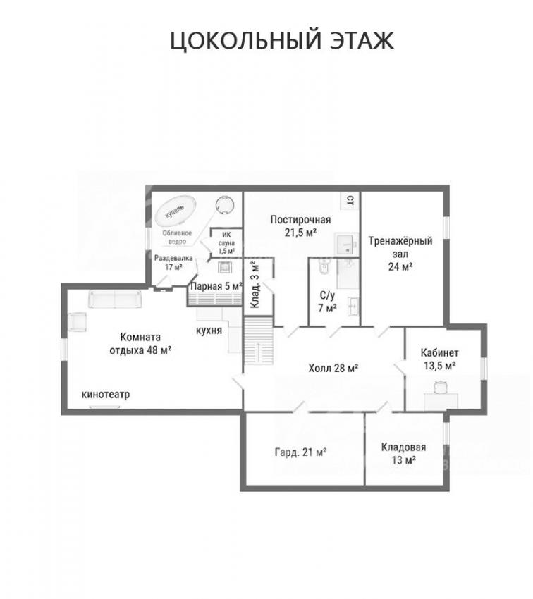 Цоколь: холл 28 кв.м, тренажёрный зал 24 кв.м, кабинет 13,5 кв.м, санузел 7 кв.м, постирочная 21,5 кв.м, гардеробная 21 кв.м, кладовая 13 кв.м; кладовая 3 кв.м;