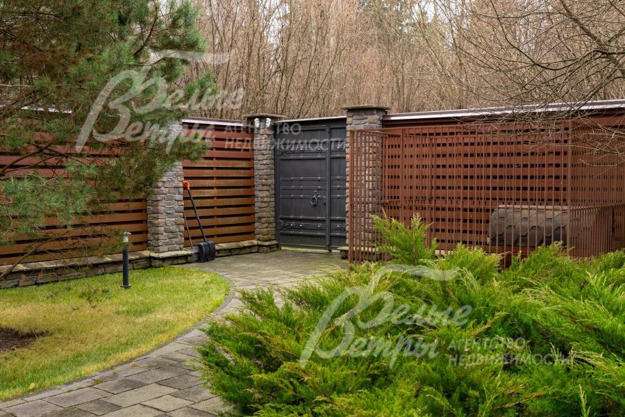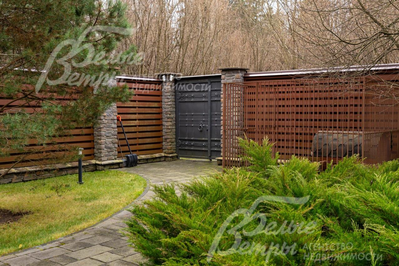 Дополнительная информация об участке: участок граничит с лесом, имеет собственный выход. Огорожен кирпичным забором высотой 3,5-4 м: по фасадной и боковым сторонам до середины участка – забор в стиле шале, продолжающий архитектурную концепцию дома (белая штукатурка «короед» с черепичным покрытием). Задняя, прилесная часть участка - ограждена деревянным забором в более близком к природному виде, на столбах, отделанных камнем в стиле дома. Забор установлен на фундаменте с заглублением ниже уровня промерзания. На въезде – роскошные кованые стилизованные ворота ручной работы с электроприводом, рядом - входная калитка в таком же стиле.