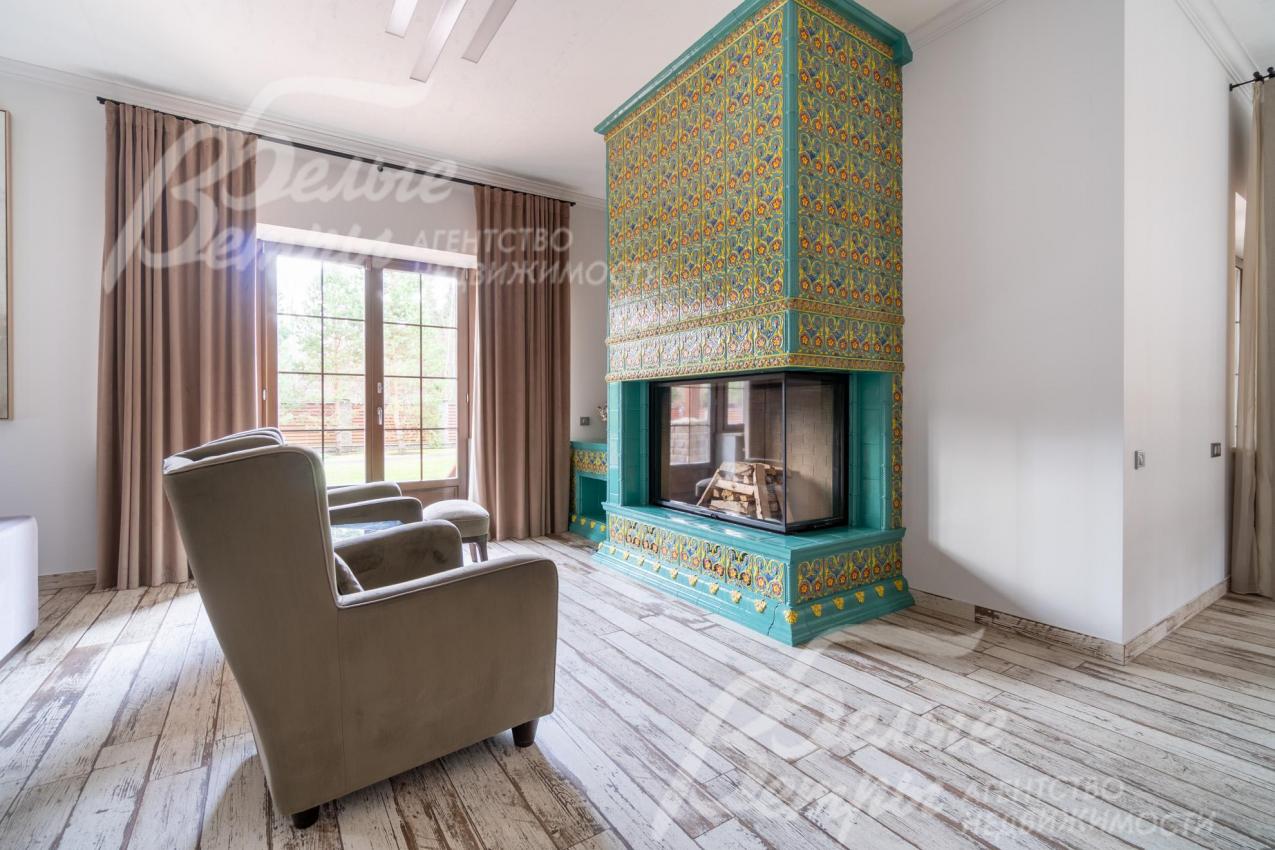 Описание внутренней отделки: отделка дома выполнена в современной стилистике из элитных материалов. Гармонично присутствуют элементы стилей: современная американская классика, лофт и французский прованс. Стены в помещениях общего назначения покрыты декоративной штукатуркой или окрашены премиальной английской краской Mylands по малярной бумаге (предотвращает образование трещин); на стенах в спальнях - обои York (США), часть стен декорирована клинкерной плиткой Feldhaus (Германия); на стенах в санузлах - итальянская плитка люксовых брендов. На полу 1-го этажа - керамогранит SANT'AGOSTINO коллекции BLENDART с матовой поверхностью (серый цвет, имитация некрашеной состаренной доски), на 2-м этаже - состаренная доска из дуба Terra (Wildwood). Потолки первого этажа выполнены из фактурной штукатурки с имитацией бетона. Эффектная лестница на железобетонном каркасе со ступенями, отделанными инженерной доской FINEX (дуб) и стеклянным ограждением. Роскошная входная двухстворчатая дверь с арочным окном утеплена и отделана панелями из массива дуба. Межкомнатные двери Ghizzi&Benatti (Италия) из массива каштана с сатиновым покрытием, окрашенные и декорированные патиной. Подоконники из итальянского мрамора. Радиаторы Arbonia и панельные стальные радиаторы PURMA. Итальянские люстры и светильники. Гостиную украшает камин гильотинного типа с с двусторонней топкой Spartherm (Германия) и впечатляющим порталом до потолка, облицованным фаянсовыми изразцами с ручной художественной росписью. Ещё один акцент пространства – живописные полотна известных художников: некоторые картины созданы специально для этого дома. На цокольном этаже – просторная комната отдыха с системой домашнего кинотеатра 5.1 HARMAN/ KARDON и мини-кухней, а также SPA-зона: баня с полками из абаша, стенами из кедра и с печью HARVIA с парогенератором, а также инфракрасная сауна, купель и экстрим-душ с обливным ведром. Часть входного марша – с электрическим подогревом.