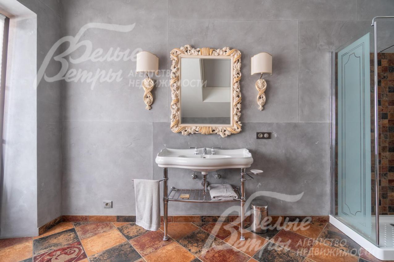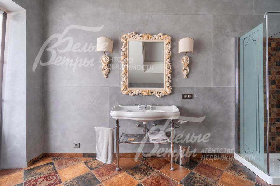 Мебель, оборудование: на кухне – гарнитур с островом немецкого производства: верхние фасады из МДФ с дубовым шпоном, нижние – крашеный фасады из МДФ, фурнитурой Blum; столешница из кварцевого агломерата (имитация мрамора Calaccata), фартук из клинкерной плитки Feldhaus (Германия), барная стойка из карагача. Встроенная кухонная техника; кухонный блок Restart (Италия) в ретро-стиле с шестикомфорочной газовой плитой с грилем, двумя духовками (большой и маленькой) и вытяжкой; также посудомойка NEFF, холодильник Syde-By-Syde от Restart. В столовой – обеденная группа с мощным столом и стульями от фирмы "Эстетика" на 8-10 персон. Мебель в прихожей и гостиной (комоды, книжные шкафы и большой стеллаж с подсветкой, журнальные столики, светильники) - от John-Richard (США), Poliform (Италия), Eichholtz (Нидерланды), Эстетика (Россия) и также выполнены на заказ. В спальнях - премиальная мебель Savio Firmino (Италия) и матрасы King&Koll. Интерьер дополнен эксклюзивным текстилем из дорогостоящих тканей и массивными люстрами Renzo del Ventisette (Италия) в гостиной и столовой. В санузлах - сантехника в классическом и ретро-стиле элитных европейских брендов: раковины Villeroy&Boch (Германия), фаянс KERASAN (Италия), смесители THG (Франция), душевые кабины HUPPE (Германия) и душевые системы DEVON&DEVON (Италия). На террасе - столовый гарнитур из ротанга от Brafab (Швеция).