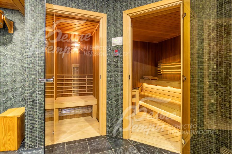 SPA-зона: парная 5 кв.м, инфракрасная сауна 1,5 кв.м, комната отдыха с кухней и домашним кинотеатром 48 кв.м, предбанник-раздевалка 17 кв.м с душем, обливным ведром и купелью
