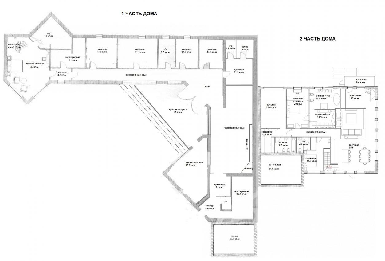 1-ый этаж: 1-я часть дома: мастер спальня 36 кв.м, санузел в спальне 18 кв.м, гардеробные 5,6 кв.м и 4,6 кв.м, коридор 4,2 кв.м, спальня 13,5 кв.м, спальня 21,3 кв.м, санузел 8,7 кв.м, спальня 12,5 кв.м, спальня 13,8 кв.м, санузел 1,6 кв.м, сауна 5 кв.м, душевая 11,7 кв.м, коридор 40,8 кв.м, гостиная 58,8 кв.м, кухня столовая 27,6 кв.м, прихожая 18 кв.м, тамбур 6,4 кв.м, санузел 1,6 кв.м, постирочная 15,7 кв.м, гараж 30,8 кв.м, котельная 34,6 кв.м, крытая террасса 35 кв.м;
