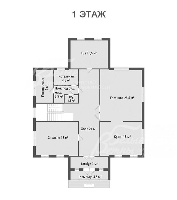 1-ый этаж: крыльцо с навесом 4,5 кв.м, тамбур 3 кв.м, холл 24 кв.м, гостиная 28,5 кв.м, кухня 18 кв.м, спальня 18 кв.м, гостевой санузел 1,5 кв.м, санузел с ванной 13,5 кв.м, помещение под сушильную машину 3,5 кв.м, постирочная 7 кв.м, котельная 4,5 кв.м