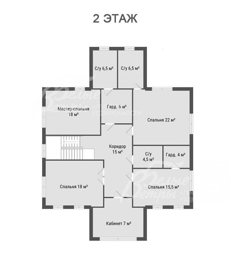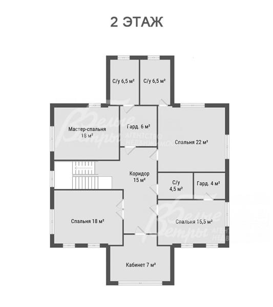 2-ой этаж: коридор 15 кв.м, мастер-спальня 18 кв.м с гардеробной 6 кв.м и санузлом 6,5 кв.м, спальня 22 кв.м с санузлом 6,5 кв.м, спальня 15,5 кв.м с гардеробной 4 кв.м, спальня 18 кв.м, кабинет 7 кв.м, санузел с душевой 4,5 кв.м