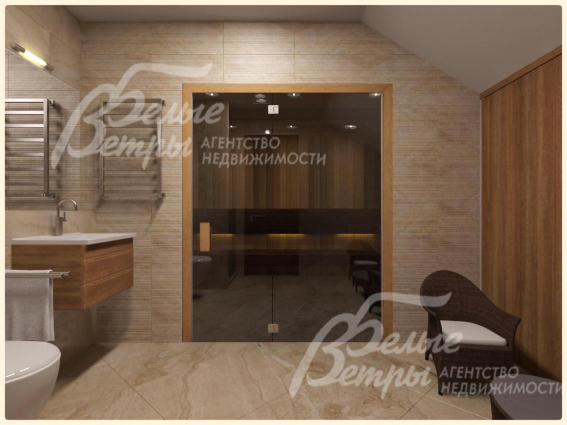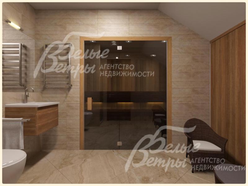 3-ий этаж: мансарда: кинозал 60 кв.м с мини-кухней, кабинет-спальня 45 кв.м с гардеробной 14,5 кв.м, санузел 11 кв.м, сауна 6 кв.м.
