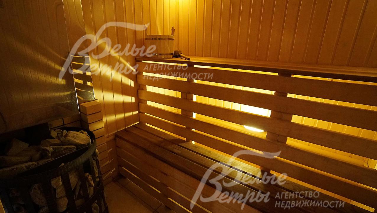 Дополнительные строения: Баня 1-этажная, 23 кв.м, в стиле дома: парная с печью "Везувий" (русская, типа каменка), комната отдыха 11 кв.м, с/узел 2 кв.м, душ 4 кв.м. Отделка парной - липа. Мебель - деревянная, массив.
