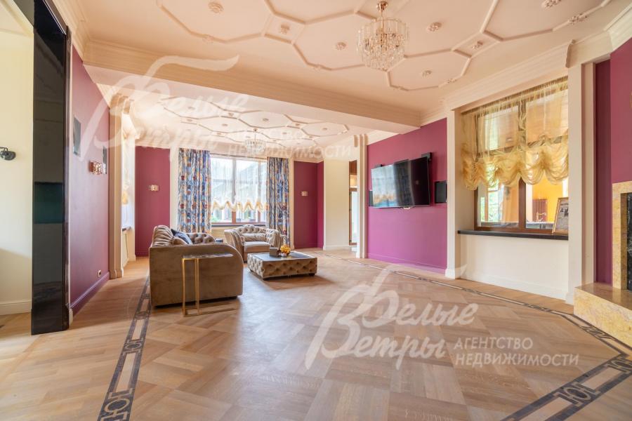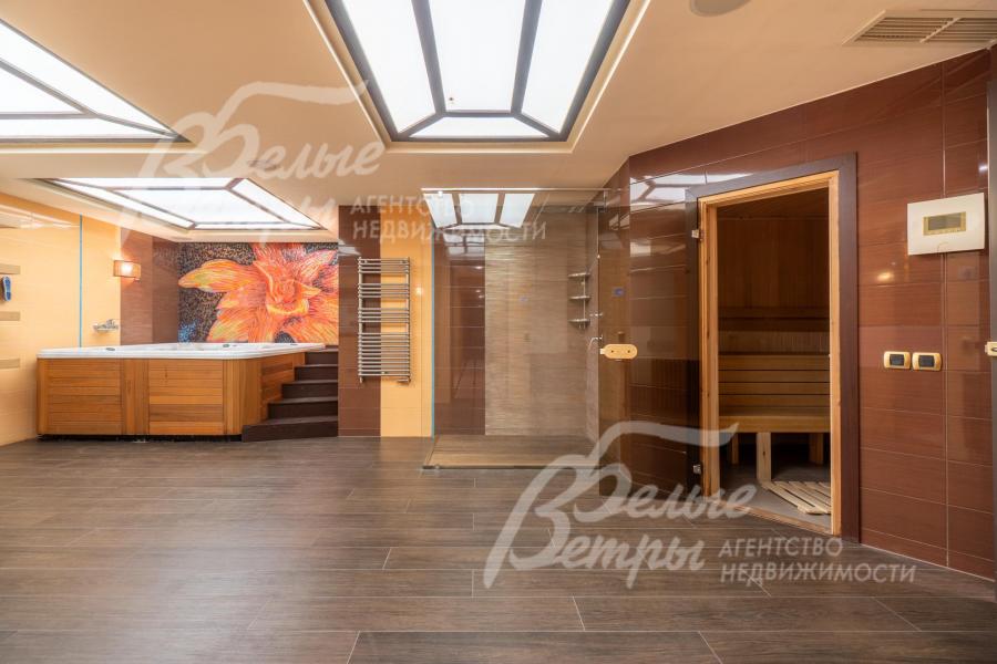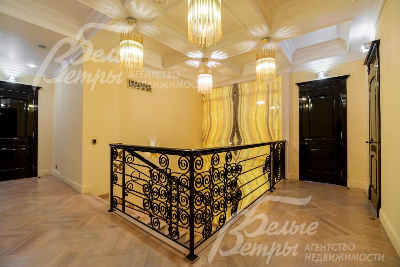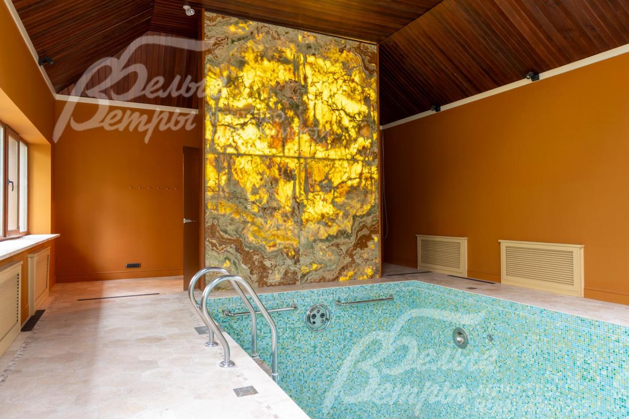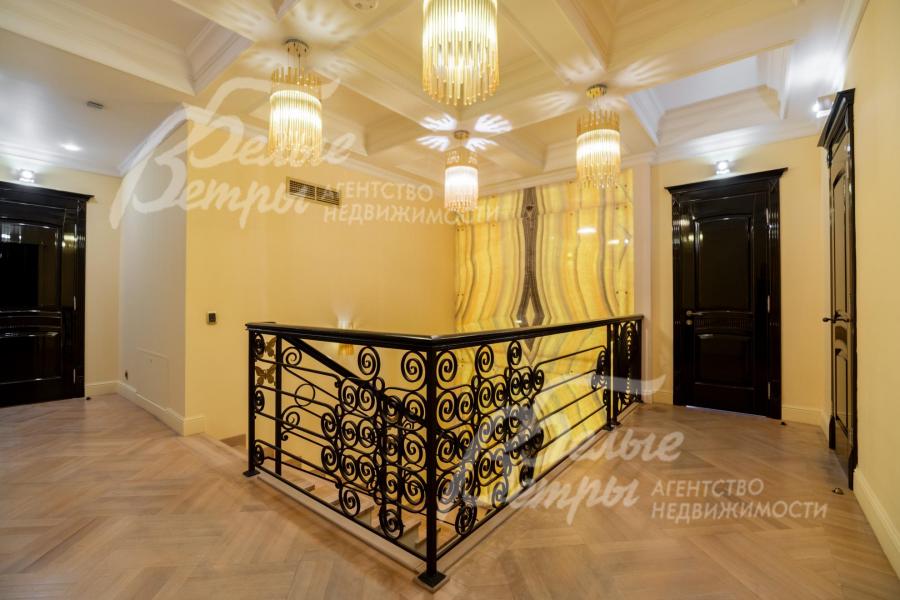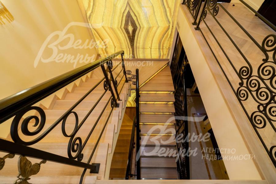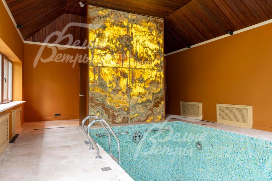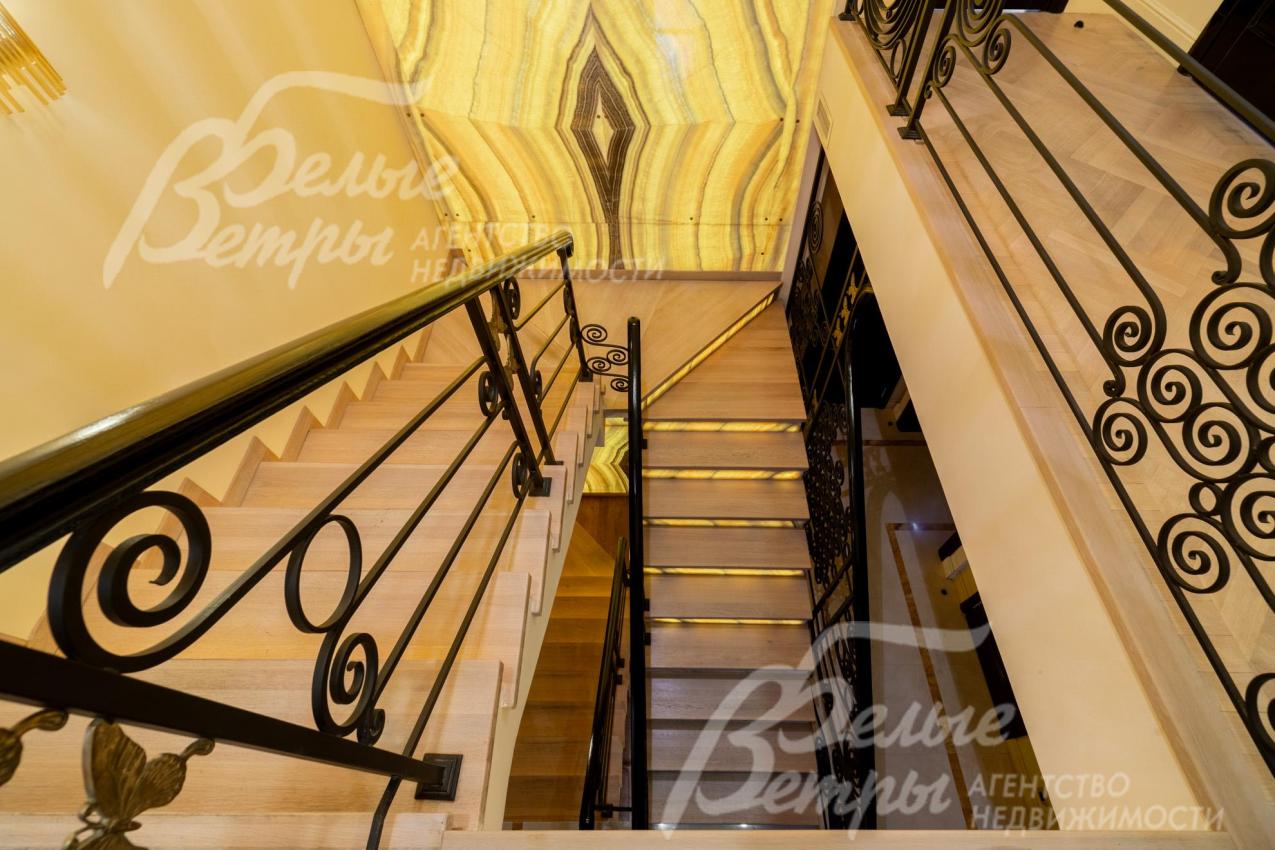 Описание внутренней отделки: интерьер выполнен по индивидуальному проекту в духе ар-деко с учётом современных тенденций дизайна. В оформлении помещений сочетаются премиальные натуральные материалы: мрамор, травертин, оникс, паркет из разных видов дерева, массив ангарской сосны. На стенах спален – коллекционные английские обои Nina Campbell, в санузлах – мрамор и импортная плитка, стены других помещений окрашены. Напольное покрытие в комнатах – наборный паркет из разных пород дерева, например, в кабинете – паркет из ясеня; в парадном холле первого этажа - изысканное панно, созданное из различных видов мрамора с полудрагоценными камнями; в зоне бассейна и барбекю на полу – травертин, в других помещениях – мрамор и керамогранит. Отделка потолка включает основу из гипсокартона, выразительные кессонные конструкции и богатый декор с элементами художественной лепнины; в зоне бассейна и тёплой террасы (барбекю) – потолок из термолиственницы. Оникс, привезённый по заказу из Италии, создаёт уникальный интерьер лестничного холла: композиционный акцент – изысканное панно из слэба оникса на стене, стилистическое единство продолжается в ониксовой отделке подступенков главной лестницы с эффектной подсветкой. Основание лестницы – бетонное, ступени отделаны дубом, ограждение – кованый орнамент (ручная работа) «цветущий сад» в канонах ар-деко. По дому установлены люксовые итальянские выключатели и датчики движения Bticino, радиаторы Arbonia, межкомнатные двери из массива ангарской сосны высотой 2,1 м, изготовленные на заказ, подоконники из искусственного камня и мраморные подоконники в зоне бассейна. В пространстве гостиной размещён открытый камин с вытяжным вентилятором и мраморным порталом, рядом с гостиной – зона отдыха с аквариумом во всю стену (0,8×3 м), на тёплой террасе (барбекю) – стена-водопад. Зелёный оникс, привезённый из Пакистана, украшает зону бассейна: на стене – панно из оникса 4×3 м с подсветкой, ониксом отделаны панели, закрывающие осушители. Чаша бассейна длиной более 20 м – с римским входом, противотоком, акварелаксом и водопадом. Добавляют свет в зоне бассейна 6 больших окон. Под плиткой и в санузлах – водяные тёплые полы. На кухне, гостиной, тёплой террасе, в зоне бассейне и на мансарде – пульты управления системы мультизвука (воспроизводится радио, можно подключить смартфон). В гостиной – домашний кинотеатр с сабвуфером и усилителем (колонки смонтированы в стенах). В комнате отдыха спа-зоны – большая джакузи. Сауна отделана абашем, в ней установлена электрическая печь EOS. Интерьер дополняет многоуровневая система освещения с люстрами, светильниками, встроенной подсветкой (также есть внешняя новогодняя иллюминация). Терраса – с маркизой, управление – с помощью пульта, маркиза автоматически убирается по датчику силы ветра