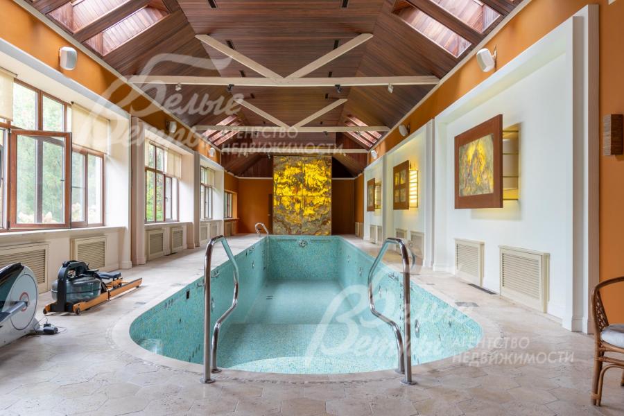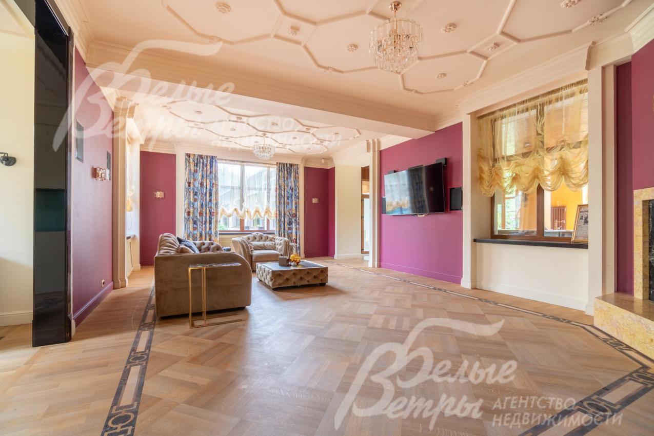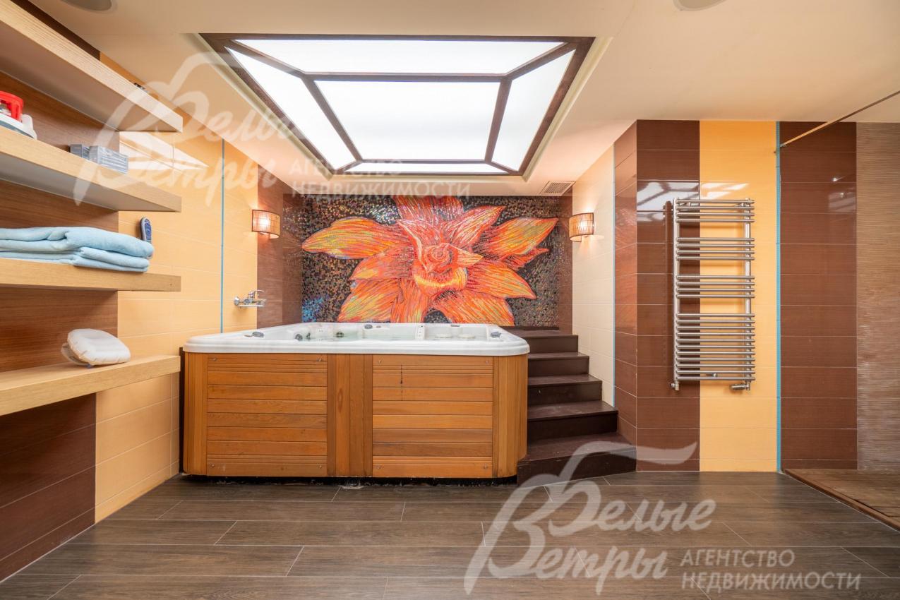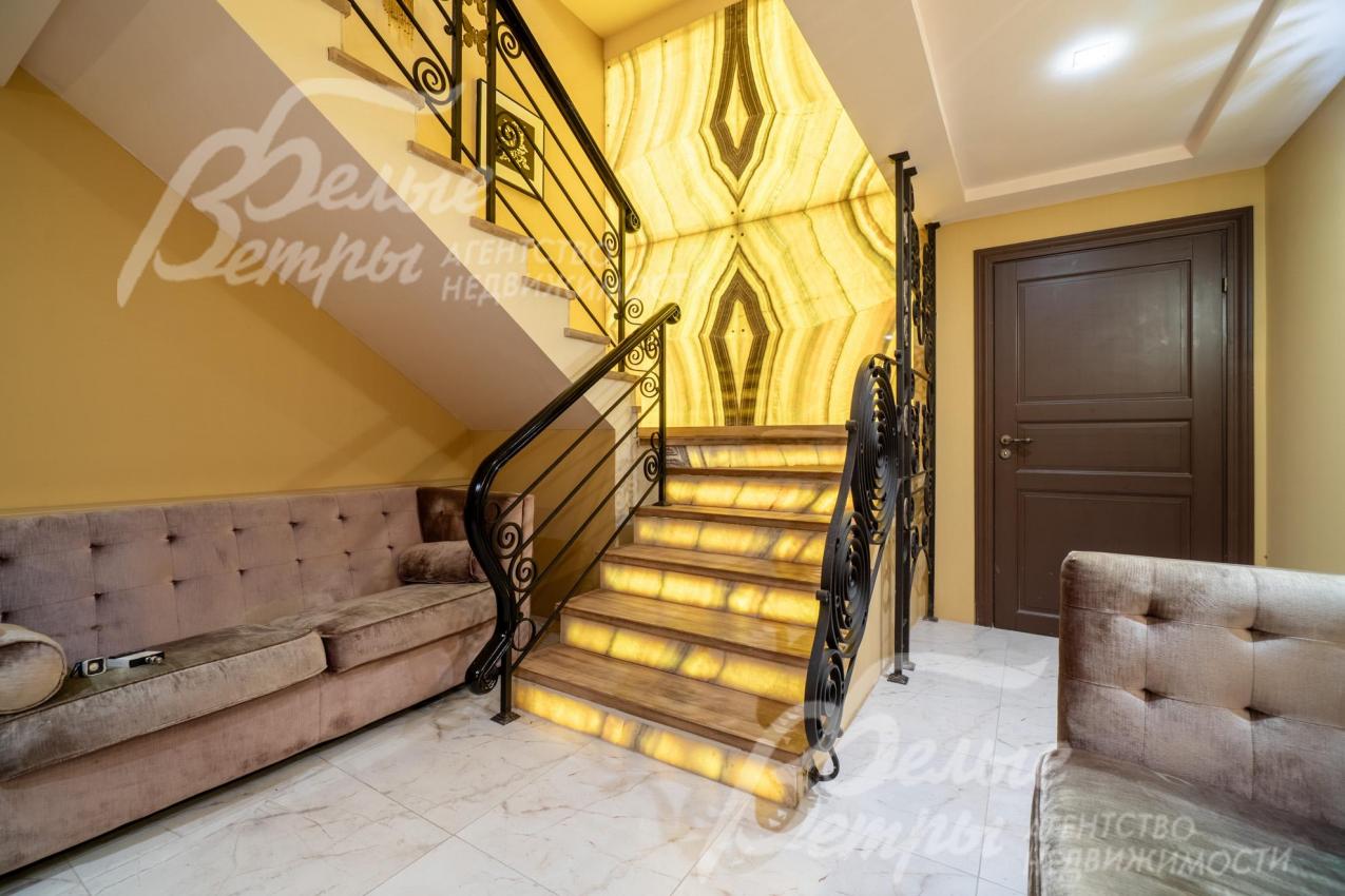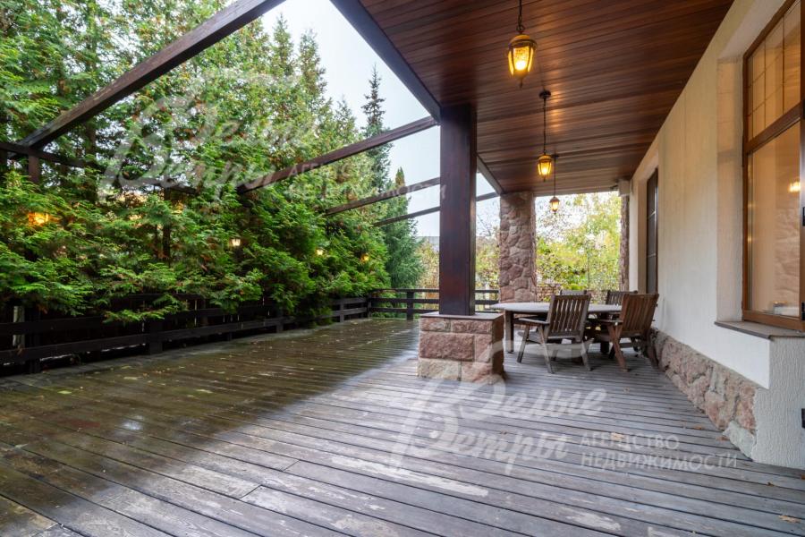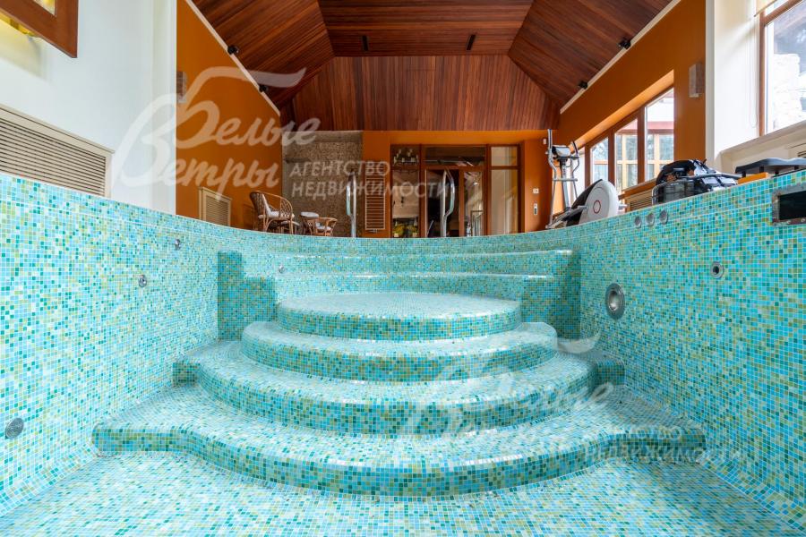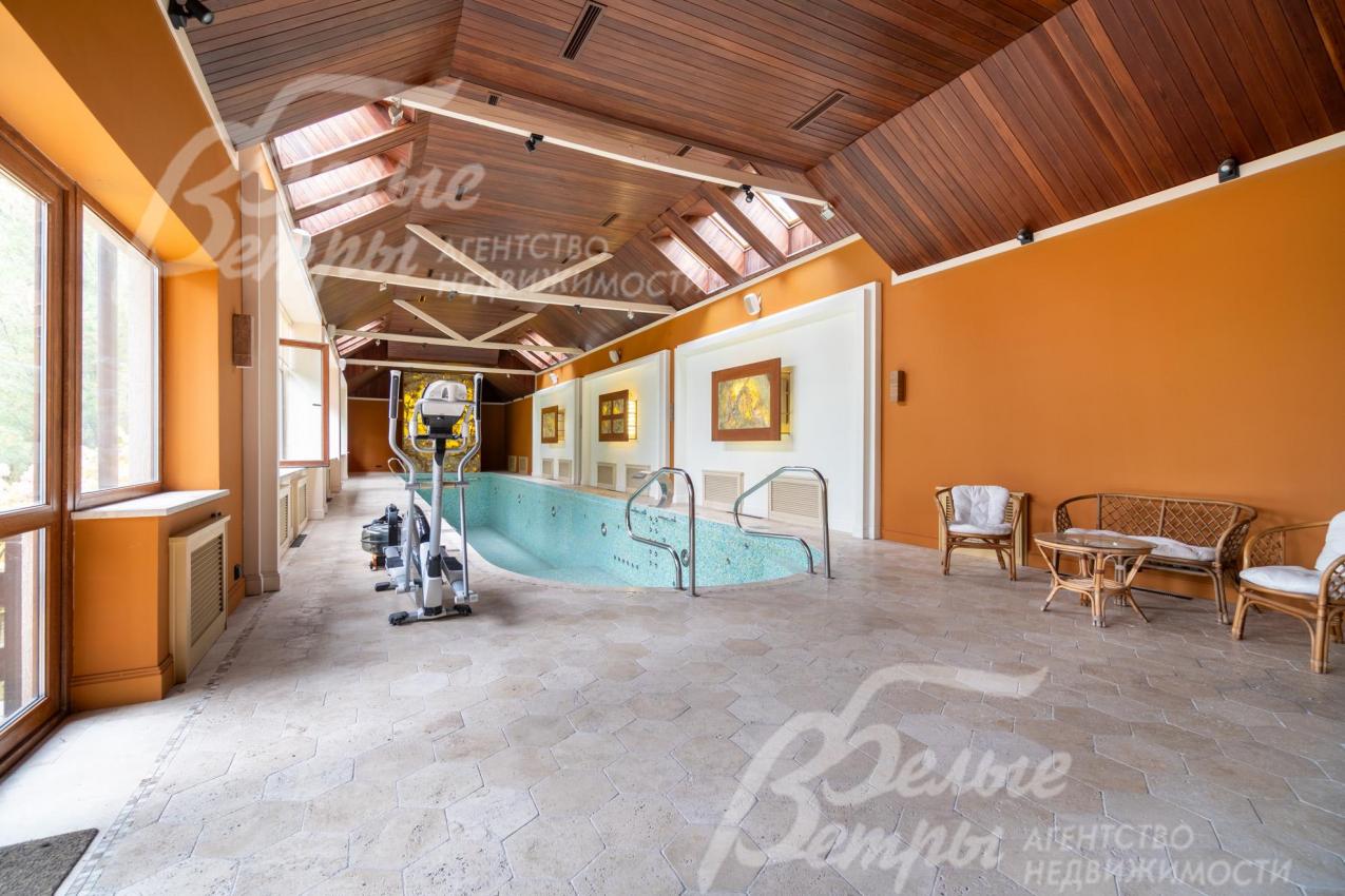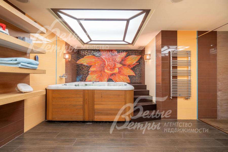 Описание внутренней отделки: интерьер выполнен по индивидуальному проекту в духе ар-деко с учётом современных тенденций дизайна. В оформлении помещений сочетаются премиальные натуральные материалы: мрамор, травертин, оникс, паркет из разных видов дерева, массив ангарской сосны. На стенах спален – коллекционные английские обои Nina Campbell, в санузлах – мрамор и импортная плитка, стены других помещений окрашены. Напольное покрытие в комнатах – наборный паркет из разных пород дерева, например, в кабинете – паркет из ясеня; в парадном холле первого этажа - изысканное панно, созданное из различных видов мрамора с полудрагоценными камнями; в зоне бассейна и барбекю на полу – травертин, в других помещениях – мрамор и керамогранит. Отделка потолка включает основу из гипсокартона, выразительные кессонные конструкции и богатый декор с элементами художественной лепнины; в зоне бассейна и тёплой террасы (барбекю) – потолок из термолиственницы. Оникс, привезённый по заказу из Италии, создаёт уникальный интерьер лестничного холла: композиционный акцент – изысканное панно из слэба оникса на стене, стилистическое единство продолжается в ониксовой отделке подступенков главной лестницы с эффектной подсветкой. Основание лестницы – бетонное, ступени отделаны дубом, ограждение – кованый орнамент (ручная работа) «цветущий сад» в канонах ар-деко. По дому установлены люксовые итальянские выключатели и датчики движения Bticino, радиаторы Arbonia, межкомнатные двери из массива ангарской сосны высотой 2,1 м, изготовленные на заказ, подоконники из искусственного камня и мраморные подоконники в зоне бассейна. В пространстве гостиной размещён открытый камин с вытяжным вентилятором и мраморным порталом, рядом с гостиной – зона отдыха с аквариумом во всю стену (0,8×3 м), на тёплой террасе (барбекю) – стена-водопад. Зелёный оникс, привезённый из Пакистана, украшает зону бассейна: на стене – панно из оникса 4×3 м с подсветкой, ониксом отделаны панели, закрывающие осушители. Чаша бассейна длиной более 20 м – с римским входом, противотоком, акварелаксом и водопадом. Добавляют свет в зоне бассейна 6 больших окон. Под плиткой и в санузлах – водяные тёплые полы. На кухне, гостиной, тёплой террасе, в зоне бассейне и на мансарде – пульты управления системы мультизвука (воспроизводится радио, можно подключить смартфон). В гостиной – домашний кинотеатр с сабвуфером и усилителем (колонки смонтированы в стенах). В комнате отдыха спа-зоны – большая джакузи. Сауна отделана абашем, в ней установлена электрическая печь EOS. Интерьер дополняет многоуровневая система освещения с люстрами, светильниками, встроенной подсветкой (также есть внешняя новогодняя иллюминация). Терраса – с маркизой, управление – с помощью пульта, маркиза автоматически убирается по датчику силы ветра