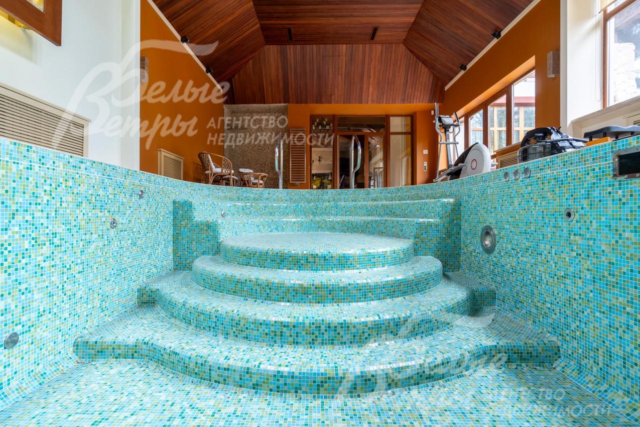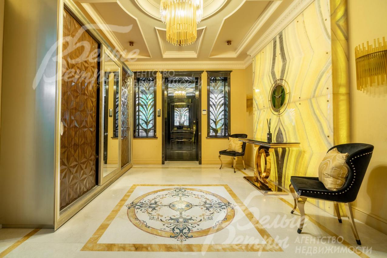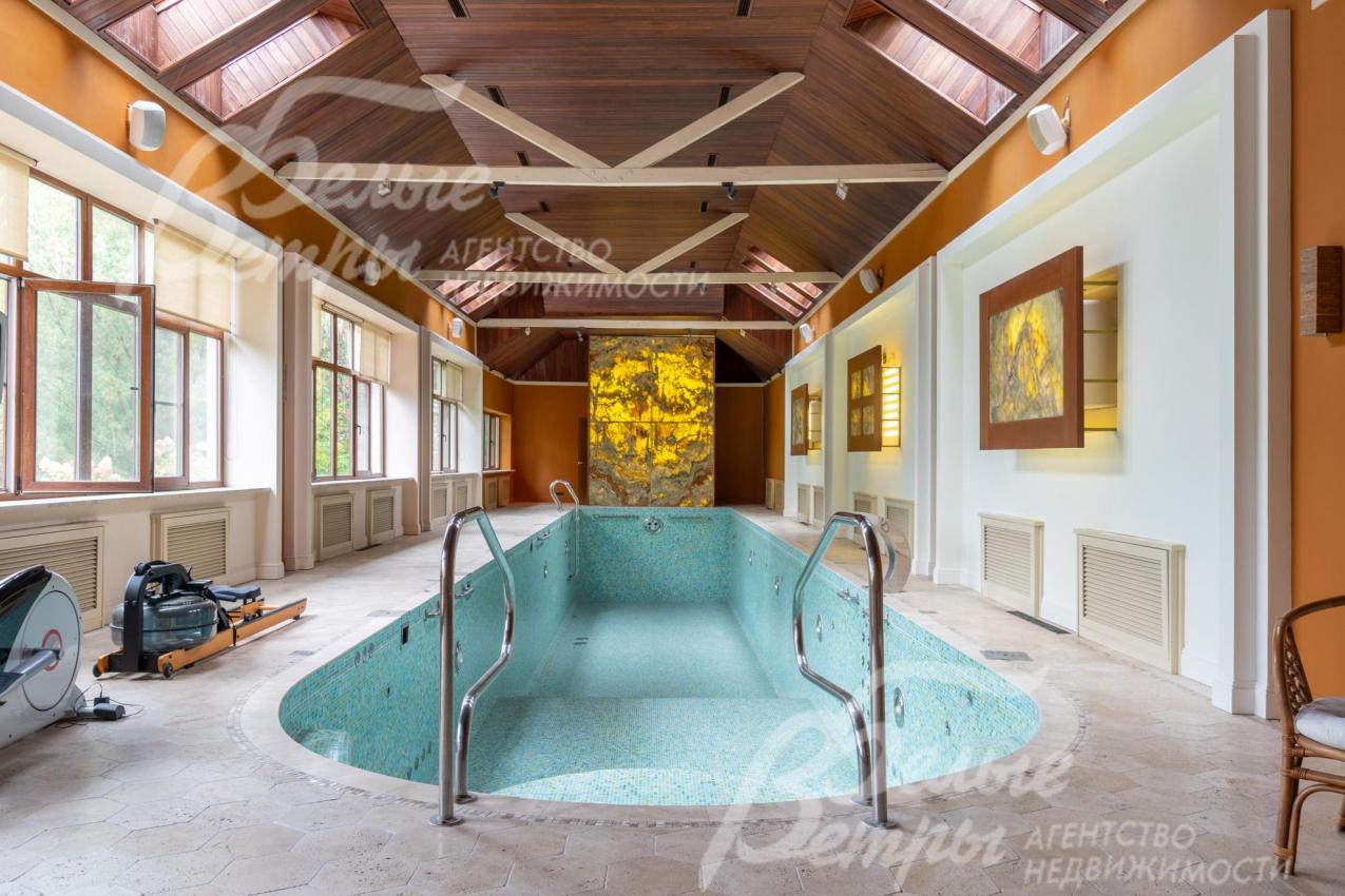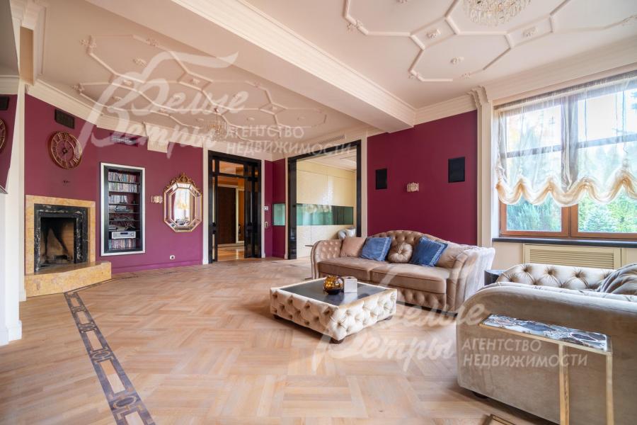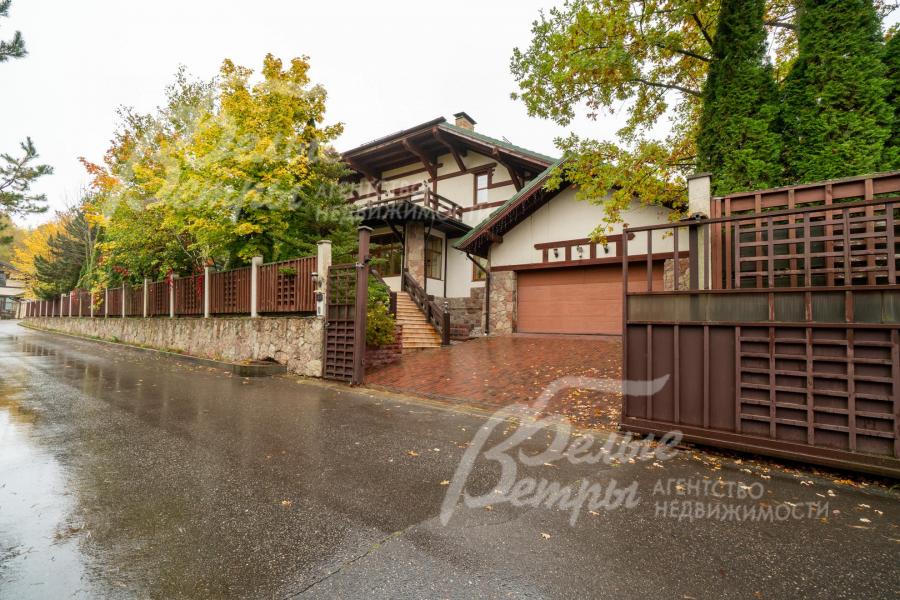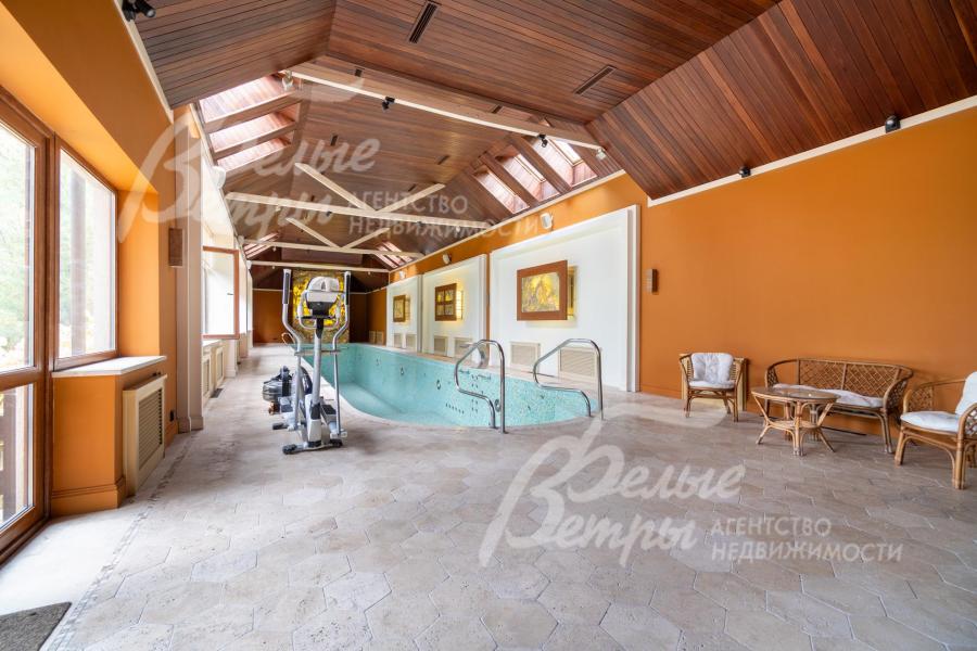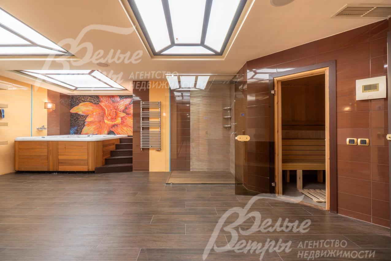 Описание внутренней отделки: интерьер выполнен по индивидуальному проекту в духе ар-деко с учётом современных тенденций дизайна. В оформлении помещений сочетаются премиальные натуральные материалы: мрамор, травертин, оникс, паркет из разных видов дерева, массив ангарской сосны. На стенах спален – коллекционные английские обои Nina Campbell, в санузлах – мрамор и импортная плитка, стены других помещений окрашены. Напольное покрытие в комнатах – наборный паркет из разных пород дерева, например, в кабинете – паркет из ясеня; в парадном холле первого этажа - изысканное панно, созданное из различных видов мрамора с полудрагоценными камнями; в зоне бассейна и барбекю на полу – травертин, в других помещениях – мрамор и керамогранит. Отделка потолка включает основу из гипсокартона, выразительные кессонные конструкции и богатый декор с элементами художественной лепнины; в зоне бассейна и тёплой террасы (барбекю) – потолок из термолиственницы. Оникс, привезённый по заказу из Италии, создаёт уникальный интерьер лестничного холла: композиционный акцент – изысканное панно из слэба оникса на стене, стилистическое единство продолжается в ониксовой отделке подступенков главной лестницы с эффектной подсветкой. Основание лестницы – бетонное, ступени отделаны дубом, ограждение – кованый орнамент (ручная работа) «цветущий сад» в канонах ар-деко. По дому установлены люксовые итальянские выключатели и датчики движения Bticino, радиаторы Arbonia, межкомнатные двери из массива ангарской сосны высотой 2,1 м, изготовленные на заказ, подоконники из искусственного камня и мраморные подоконники в зоне бассейна. В пространстве гостиной размещён открытый камин с вытяжным вентилятором и мраморным порталом, рядом с гостиной – зона отдыха с аквариумом во всю стену (0,8×3 м), на тёплой террасе (барбекю) – стена-водопад. Зелёный оникс, привезённый из Пакистана, украшает зону бассейна: на стене – панно из оникса 4×3 м с подсветкой, ониксом отделаны панели, закрывающие осушители. Чаша бассейна длиной более 20 м – с римским входом, противотоком, акварелаксом и водопадом. Добавляют свет в зоне бассейна 6 больших окон. Под плиткой и в санузлах – водяные тёплые полы. На кухне, гостиной, тёплой террасе, в зоне бассейне и на мансарде – пульты управления системы мультизвука (воспроизводится радио, можно подключить смартфон). В гостиной – домашний кинотеатр с сабвуфером и усилителем (колонки смонтированы в стенах). В комнате отдыха спа-зоны – большая джакузи. Сауна отделана абашем, в ней установлена электрическая печь EOS. Интерьер дополняет многоуровневая система освещения с люстрами, светильниками, встроенной подсветкой (также есть внешняя новогодняя иллюминация). Терраса – с маркизой, управление – с помощью пульта, маркиза автоматически убирается по датчику силы ветра