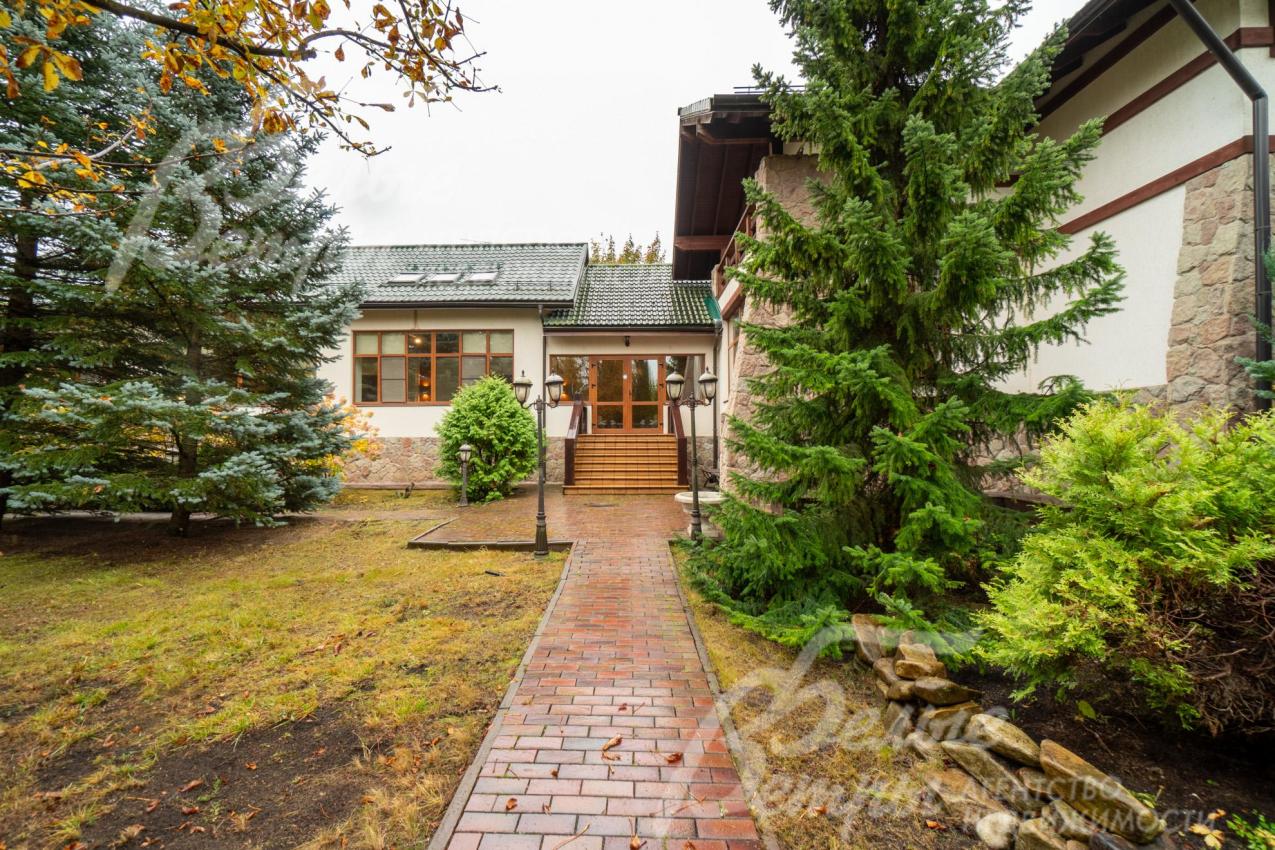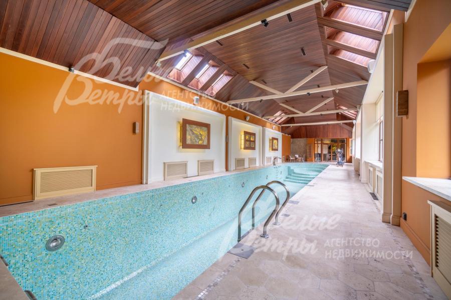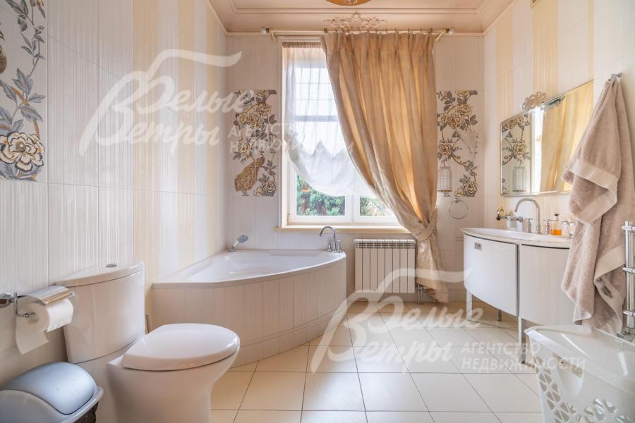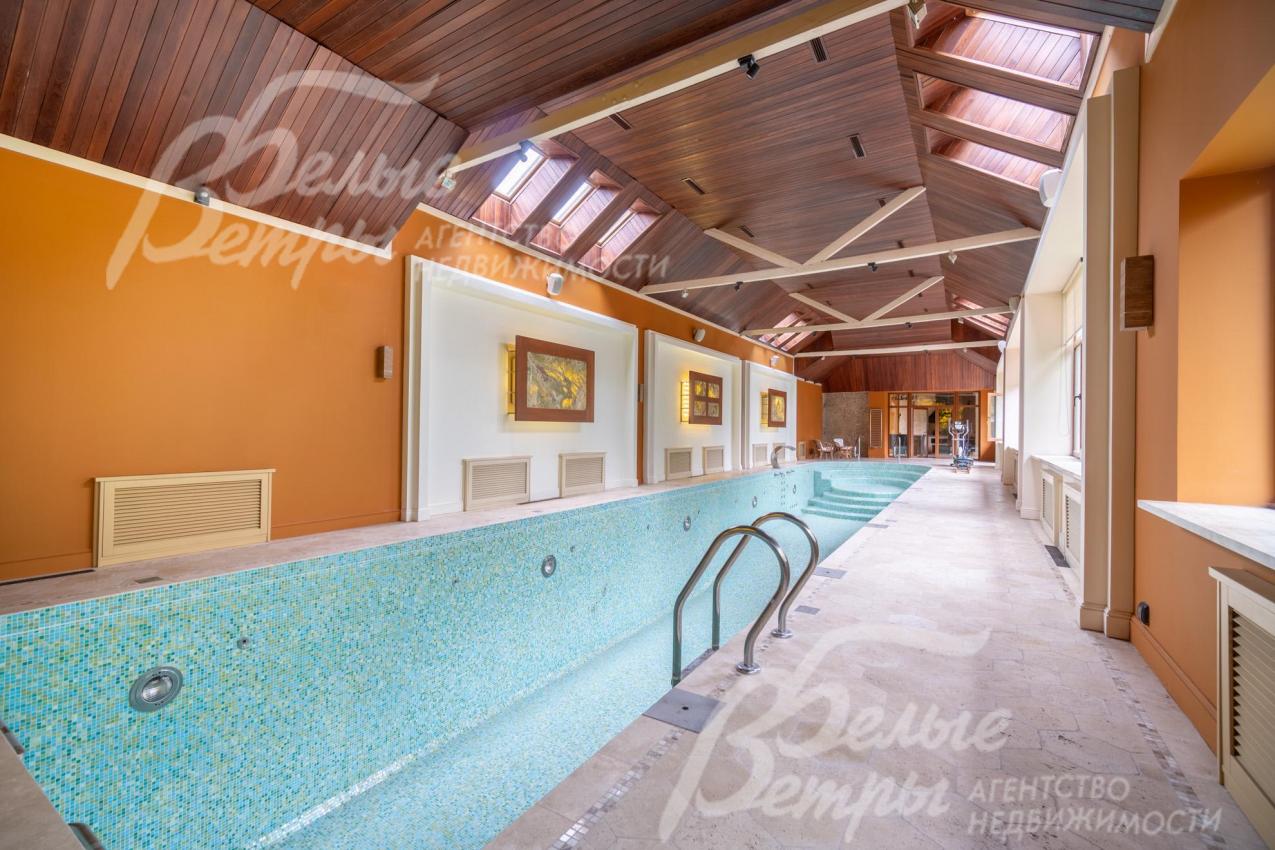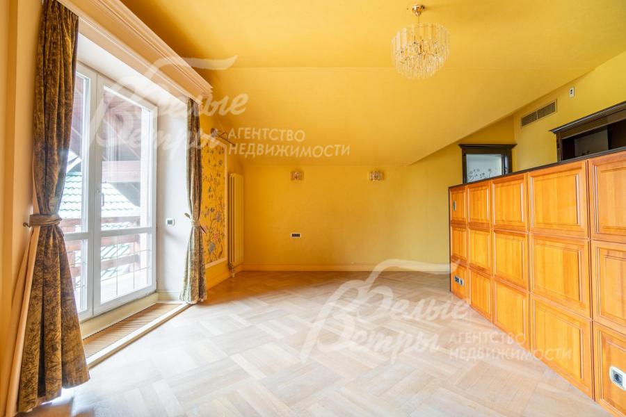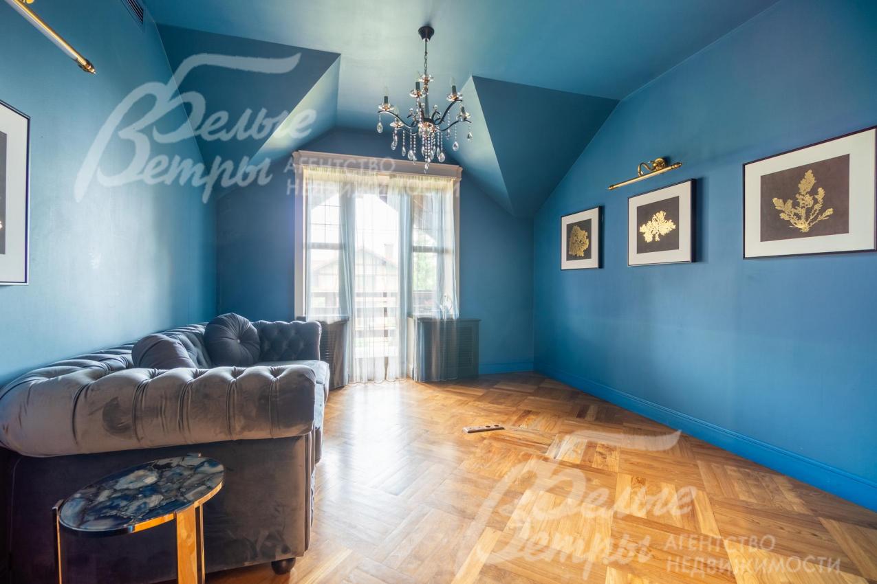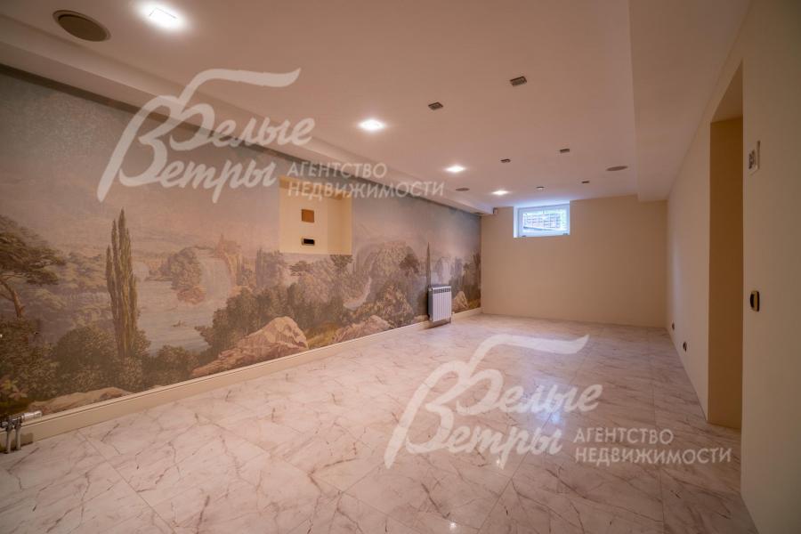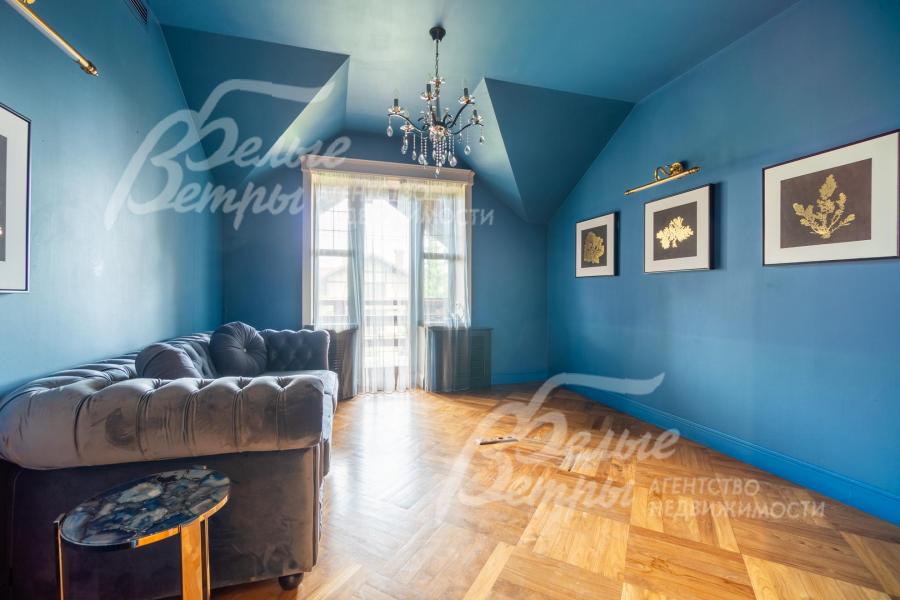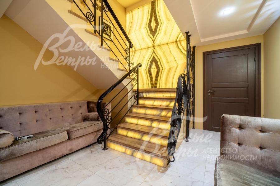 Описание внутренней отделки: интерьер выполнен по индивидуальному проекту в духе ар-деко с учётом современных тенденций дизайна. В оформлении помещений сочетаются премиальные натуральные материалы: мрамор, травертин, оникс, паркет из разных видов дерева, массив ангарской сосны. На стенах спален – коллекционные английские обои Nina Campbell, в санузлах – мрамор и импортная плитка, стены других помещений окрашены. Напольное покрытие в комнатах – наборный паркет из разных пород дерева, например, в кабинете – паркет из ясеня; в парадном холле первого этажа - изысканное панно, созданное из различных видов мрамора с полудрагоценными камнями; в зоне бассейна и барбекю на полу – травертин, в других помещениях – мрамор и керамогранит. Отделка потолка включает основу из гипсокартона, выразительные кессонные конструкции и богатый декор с элементами художественной лепнины; в зоне бассейна и тёплой террасы (барбекю) – потолок из термолиственницы. Оникс, привезённый по заказу из Италии, создаёт уникальный интерьер лестничного холла: композиционный акцент – изысканное панно из слэба оникса на стене, стилистическое единство продолжается в ониксовой отделке подступенков главной лестницы с эффектной подсветкой. Основание лестницы – бетонное, ступени отделаны дубом, ограждение – кованый орнамент (ручная работа) «цветущий сад» в канонах ар-деко. По дому установлены люксовые итальянские выключатели и датчики движения Bticino, радиаторы Arbonia, межкомнатные двери из массива ангарской сосны высотой 2,1 м, изготовленные на заказ, подоконники из искусственного камня и мраморные подоконники в зоне бассейна. В пространстве гостиной размещён открытый камин с вытяжным вентилятором и мраморным порталом, рядом с гостиной – зона отдыха с аквариумом во всю стену (0,8×3 м), на тёплой террасе (барбекю) – стена-водопад. Зелёный оникс, привезённый из Пакистана, украшает зону бассейна: на стене – панно из оникса 4×3 м с подсветкой, ониксом отделаны панели, закрывающие осушители. Чаша бассейна длиной более 20 м – с римским входом, противотоком, акварелаксом и водопадом. Добавляют свет в зоне бассейна 6 больших окон. Под плиткой и в санузлах – водяные тёплые полы. На кухне, гостиной, тёплой террасе, в зоне бассейне и на мансарде – пульты управления системы мультизвука (воспроизводится радио, можно подключить смартфон). В гостиной – домашний кинотеатр с сабвуфером и усилителем (колонки смонтированы в стенах). В комнате отдыха спа-зоны – большая джакузи. Сауна отделана абашем, в ней установлена электрическая печь EOS. Интерьер дополняет многоуровневая система освещения с люстрами, светильниками, встроенной подсветкой (также есть внешняя новогодняя иллюминация). Терраса – с маркизой, управление – с помощью пульта, маркиза автоматически убирается по датчику силы ветра