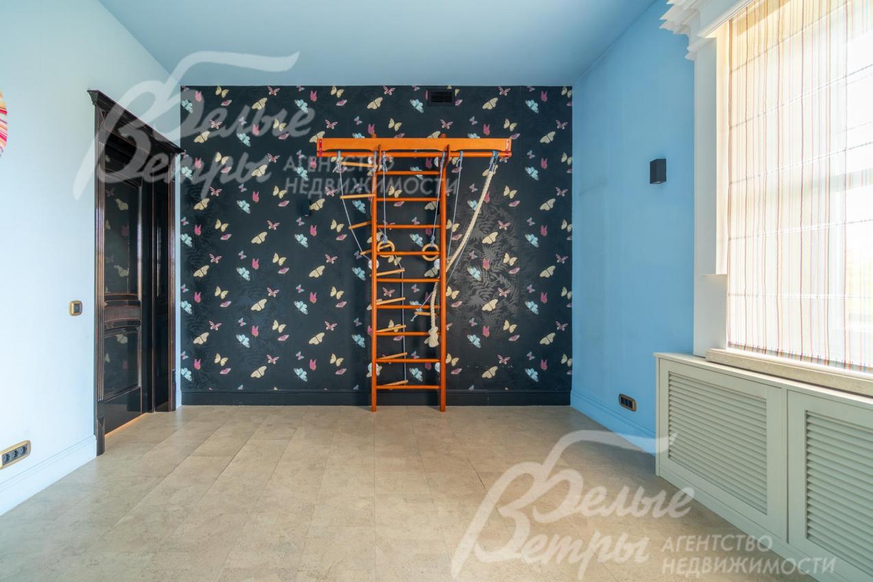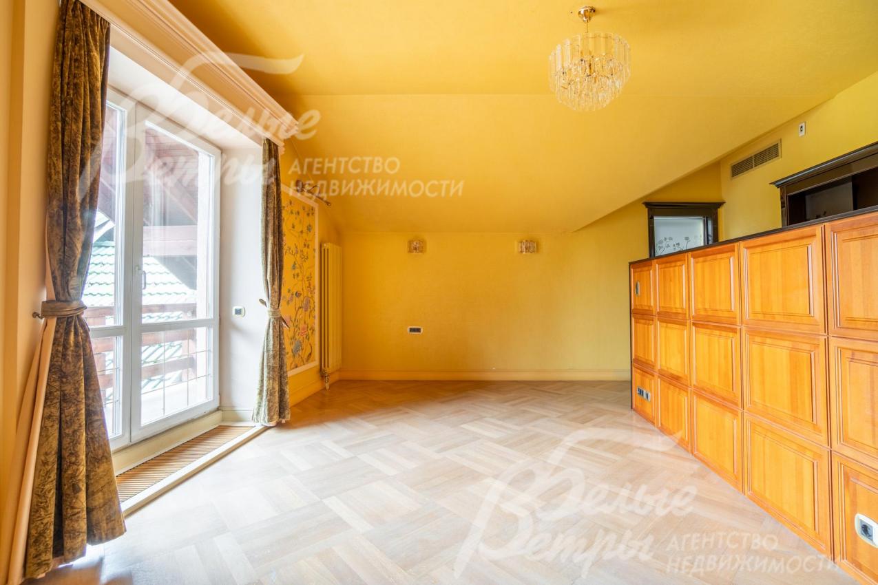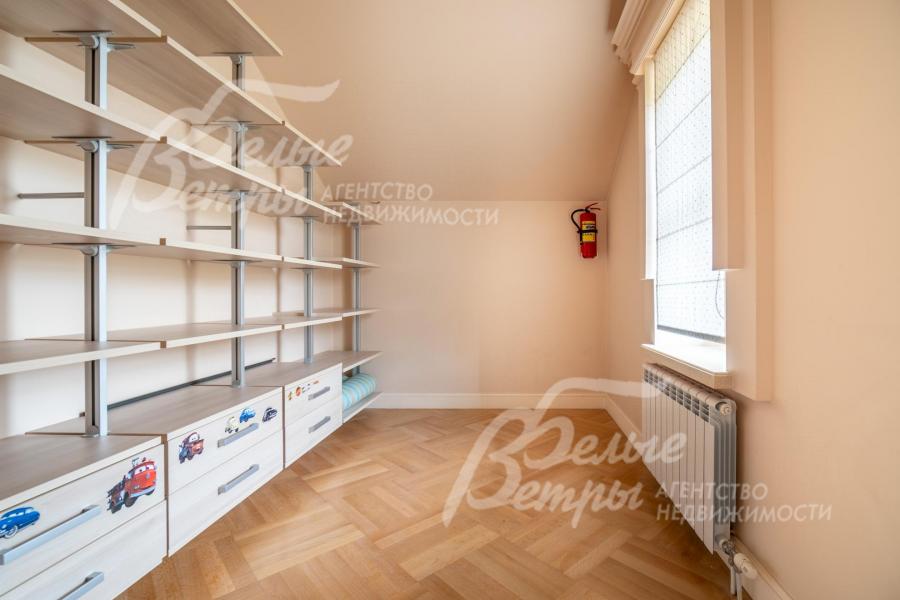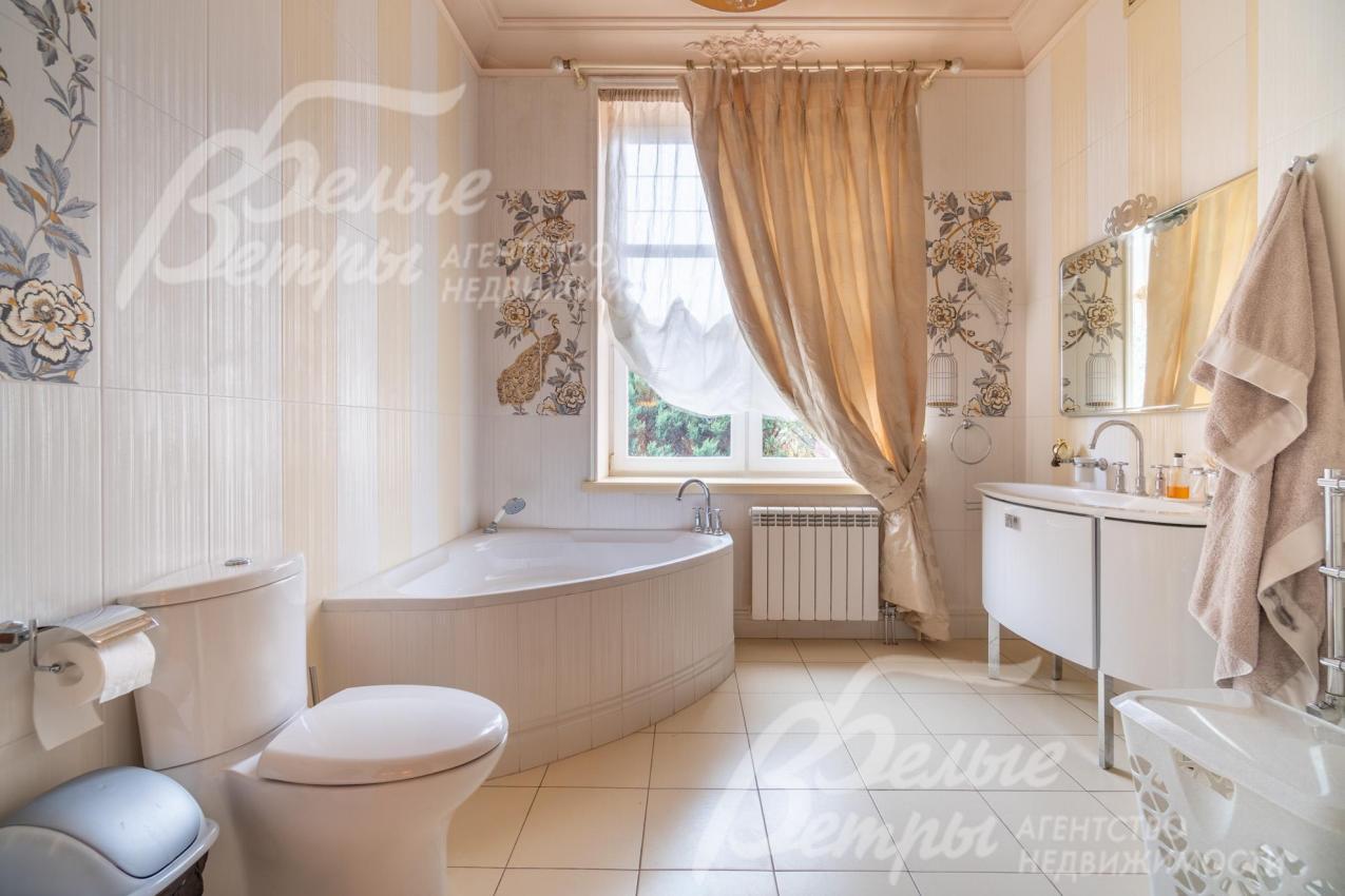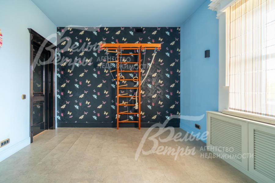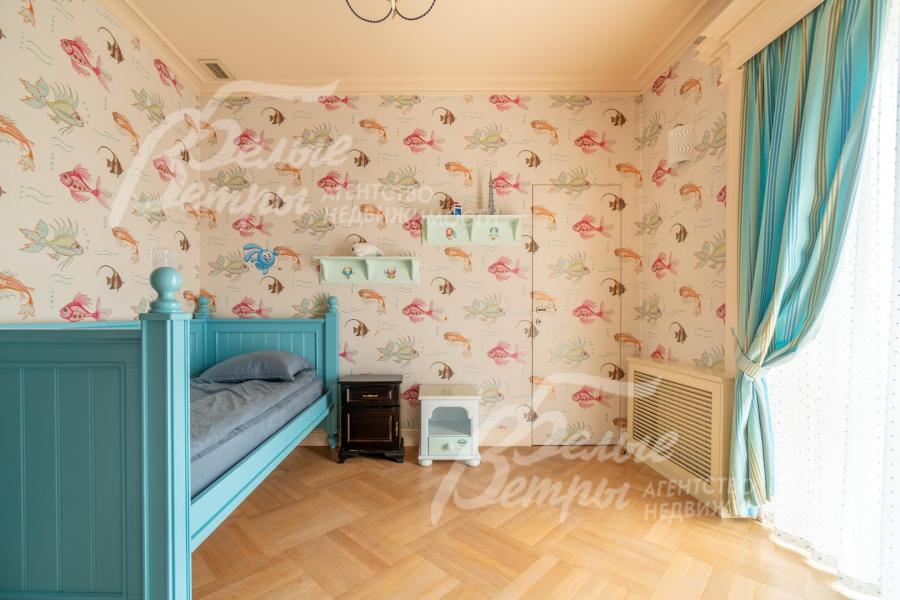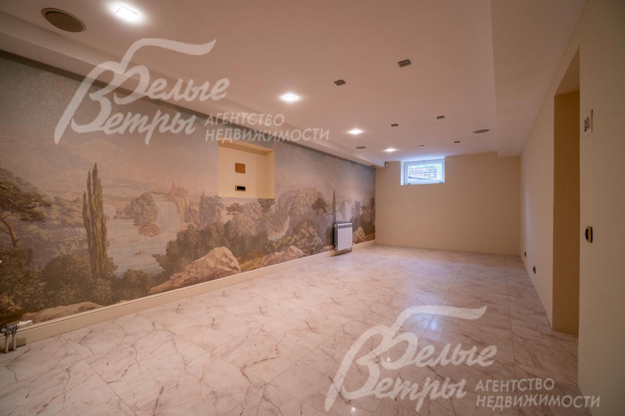 Описание внутренней отделки: интерьер выполнен по индивидуальному проекту в духе ар-деко с учётом современных тенденций дизайна. В оформлении помещений сочетаются премиальные натуральные материалы: мрамор, травертин, оникс, паркет из разных видов дерева, массив ангарской сосны. На стенах спален – коллекционные английские обои Nina Campbell, в санузлах – мрамор и импортная плитка, стены других помещений окрашены. Напольное покрытие в комнатах – наборный паркет из разных пород дерева, например, в кабинете – паркет из ясеня; в парадном холле первого этажа - изысканное панно, созданное из различных видов мрамора с полудрагоценными камнями; в зоне бассейна и барбекю на полу – травертин, в других помещениях – мрамор и керамогранит. Отделка потолка включает основу из гипсокартона, выразительные кессонные конструкции и богатый декор с элементами художественной лепнины; в зоне бассейна и тёплой террасы (барбекю) – потолок из термолиственницы. Оникс, привезённый по заказу из Италии, создаёт уникальный интерьер лестничного холла: композиционный акцент – изысканное панно из слэба оникса на стене, стилистическое единство продолжается в ониксовой отделке подступенков главной лестницы с эффектной подсветкой. Основание лестницы – бетонное, ступени отделаны дубом, ограждение – кованый орнамент (ручная работа) «цветущий сад» в канонах ар-деко. По дому установлены люксовые итальянские выключатели и датчики движения Bticino, радиаторы Arbonia, межкомнатные двери из массива ангарской сосны высотой 2,1 м, изготовленные на заказ, подоконники из искусственного камня и мраморные подоконники в зоне бассейна. В пространстве гостиной размещён открытый камин с вытяжным вентилятором и мраморным порталом, рядом с гостиной – зона отдыха с аквариумом во всю стену (0,8×3 м), на тёплой террасе (барбекю) – стена-водопад. Зелёный оникс, привезённый из Пакистана, украшает зону бассейна: на стене – панно из оникса 4×3 м с подсветкой, ониксом отделаны панели, закрывающие осушители. Чаша бассейна длиной более 20 м – с римским входом, противотоком, акварелаксом и водопадом. Добавляют свет в зоне бассейна 6 больших окон. Под плиткой и в санузлах – водяные тёплые полы. На кухне, гостиной, тёплой террасе, в зоне бассейне и на мансарде – пульты управления системы мультизвука (воспроизводится радио, можно подключить смартфон). В гостиной – домашний кинотеатр с сабвуфером и усилителем (колонки смонтированы в стенах). В комнате отдыха спа-зоны – большая джакузи. Сауна отделана абашем, в ней установлена электрическая печь EOS. Интерьер дополняет многоуровневая система освещения с люстрами, светильниками, встроенной подсветкой (также есть внешняя новогодняя иллюминация). Терраса – с маркизой, управление – с помощью пульта, маркиза автоматически убирается по датчику силы ветра