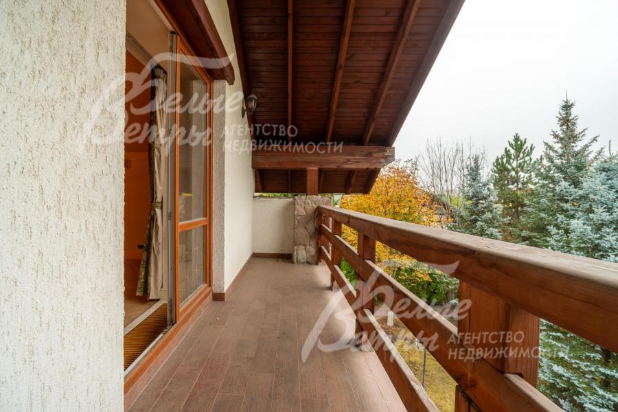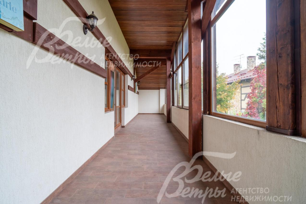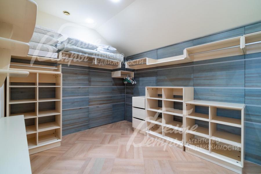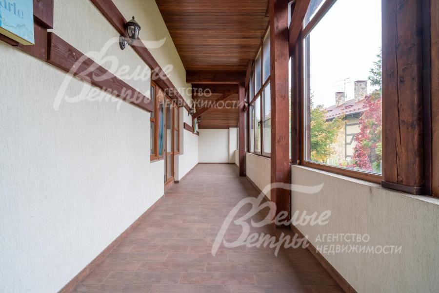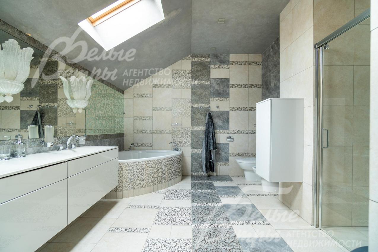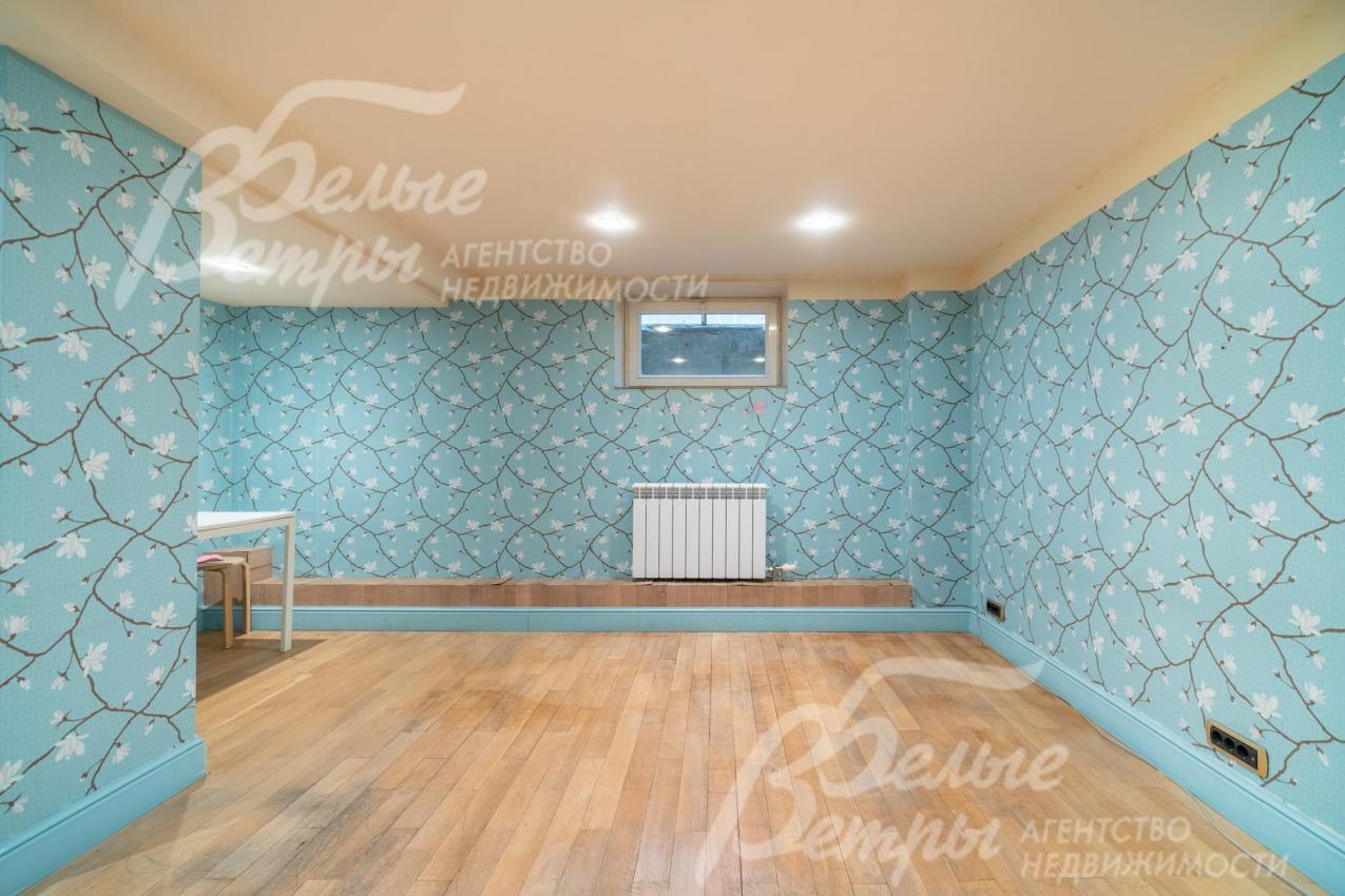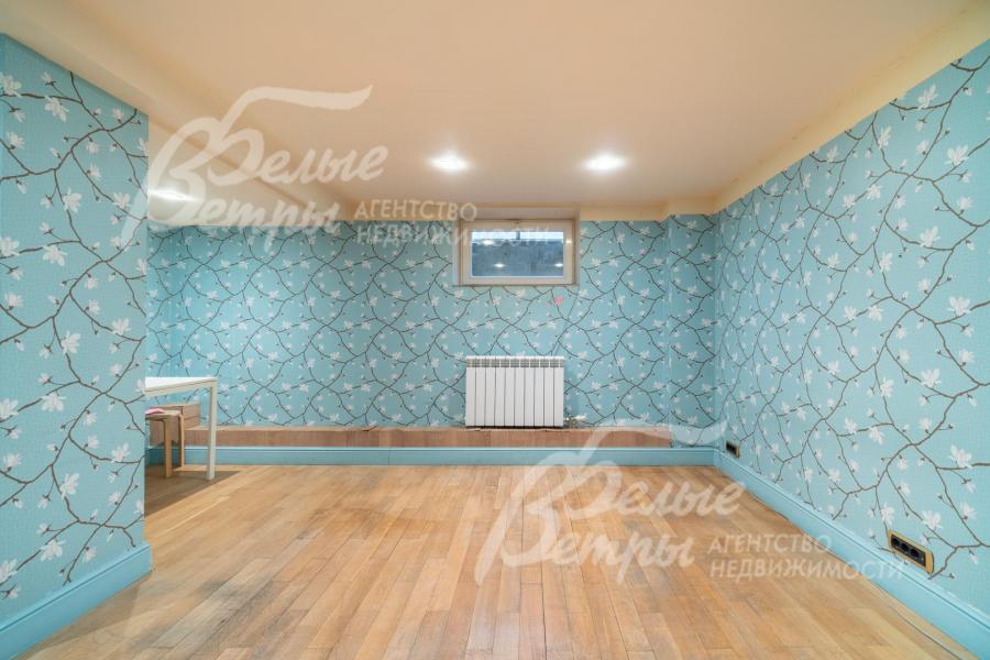 Описание внутренней отделки: интерьер выполнен по индивидуальному проекту в духе ар-деко с учётом современных тенденций дизайна. В оформлении помещений сочетаются премиальные натуральные материалы: мрамор, травертин, оникс, паркет из разных видов дерева, массив ангарской сосны. На стенах спален – коллекционные английские обои Nina Campbell, в санузлах – мрамор и импортная плитка, стены других помещений окрашены. Напольное покрытие в комнатах – наборный паркет из разных пород дерева, например, в кабинете – паркет из ясеня; в парадном холле первого этажа - изысканное панно, созданное из различных видов мрамора с полудрагоценными камнями; в зоне бассейна и барбекю на полу – травертин, в других помещениях – мрамор и керамогранит. Отделка потолка включает основу из гипсокартона, выразительные кессонные конструкции и богатый декор с элементами художественной лепнины; в зоне бассейна и тёплой террасы (барбекю) – потолок из термолиственницы. Оникс, привезённый по заказу из Италии, создаёт уникальный интерьер лестничного холла: композиционный акцент – изысканное панно из слэба оникса на стене, стилистическое единство продолжается в ониксовой отделке подступенков главной лестницы с эффектной подсветкой. Основание лестницы – бетонное, ступени отделаны дубом, ограждение – кованый орнамент (ручная работа) «цветущий сад» в канонах ар-деко. По дому установлены люксовые итальянские выключатели и датчики движения Bticino, радиаторы Arbonia, межкомнатные двери из массива ангарской сосны высотой 2,1 м, изготовленные на заказ, подоконники из искусственного камня и мраморные подоконники в зоне бассейна. В пространстве гостиной размещён открытый камин с вытяжным вентилятором и мраморным порталом, рядом с гостиной – зона отдыха с аквариумом во всю стену (0,8×3 м), на тёплой террасе (барбекю) – стена-водопад. Зелёный оникс, привезённый из Пакистана, украшает зону бассейна: на стене – панно из оникса 4×3 м с подсветкой, ониксом отделаны панели, закрывающие осушители. Чаша бассейна длиной более 20 м – с римским входом, противотоком, акварелаксом и водопадом. Добавляют свет в зоне бассейна 6 больших окон. Под плиткой и в санузлах – водяные тёплые полы. На кухне, гостиной, тёплой террасе, в зоне бассейне и на мансарде – пульты управления системы мультизвука (воспроизводится радио, можно подключить смартфон). В гостиной – домашний кинотеатр с сабвуфером и усилителем (колонки смонтированы в стенах). В комнате отдыха спа-зоны – большая джакузи. Сауна отделана абашем, в ней установлена электрическая печь EOS. Интерьер дополняет многоуровневая система освещения с люстрами, светильниками, встроенной подсветкой (также есть внешняя новогодняя иллюминация). Терраса – с маркизой, управление – с помощью пульта, маркиза автоматически убирается по датчику силы ветра