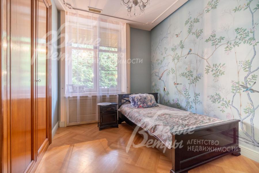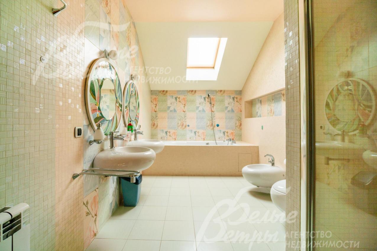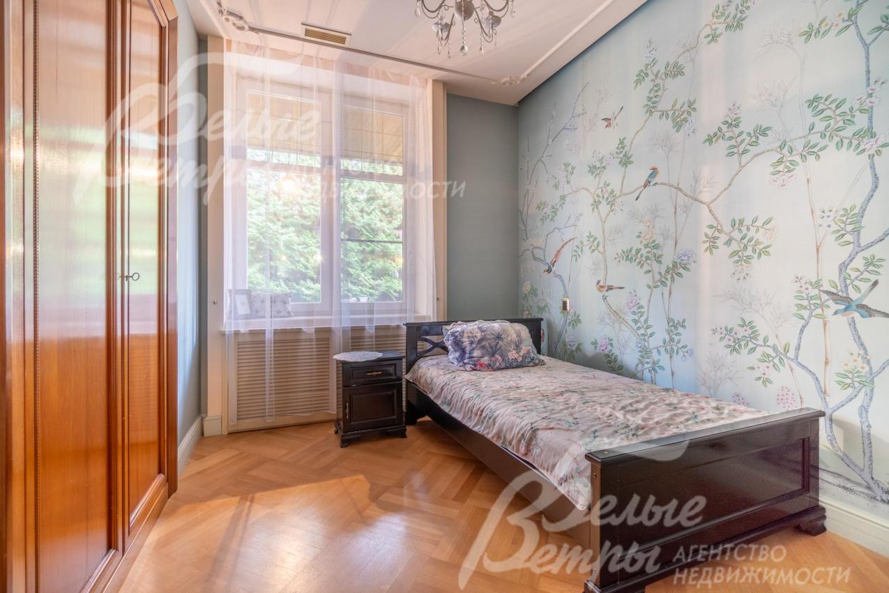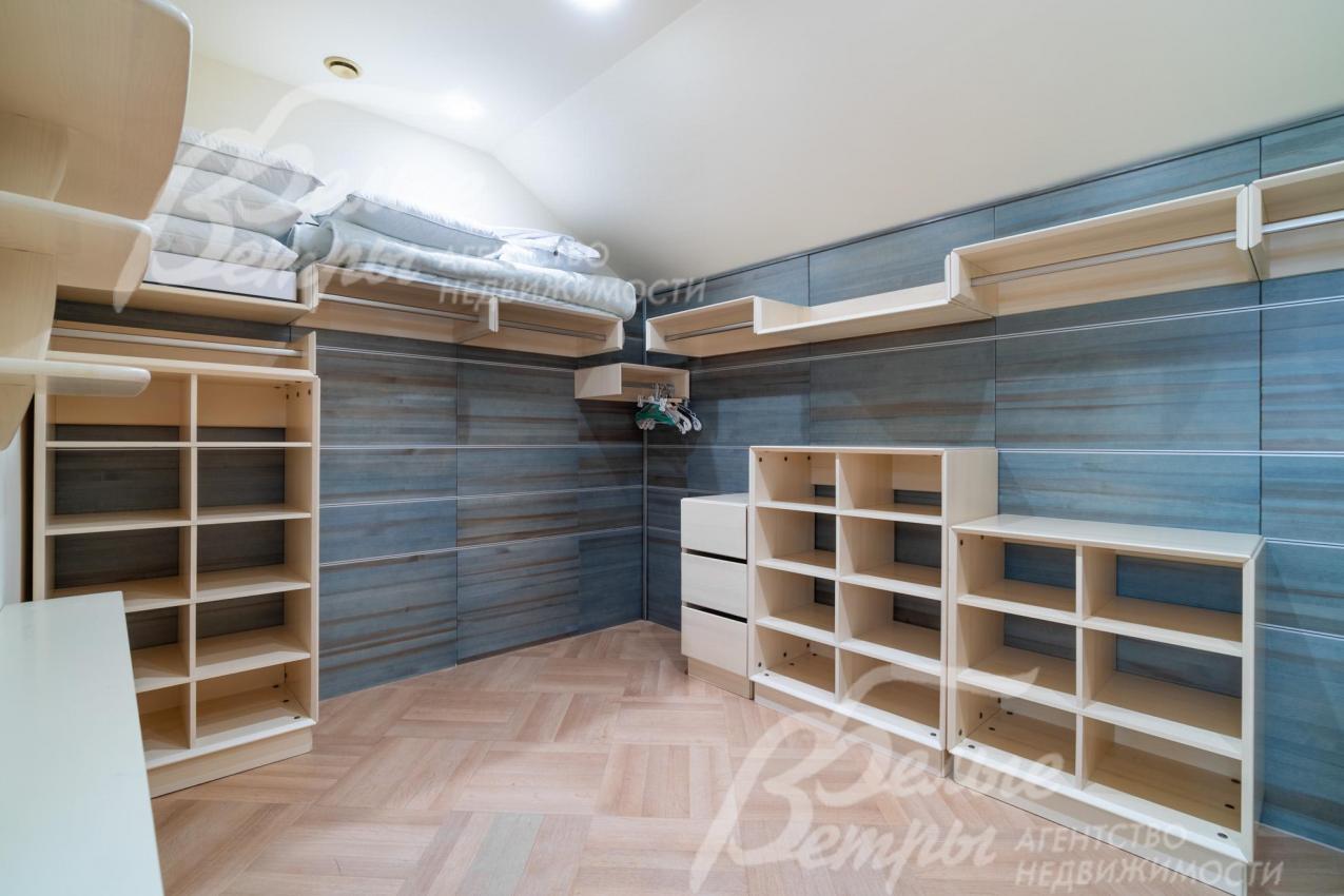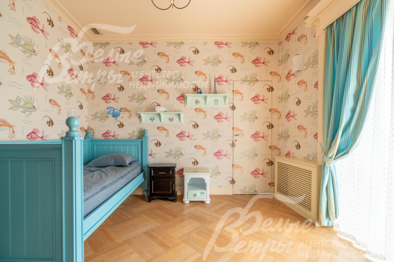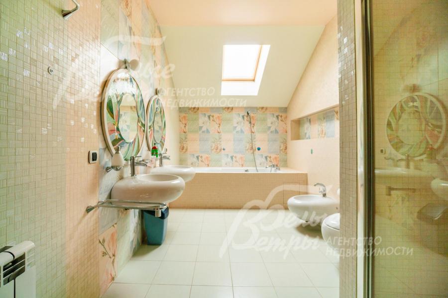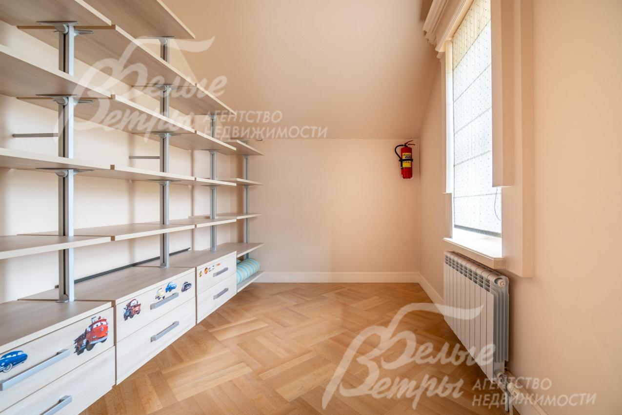 Описание внутренней отделки: интерьер выполнен по индивидуальному проекту в духе ар-деко с учётом современных тенденций дизайна. В оформлении помещений сочетаются премиальные натуральные материалы: мрамор, травертин, оникс, паркет из разных видов дерева, массив ангарской сосны. На стенах спален – коллекционные английские обои Nina Campbell, в санузлах – мрамор и импортная плитка, стены других помещений окрашены. Напольное покрытие в комнатах – наборный паркет из разных пород дерева, например, в кабинете – паркет из ясеня; в парадном холле первого этажа - изысканное панно, созданное из различных видов мрамора с полудрагоценными камнями; в зоне бассейна и барбекю на полу – травертин, в других помещениях – мрамор и керамогранит. Отделка потолка включает основу из гипсокартона, выразительные кессонные конструкции и богатый декор с элементами художественной лепнины; в зоне бассейна и тёплой террасы (барбекю) – потолок из термолиственницы. Оникс, привезённый по заказу из Италии, создаёт уникальный интерьер лестничного холла: композиционный акцент – изысканное панно из слэба оникса на стене, стилистическое единство продолжается в ониксовой отделке подступенков главной лестницы с эффектной подсветкой. Основание лестницы – бетонное, ступени отделаны дубом, ограждение – кованый орнамент (ручная работа) «цветущий сад» в канонах ар-деко. По дому установлены люксовые итальянские выключатели и датчики движения Bticino, радиаторы Arbonia, межкомнатные двери из массива ангарской сосны высотой 2,1 м, изготовленные на заказ, подоконники из искусственного камня и мраморные подоконники в зоне бассейна. В пространстве гостиной размещён открытый камин с вытяжным вентилятором и мраморным порталом, рядом с гостиной – зона отдыха с аквариумом во всю стену (0,8×3 м), на тёплой террасе (барбекю) – стена-водопад. Зелёный оникс, привезённый из Пакистана, украшает зону бассейна: на стене – панно из оникса 4×3 м с подсветкой, ониксом отделаны панели, закрывающие осушители. Чаша бассейна длиной более 20 м – с римским входом, противотоком, акварелаксом и водопадом. Добавляют свет в зоне бассейна 6 больших окон. Под плиткой и в санузлах – водяные тёплые полы. На кухне, гостиной, тёплой террасе, в зоне бассейне и на мансарде – пульты управления системы мультизвука (воспроизводится радио, можно подключить смартфон). В гостиной – домашний кинотеатр с сабвуфером и усилителем (колонки смонтированы в стенах). В комнате отдыха спа-зоны – большая джакузи. Сауна отделана абашем, в ней установлена электрическая печь EOS. Интерьер дополняет многоуровневая система освещения с люстрами, светильниками, встроенной подсветкой (также есть внешняя новогодняя иллюминация). Терраса – с маркизой, управление – с помощью пульта, маркиза автоматически убирается по датчику силы ветра