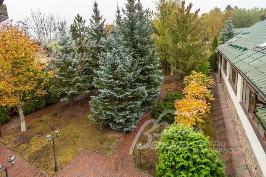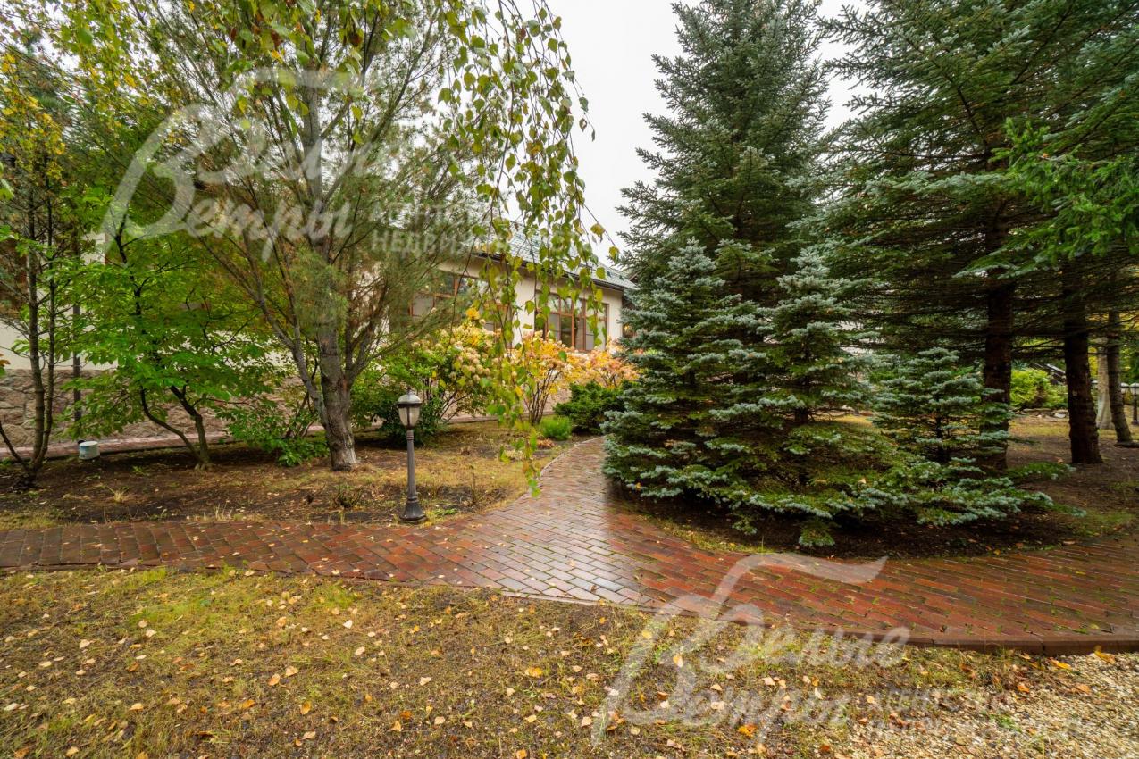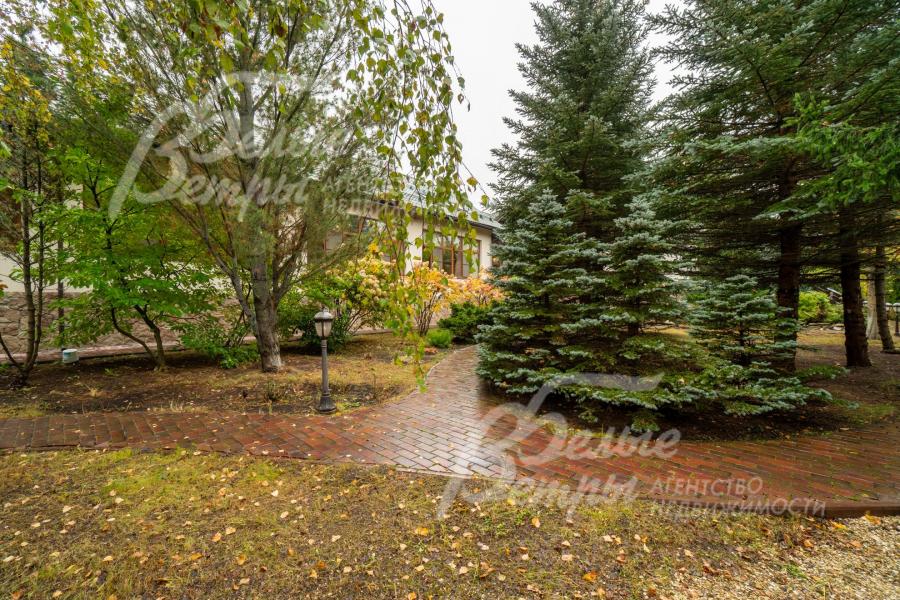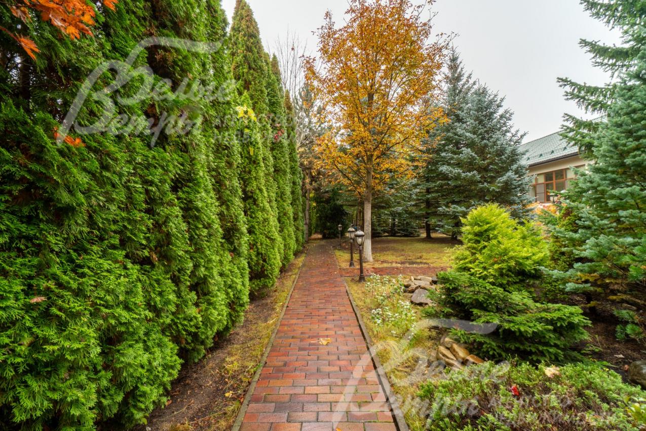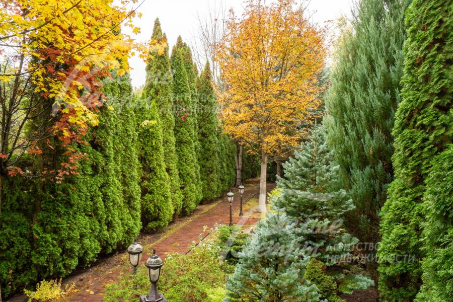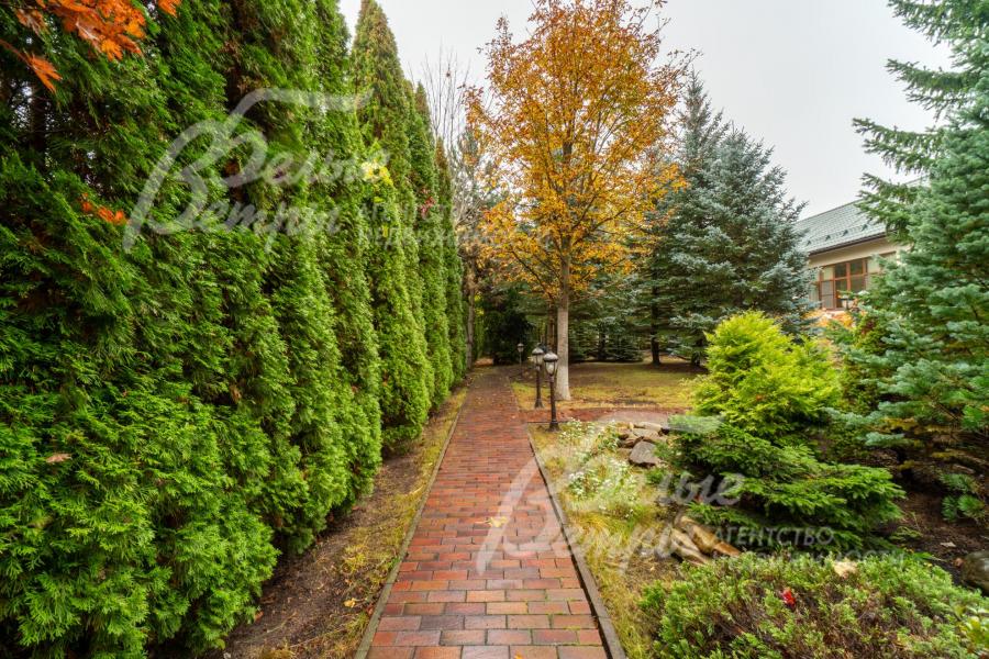 Благоустройство участка: территория благоустроена по авторскому ландшафтному проекту. Высажены взрослые хвойные деревья (5 голубых елей, сосны), можжевельники, березы, клены, каштан, дуб, плодовые деревья. Границы участка оформлены крупномерными туями (82 шт.), создающими естественную ограду. Зелёный ансамбль дополняют декоративные растения и кустарники (сирень, гортензии и другие), розарий. Дорожки уложены клинкерной брусчаткой и освещены (фонари включаются по датчику освещенности). По участку проходит дренажная система, соединённая с ливневой канализацией посёлка. Парковочная площадка вымощена клинкерной брусчаткой