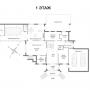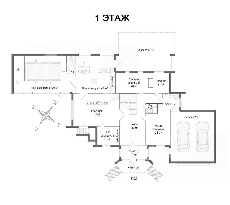 1-ый этаж: крыльцо, тамбур 10 кв.м, холл 33 кв.м, кухня-столовая 23 кв.м, гостиная 45 кв.м, зона аквариума 13 кв.м, спальня (кабинет) 20 кв.м, спальня 11 кв., гостевой санузел 5 кв.м, санузел 11 кв.м, зона бассейна 170 кв.м, тёплая терраса 43 кв.м, терраса 62 кв.м, гараж 42 кв.м