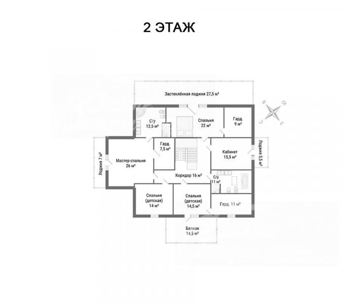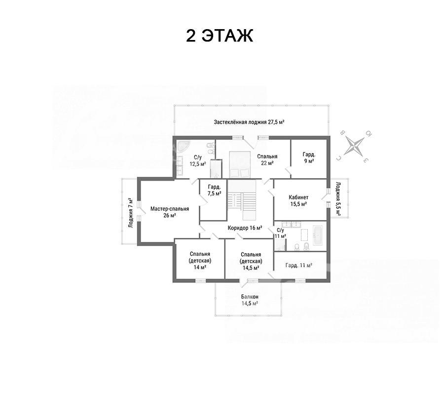 2-ой этаж: коридор 16 кв.м, мастер-спальня 26 кв.м с гардеробной 7,5 кв.м, санузлом 12,5 кв.м и выходом на лоджию 7 кв.м, спальня 14,5 кв.м с гардеробной 11 кв.м и выходом на балкон 14,5 кв.м, спальня 22 кв.м с гардеробной 9 кв.м и выходом на застеклённую лоджию 27,5 кв.м, спальня 14 кв.м, кабинет 15,5 кв.м с выходом на лоджию 5,5 кв.м, санузел 11 кв.м