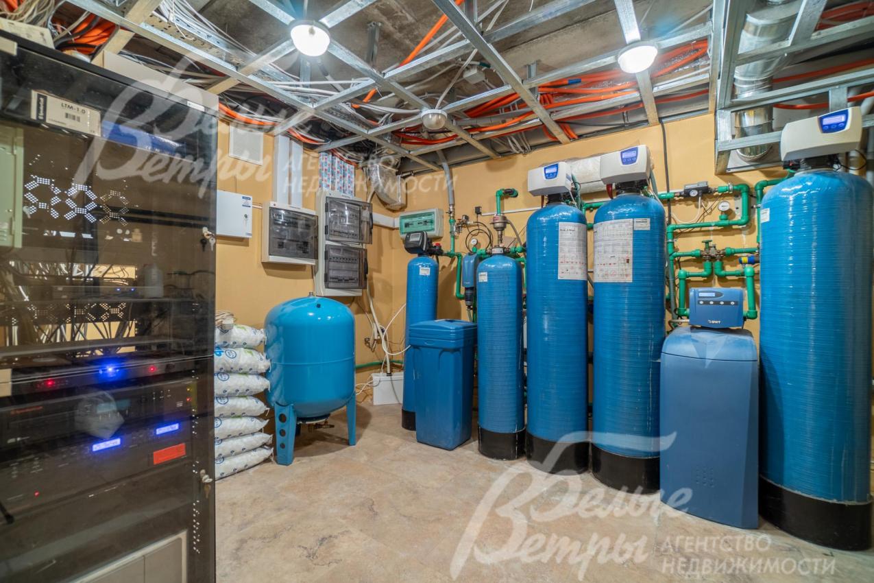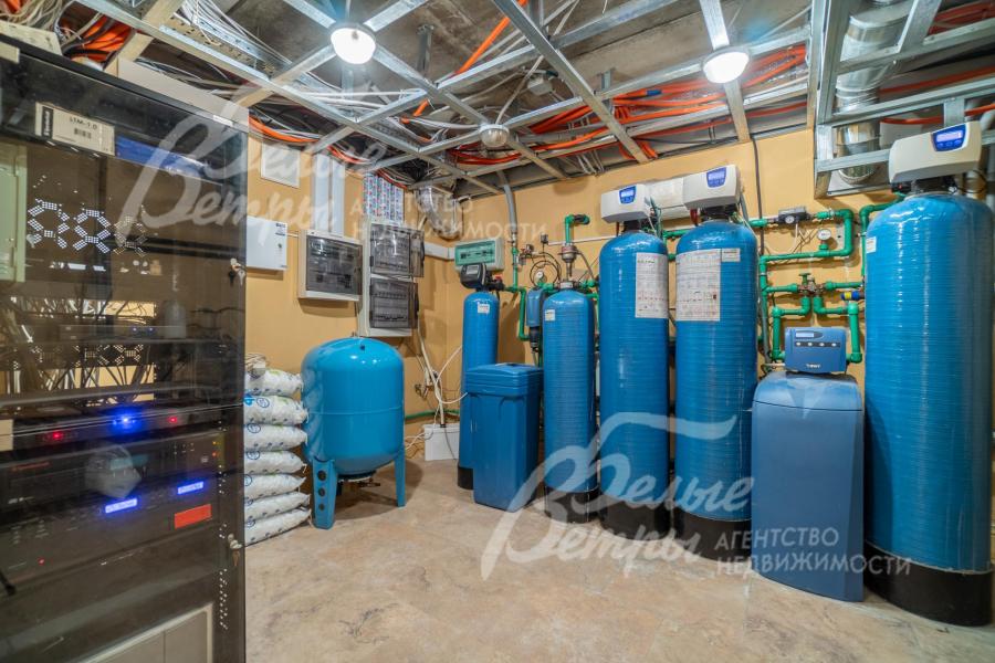 Инженерное обеспечение: отопление – через два газовых котла Vaillant мощностью 120 кВт каждый: датчик внешней температуры и автоматика котлов – с возможностью мониторинга и управления со смартфона. В системе энергообеспечения предусмотрен резервный генератор GESAN (Испания) мощностью 12 кВт, оснащённый автоматическим контролем и запуском при сбоях в подаче электроэнергии. Горячее водоснабжение – через бойлер Rapido (Германия) на 400 л. Смонтирована высокоэффективная система фильтрации воды с многоступенчатой очисткой, в том числе есть станция обезжелезивания воды и ультрафиолетовая лампа для обеззараживания воды. Установлены промышленные кондиционеры Daikin. В зоне бассейна – промышленная вентиляция DOSPEL Professional (Польша) с рекуператором и возможностью регулирования мощности (находится под бассейном на цокольном этаже), два электрических осушителя. Дом оборудован интегрированной системой безопасности – ведётся видеонаблюдение по периметру с выводом изображения на телевизор на кухне, установлен домофон